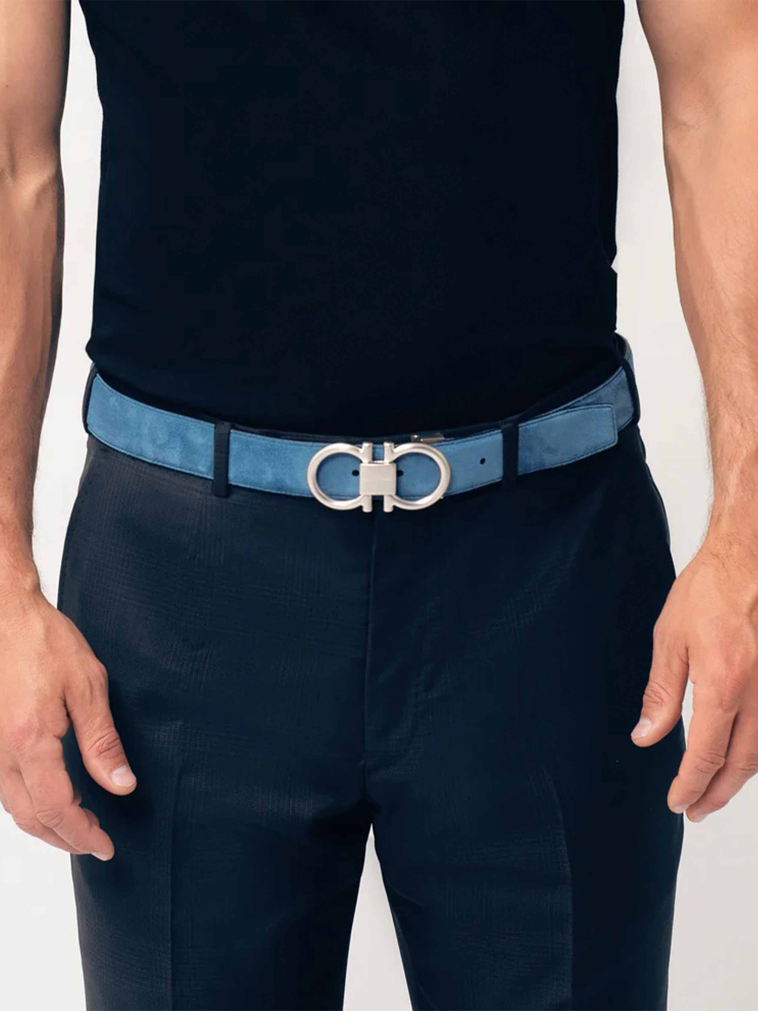 • Ferragamo Reversible Leather Gancini Belt. This reversible, adjustable calfskin leather belt features a detachable ruthenium-finished Gancini buckle, combining a soft, hammered texture with sophisticated style for a personalized fit.