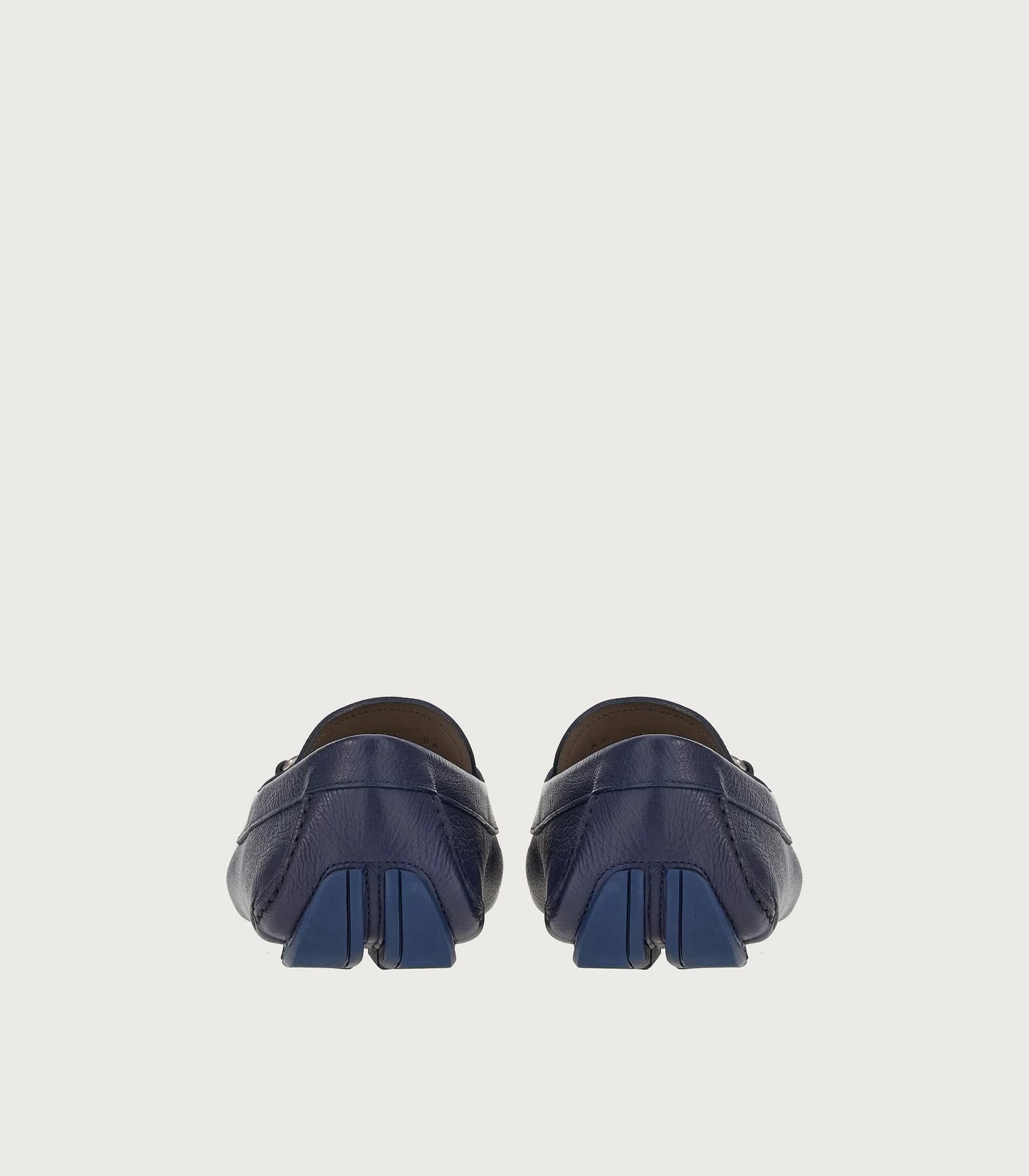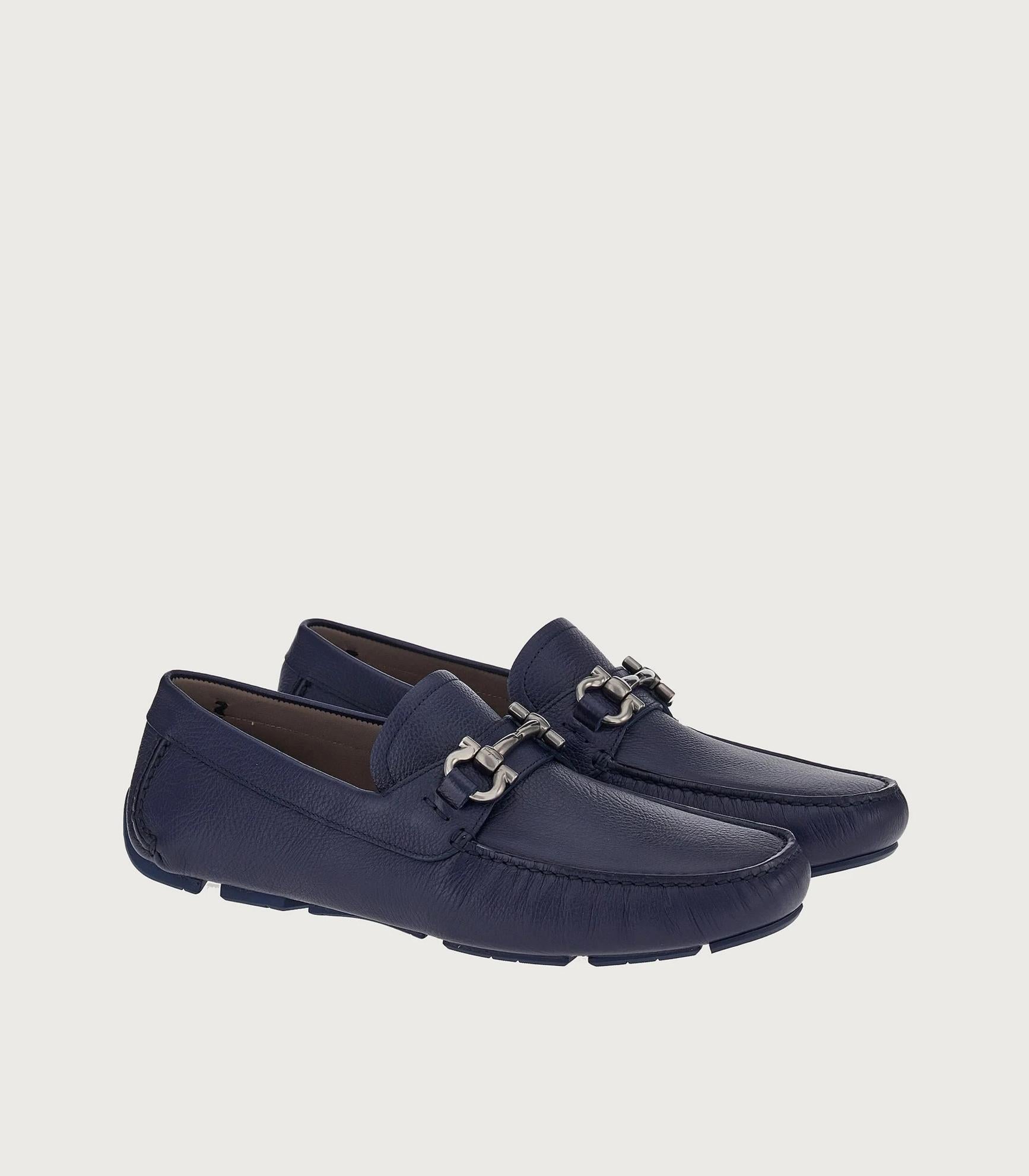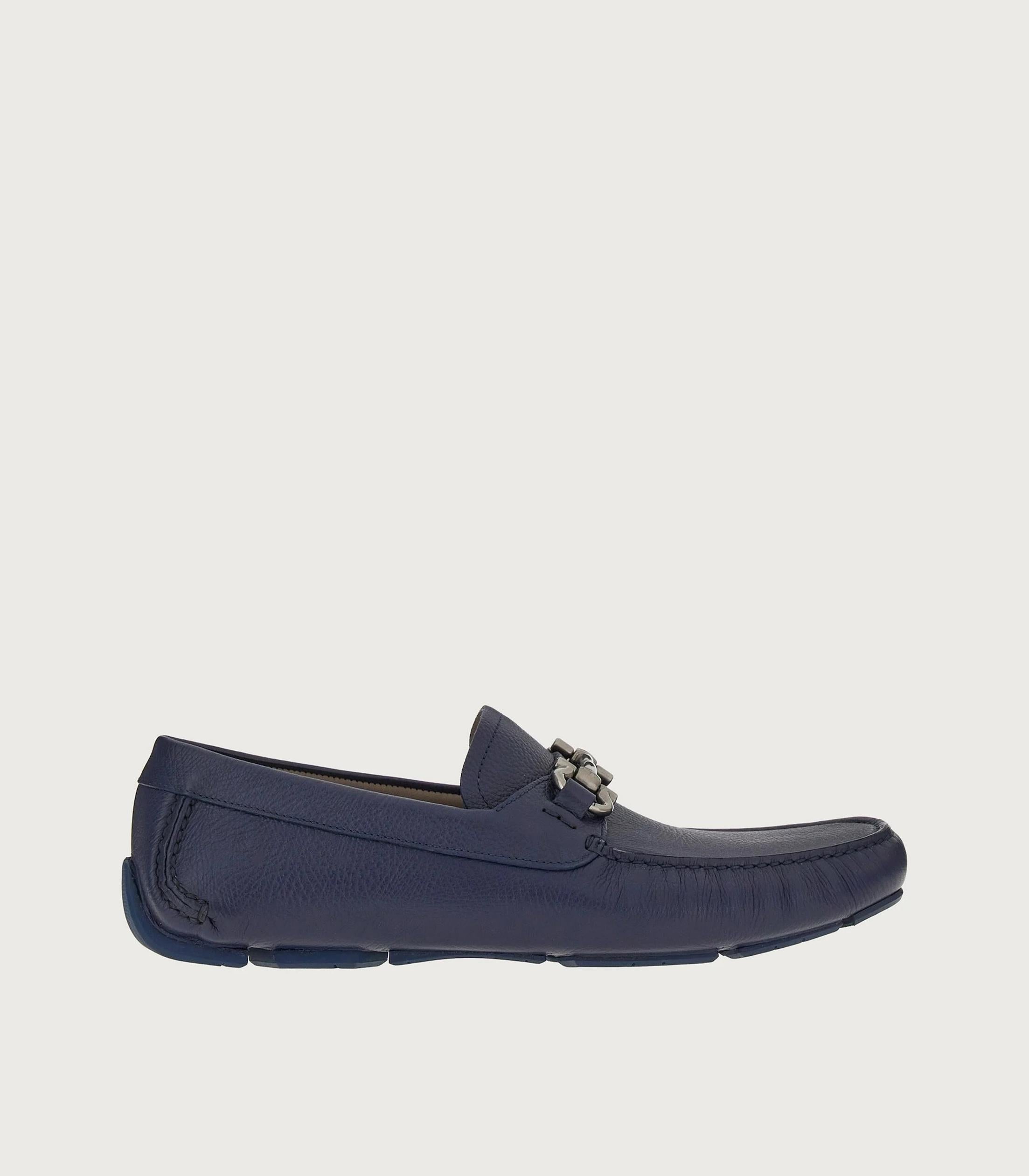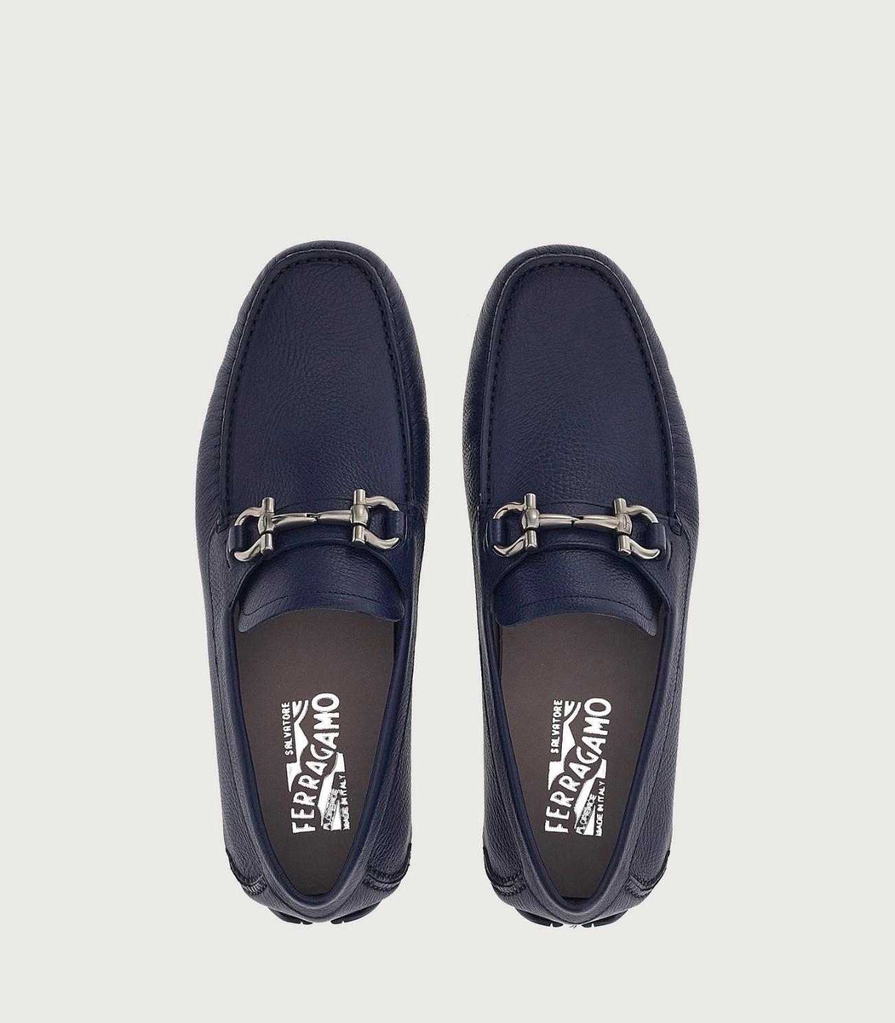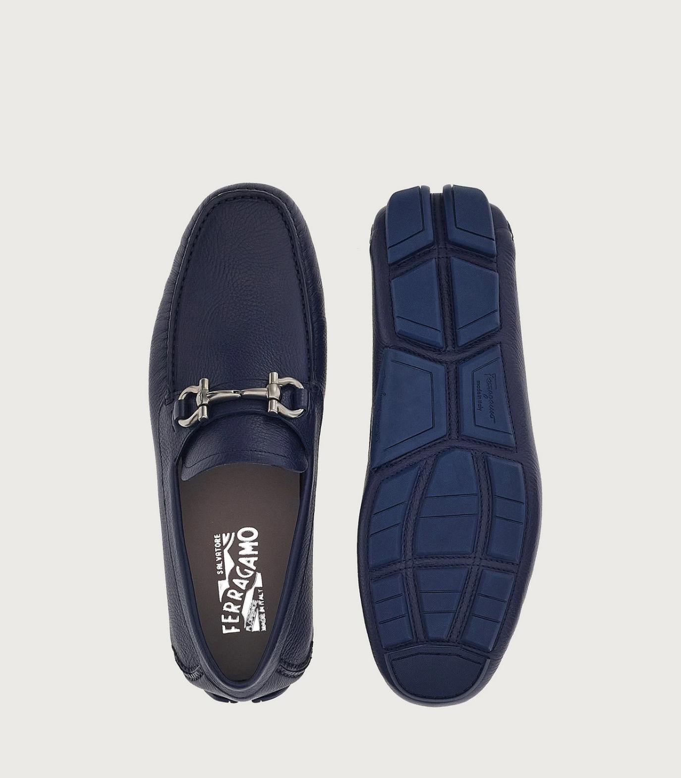 • Casual yet refined, this driver loafer is crafted from naturally textured calf leather and velvety nubuck, adding depth and dimension to the sleek, rounded shape. It's finished with apron-toe seams, a lacquered Gancini buckle across the instep, and a rubber sole with custom tread. The tubular construction method, which involves meticulous hand-stitching and assembly, ensures a flexible and lightweight silhouette.