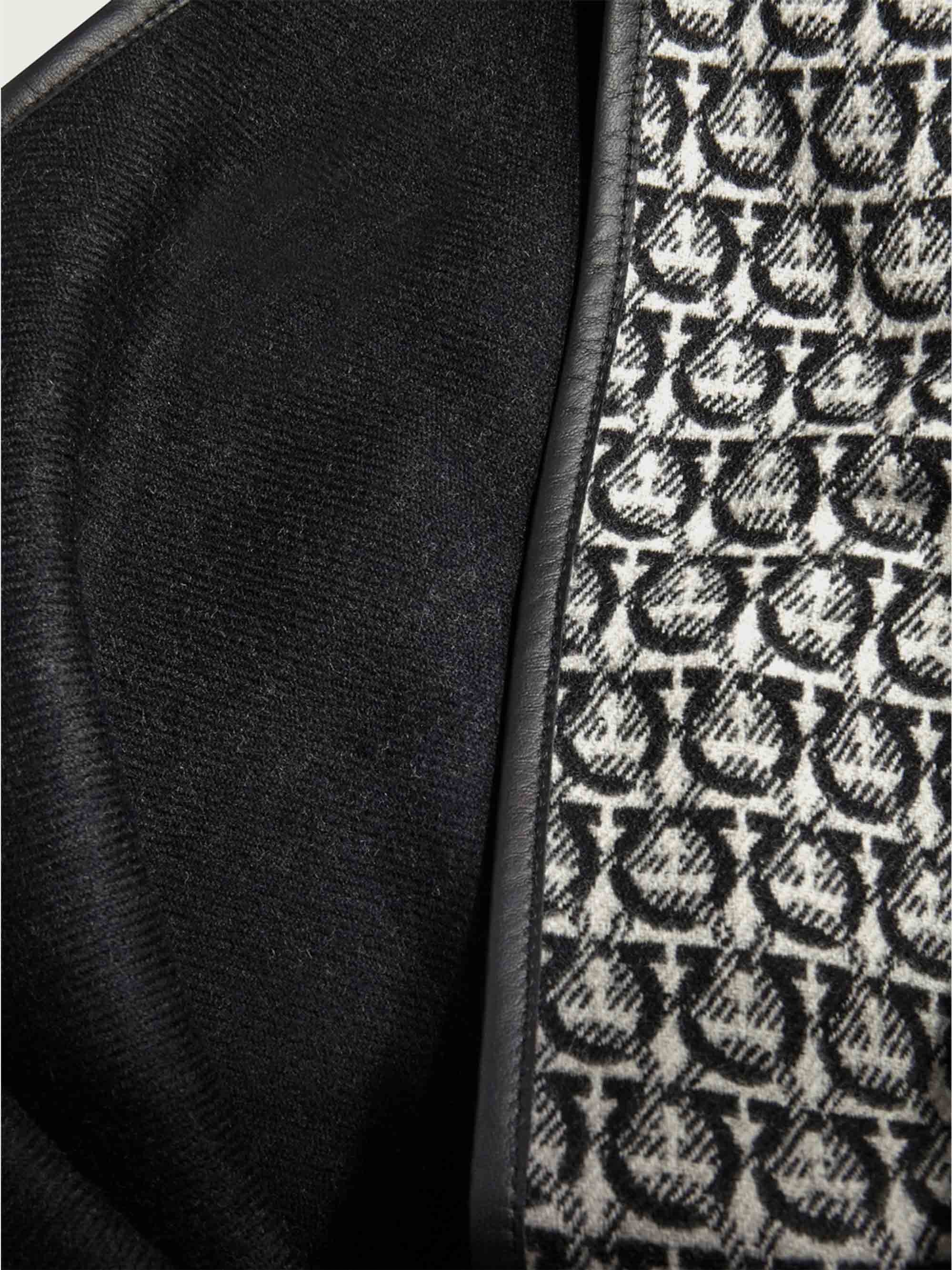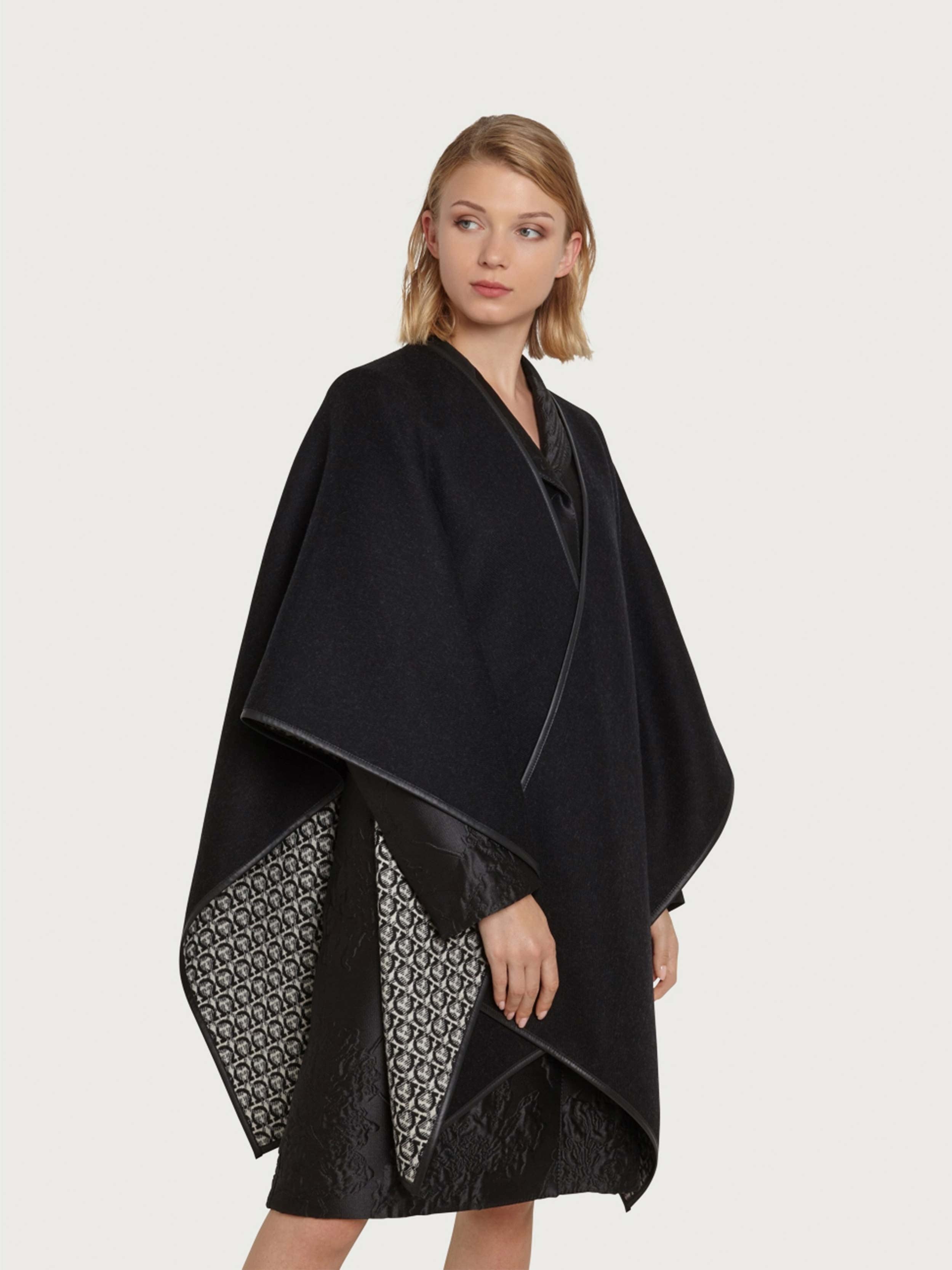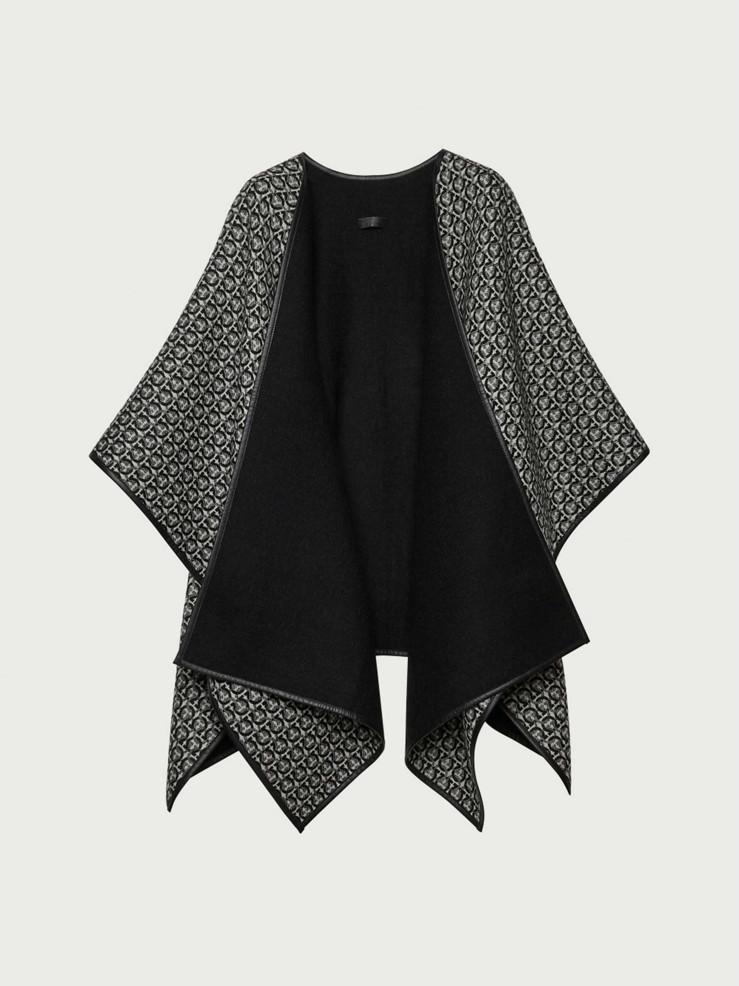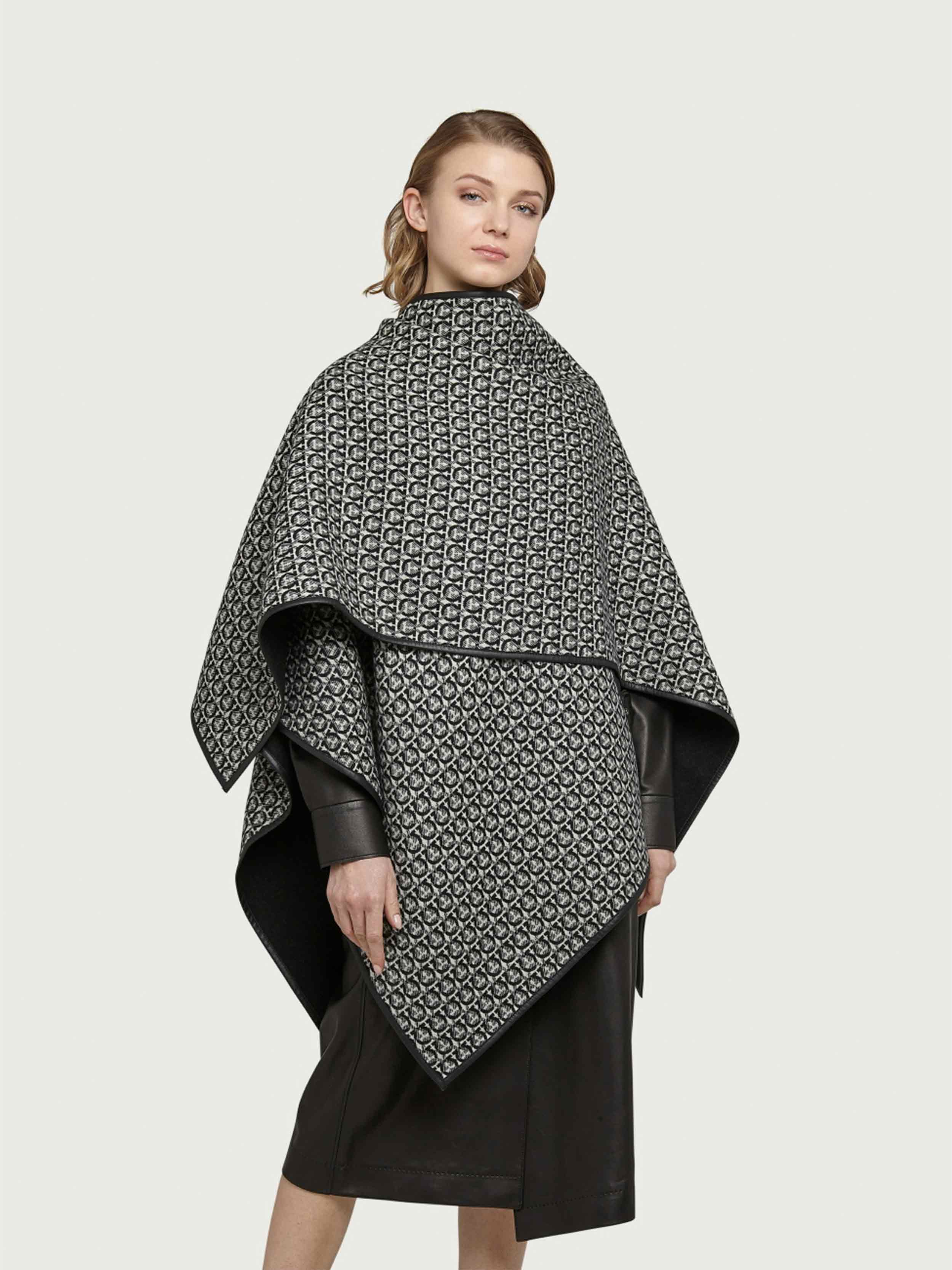 • Elegant, feminine, iconic. This wool cape combines the Gancini pattern with precious leather details, for a contemporary and exclusive look. Wear over a suit or with a casual outfit; it is a versatile accessory with a timeless style.