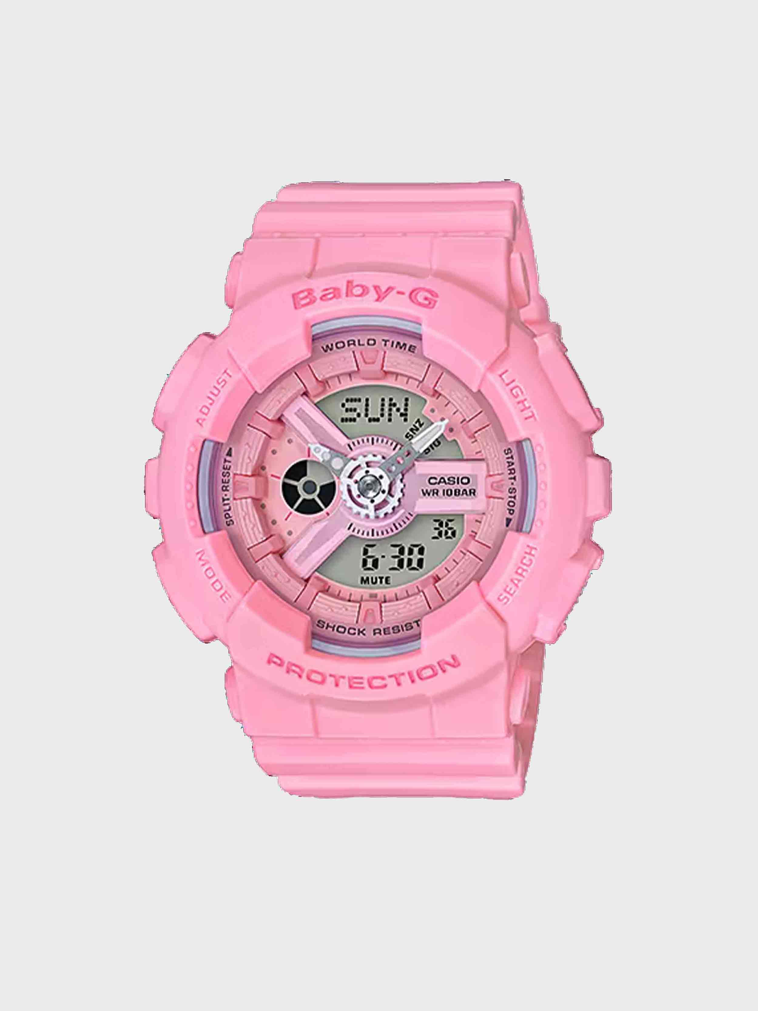 • This model is smaller and thinner to fit a feminine wrist while retaining the coolness of G-SHOCK. The three-dimensionally arranged indices are painted with a glittering, metallic coat for a refined texture. This gives the watch a sharp and energetic impression. The side buttons are made easy to press and are thus more practical. The BABY-G, a watch with a complex mechanical dial that gives it personality and looks great on the street fashion scene.