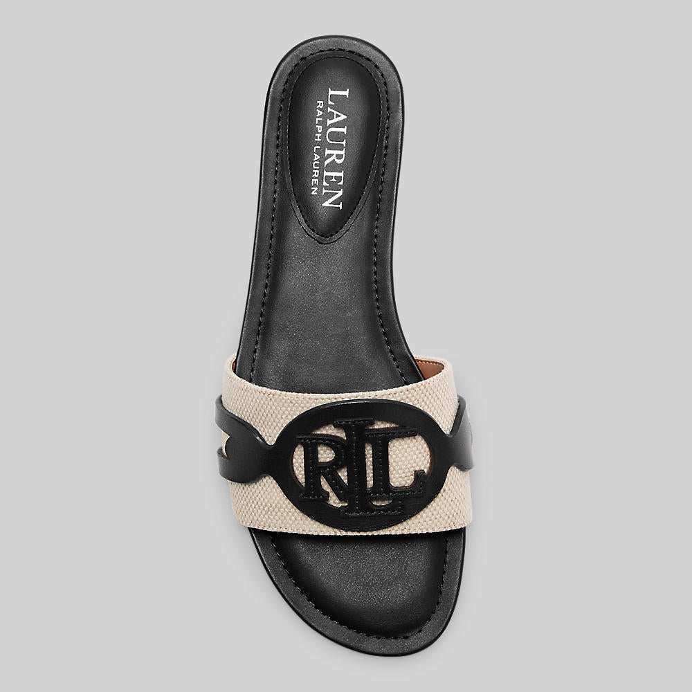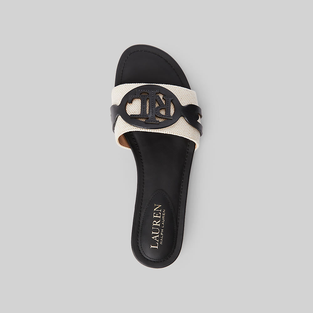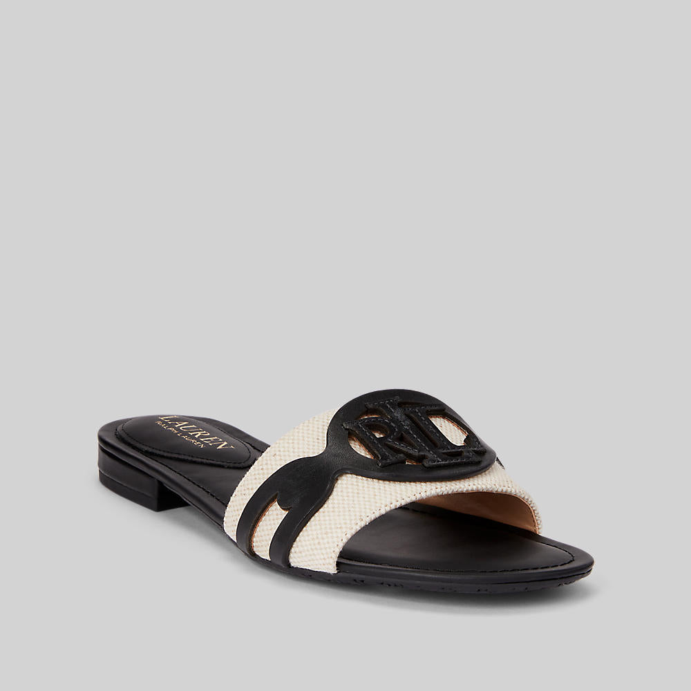 • An oversize “LRL” logo crafted with supple leather sits atop the durable canvas vamp of this slide sandal, which is designed with a slight heel and a faux leather–lined padded insole for a comfortable fit.