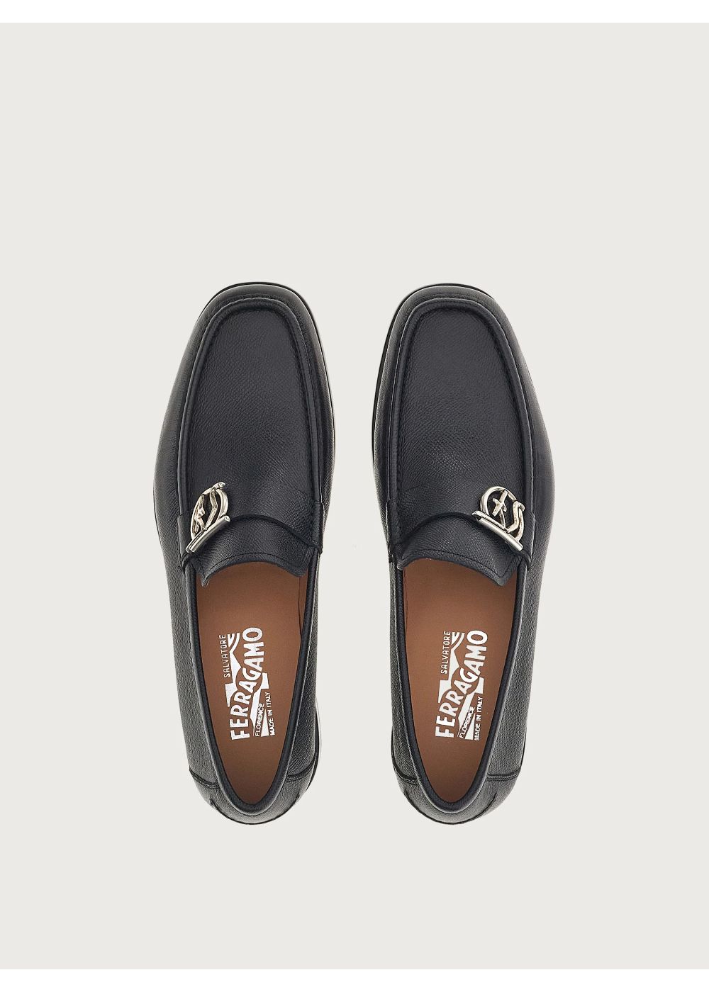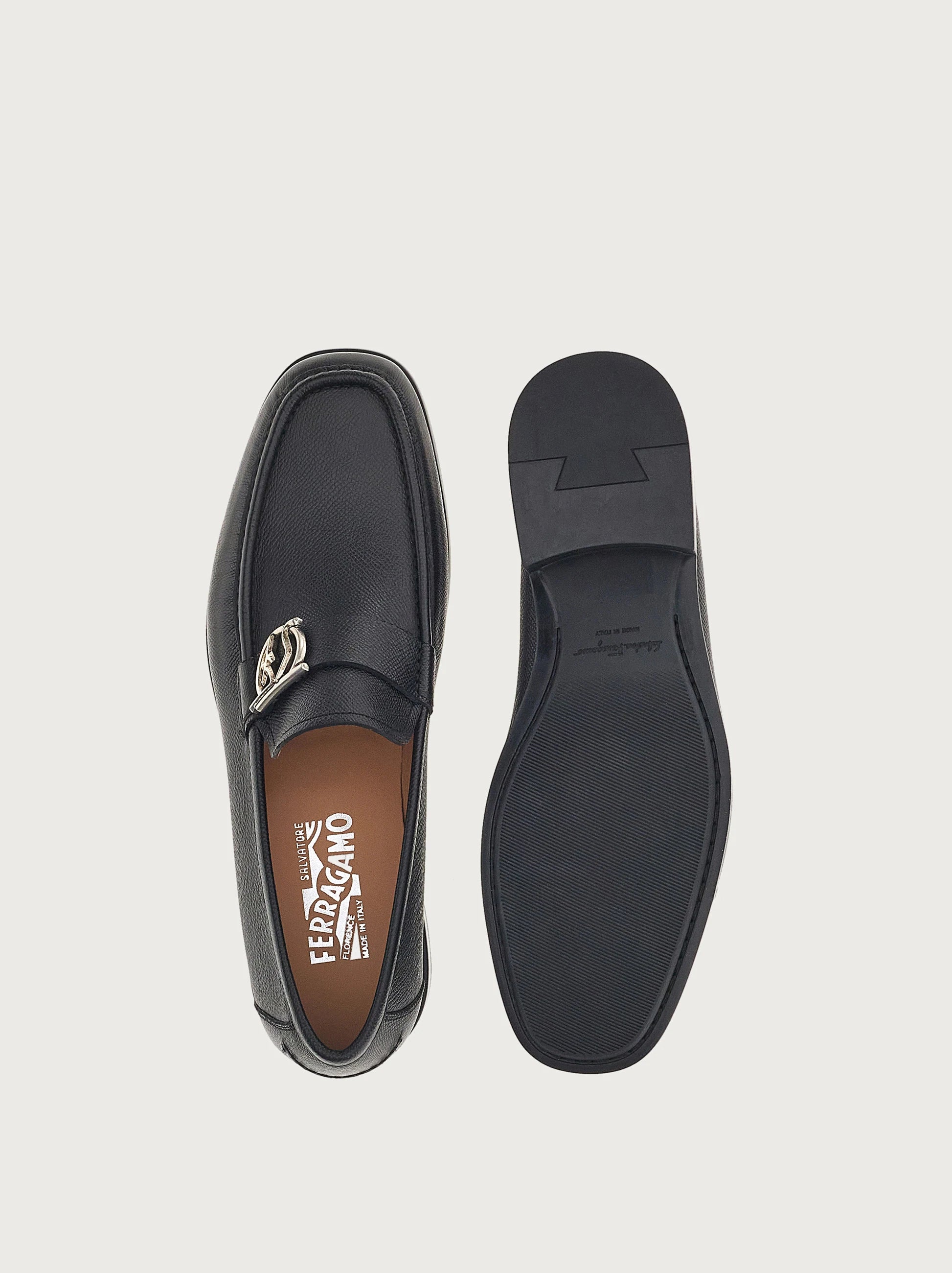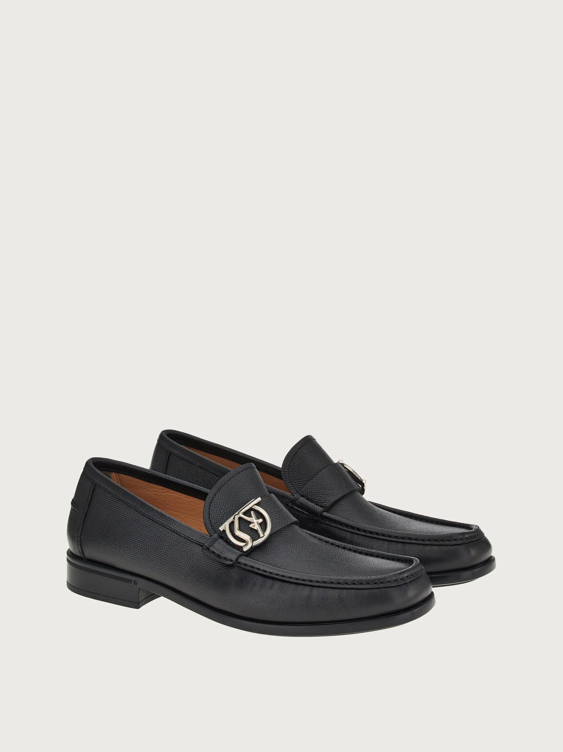 • Presented with the distinctive Salvatore Ferragamo silhouette, these Gancini moccasins are made in Italy from hammered calf leather adorned with the signature Gancini buckle with a SF outline to add some artistic flair.