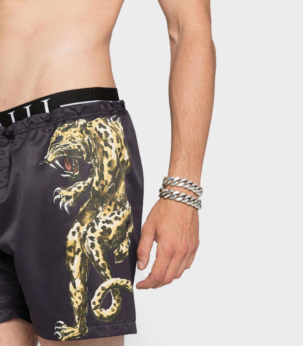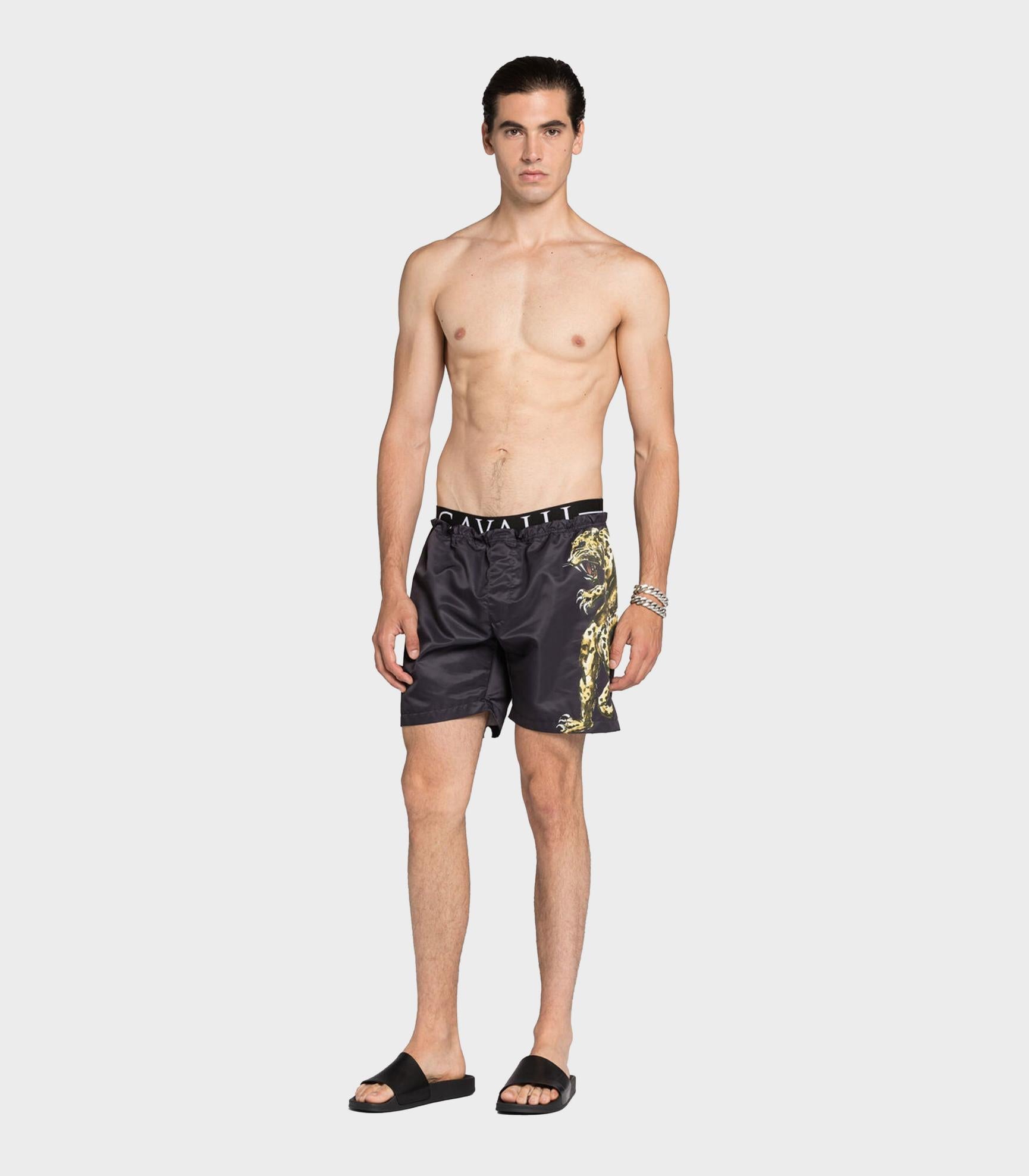 • Jaguar spots take these swim shorts into statement territory. In a nod to Cavalli's signature logomania they're topped with a monikered waistband.