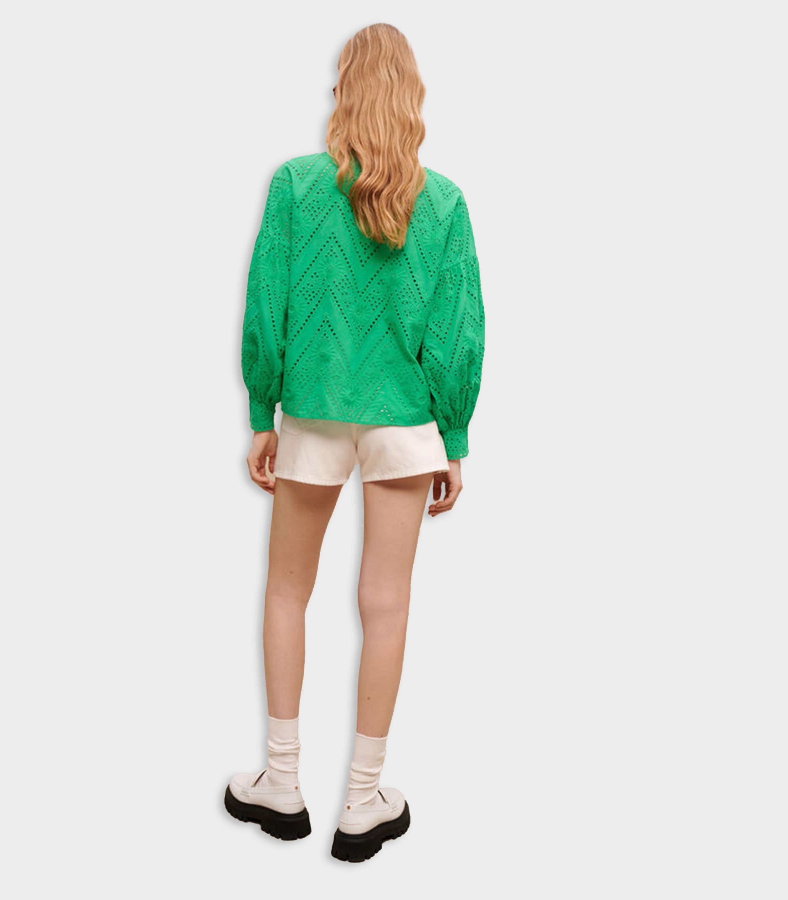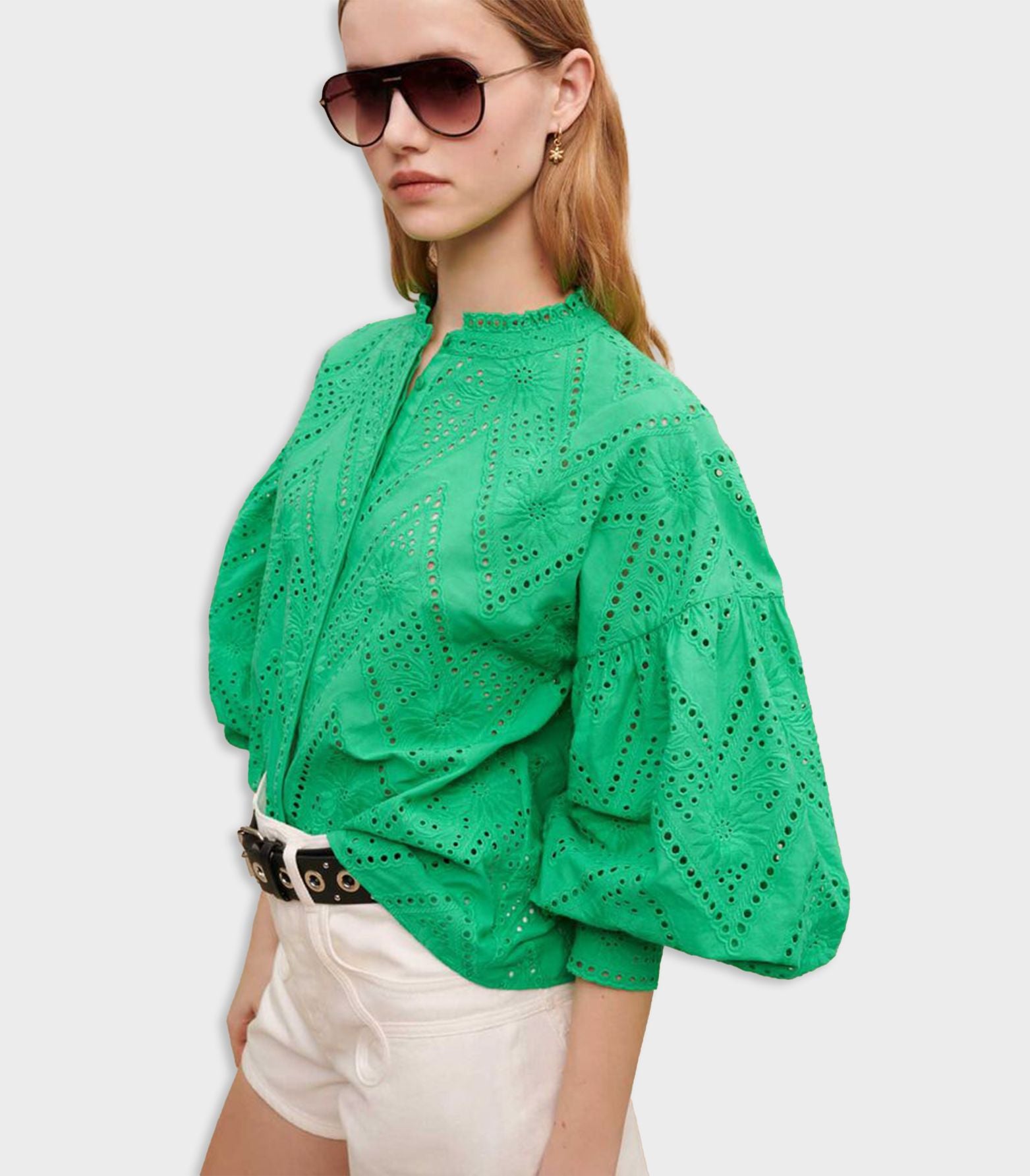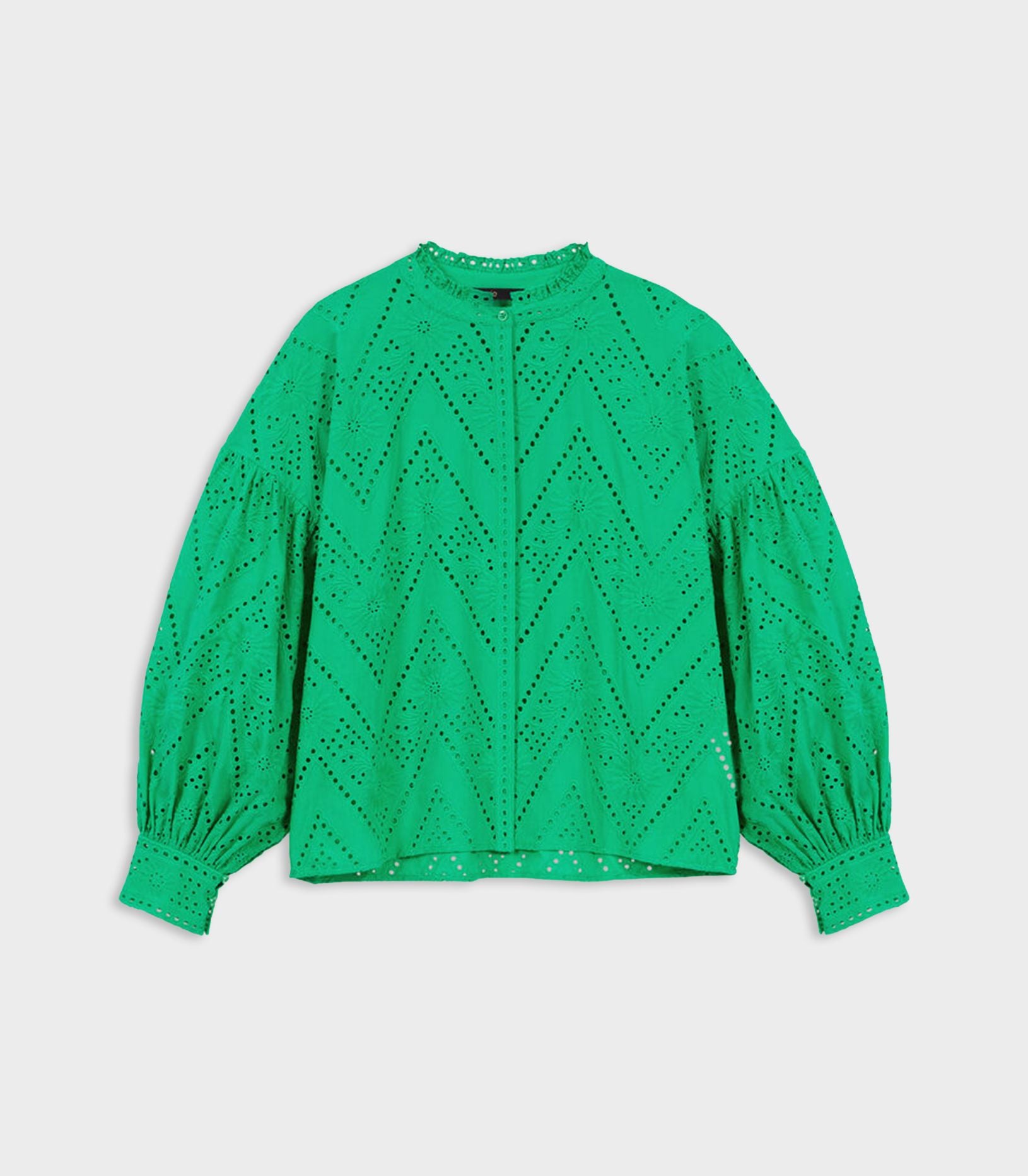 • Delicately embroidered with openwork motifs, this shirt features a slight mock neck, long volume sleeves and hidden button placket fastening. Pair it with denim shorts or a floaty skirt for an airy look.