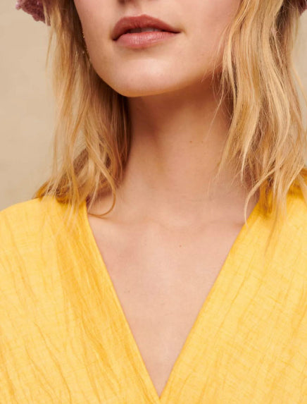 • Its slightly asymmetric flared skirt and gathered, puffed three-quarter sleeves create a pretty voluminous effect and are perfect to enhance and structure your silhouette.