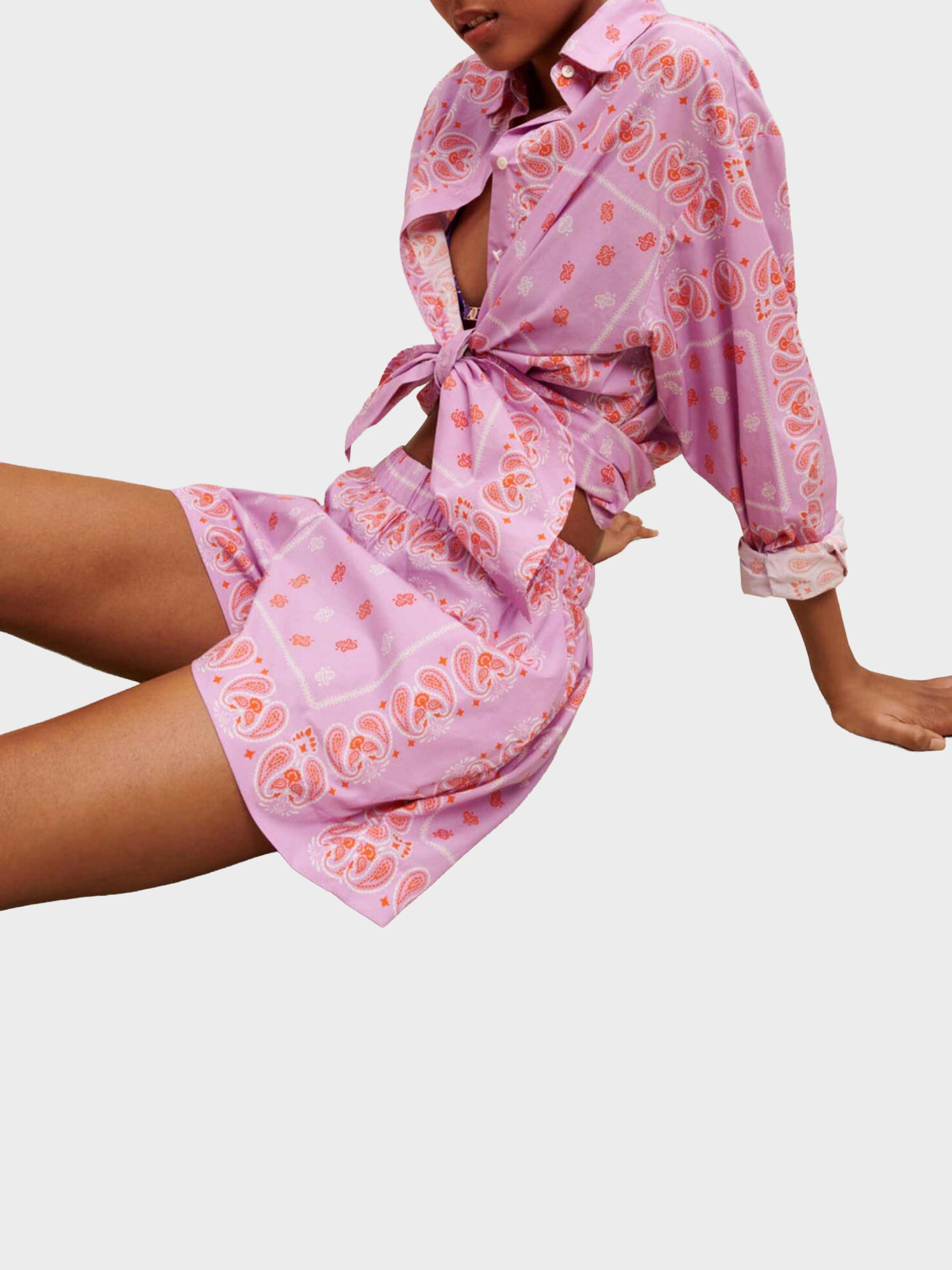 • The essential bandana print appears in orange on these lightweight cotton shorts, which you can wear with the matching shirt. They have an elasticated waist and will go with all your summer looks. Slip them on over swimwear and wear them with the matching shirt for a paisley total look. Accentuate your summer look by adding statement accessories, such as a fringed signature bag, rhinestone sandals, or handcrafted jewellery from the collaboration between Maje and éliou.