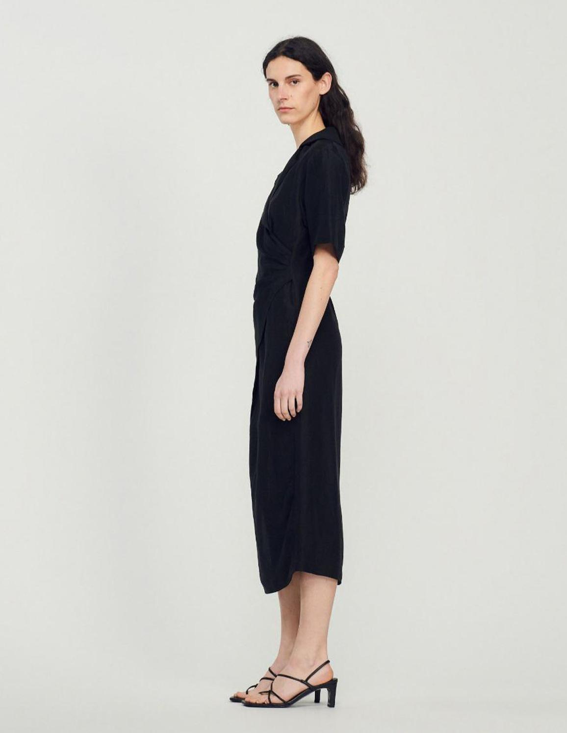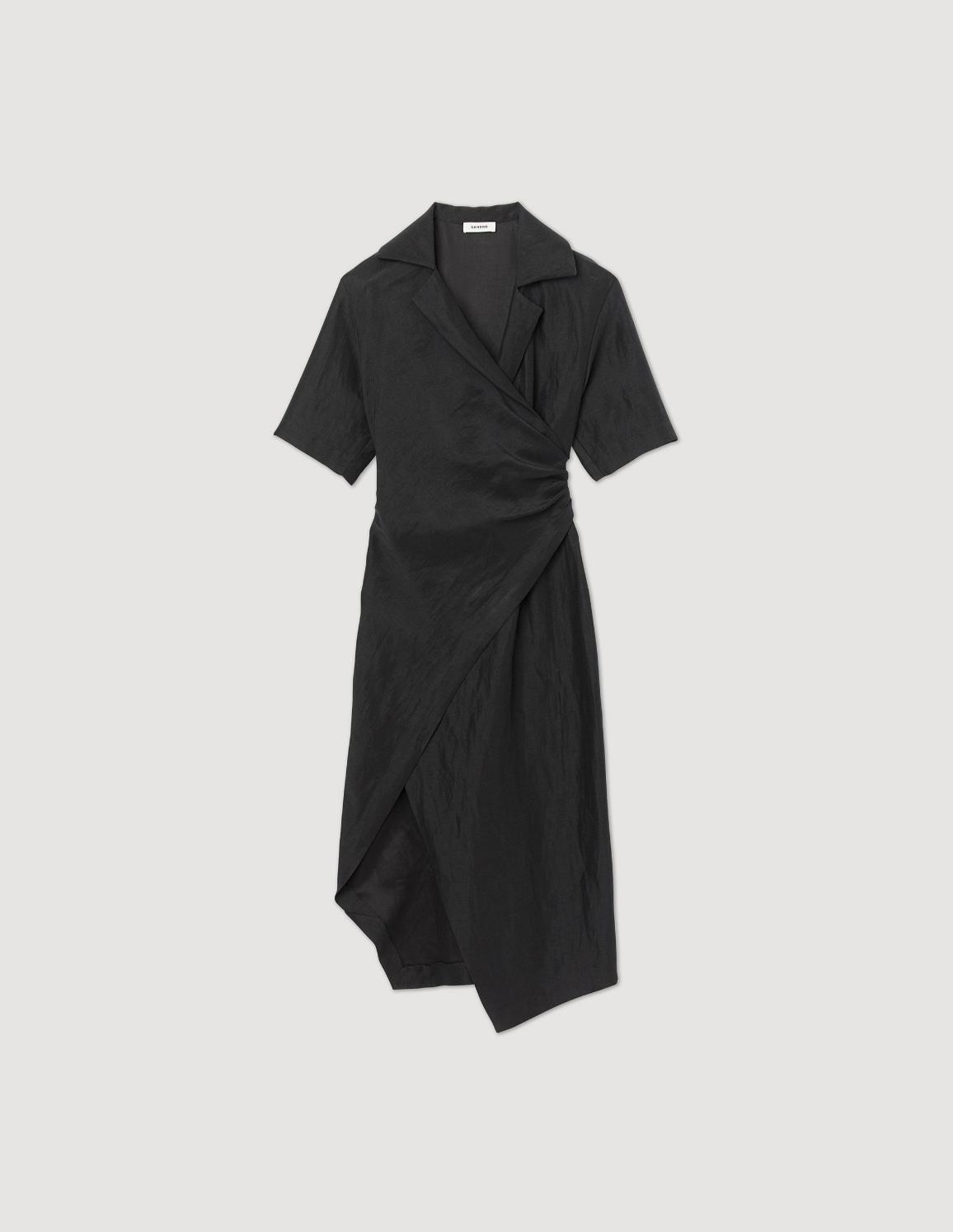 • Draped asymmetric midi dress with a front slit, a crossover V-neck, a tailored collar, short sleeves, and elastic at the back.