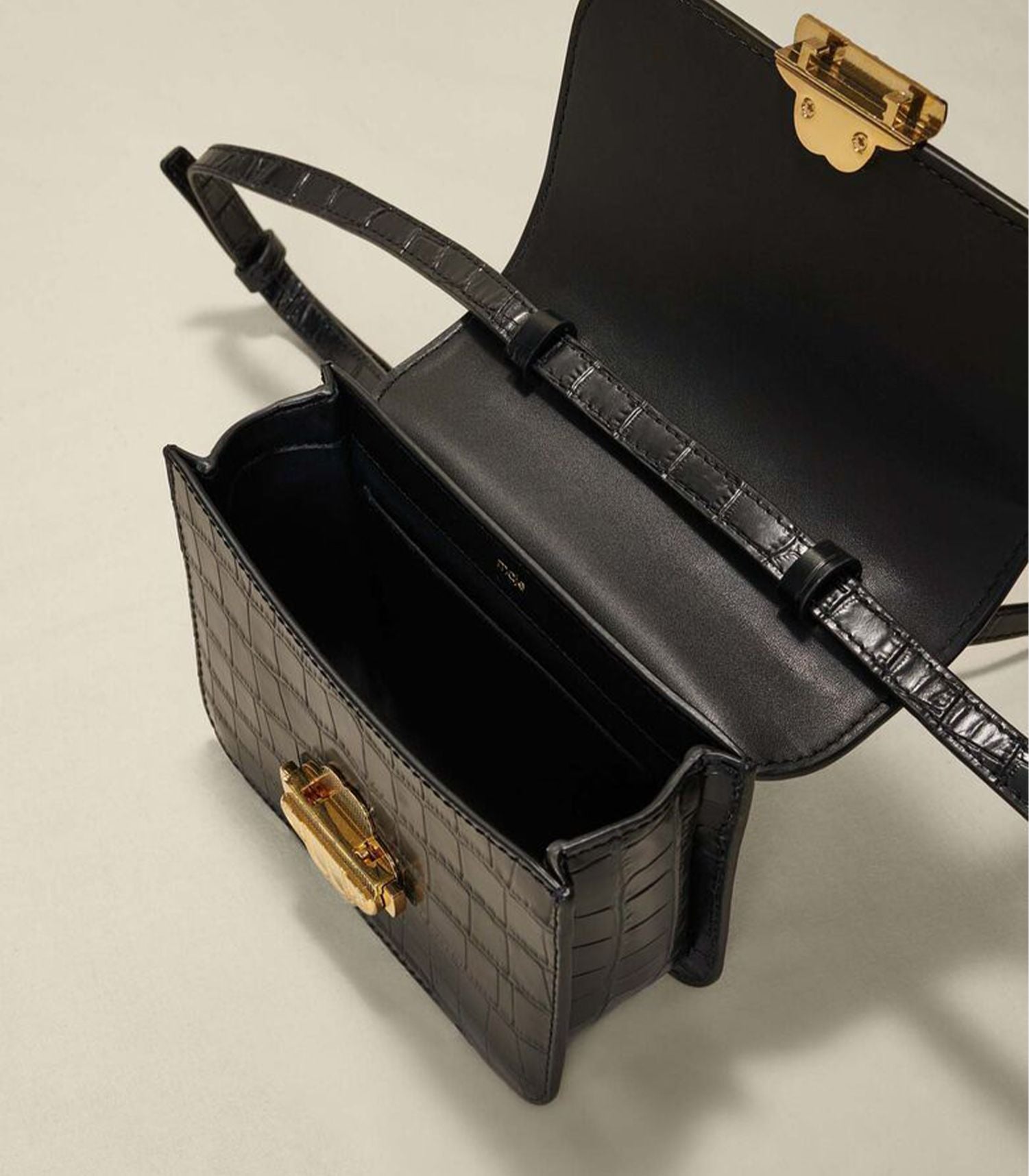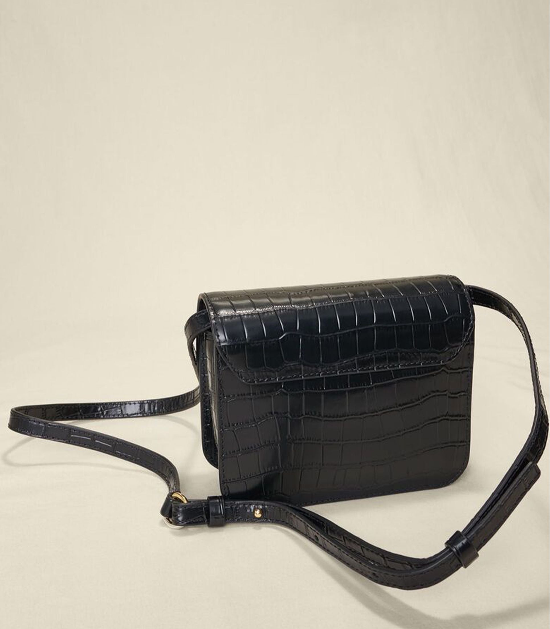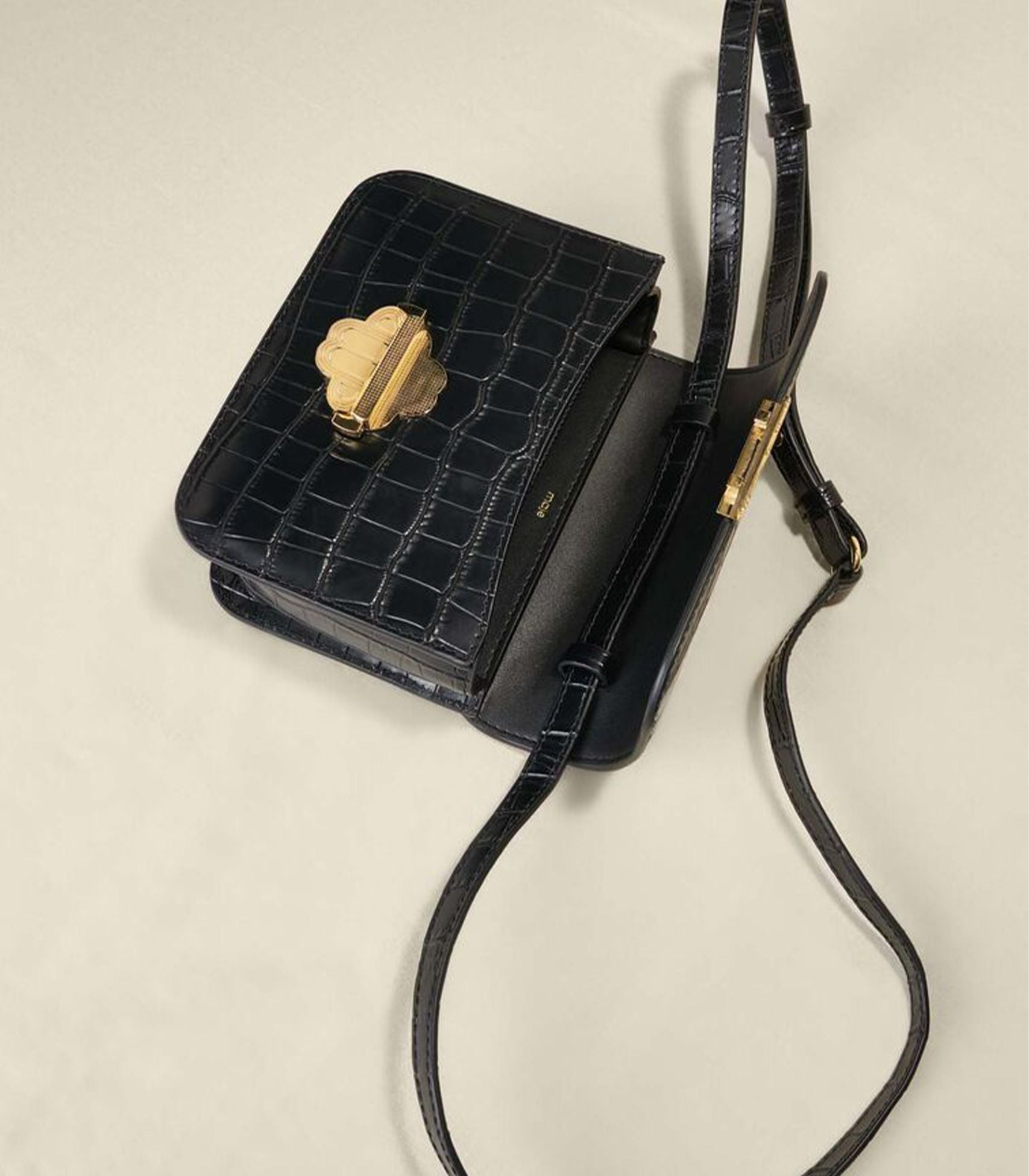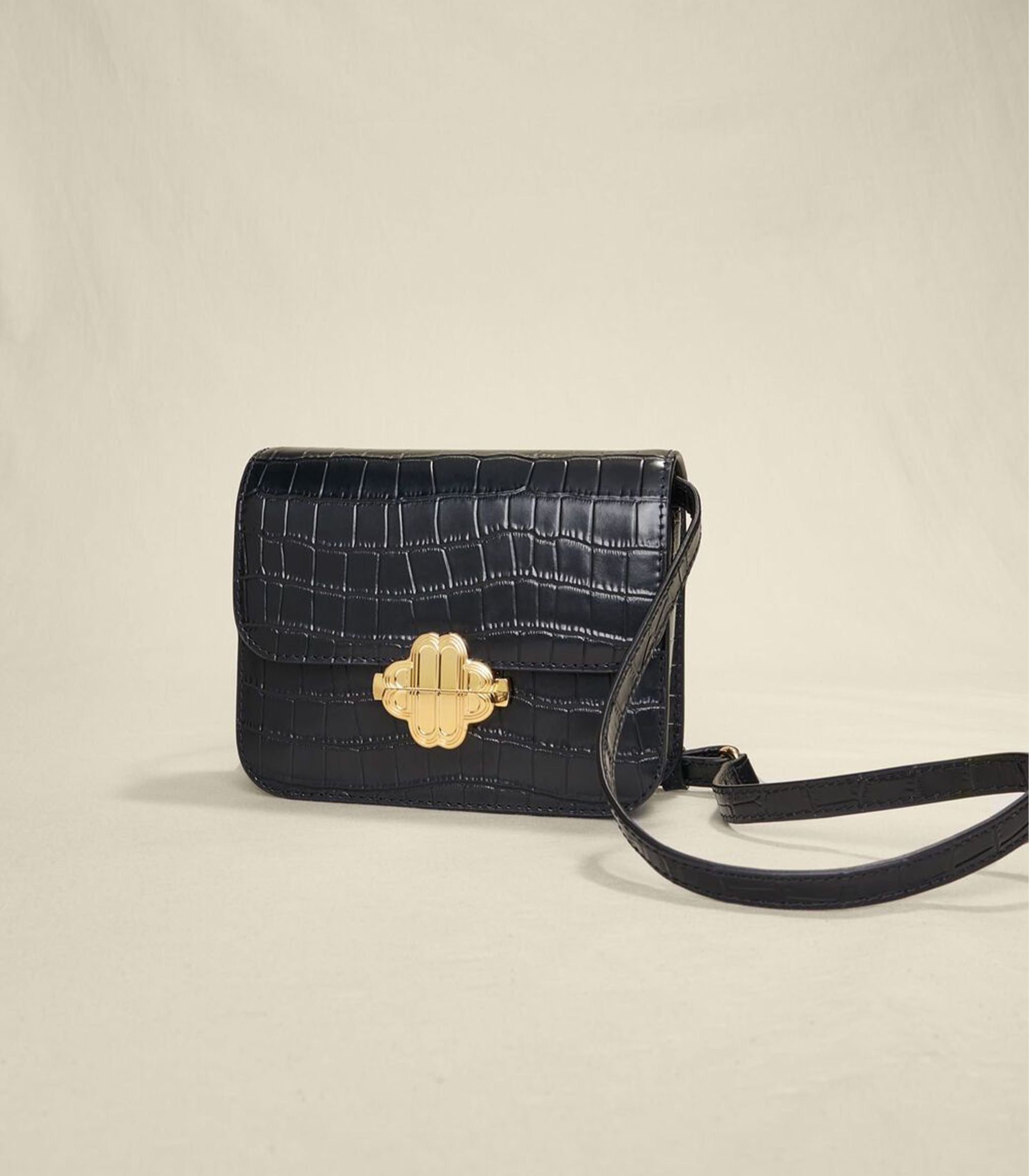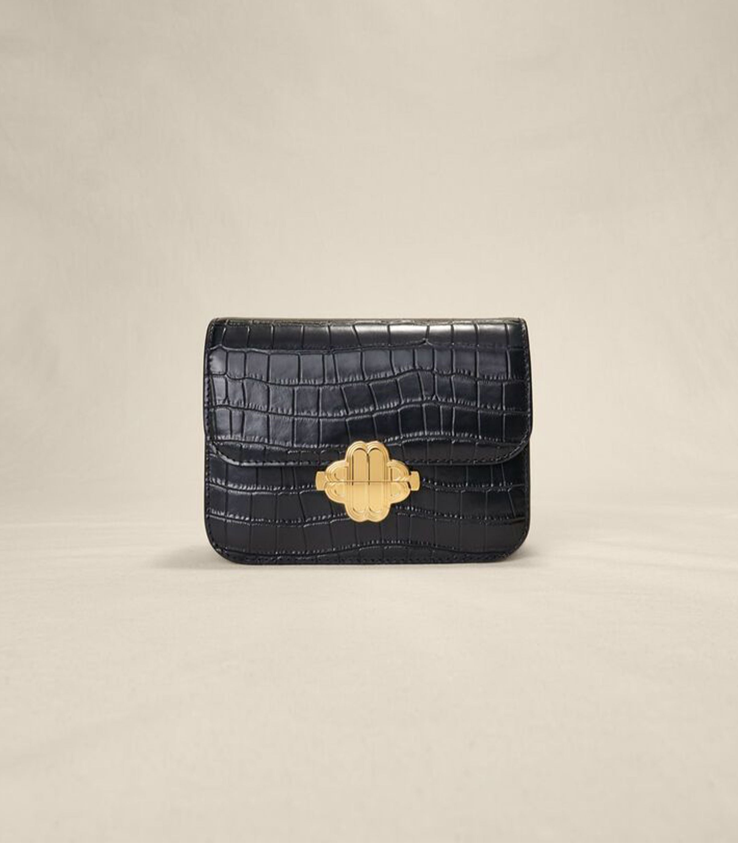 • This flap bag is available this season in croco-effect embossed leather. Adorned with a gold-tone metal Clover clasp, it is perfect for everyday wear. It has tone-on-tone cotton lining, an adjustable shoulder strap and an inside pocket.