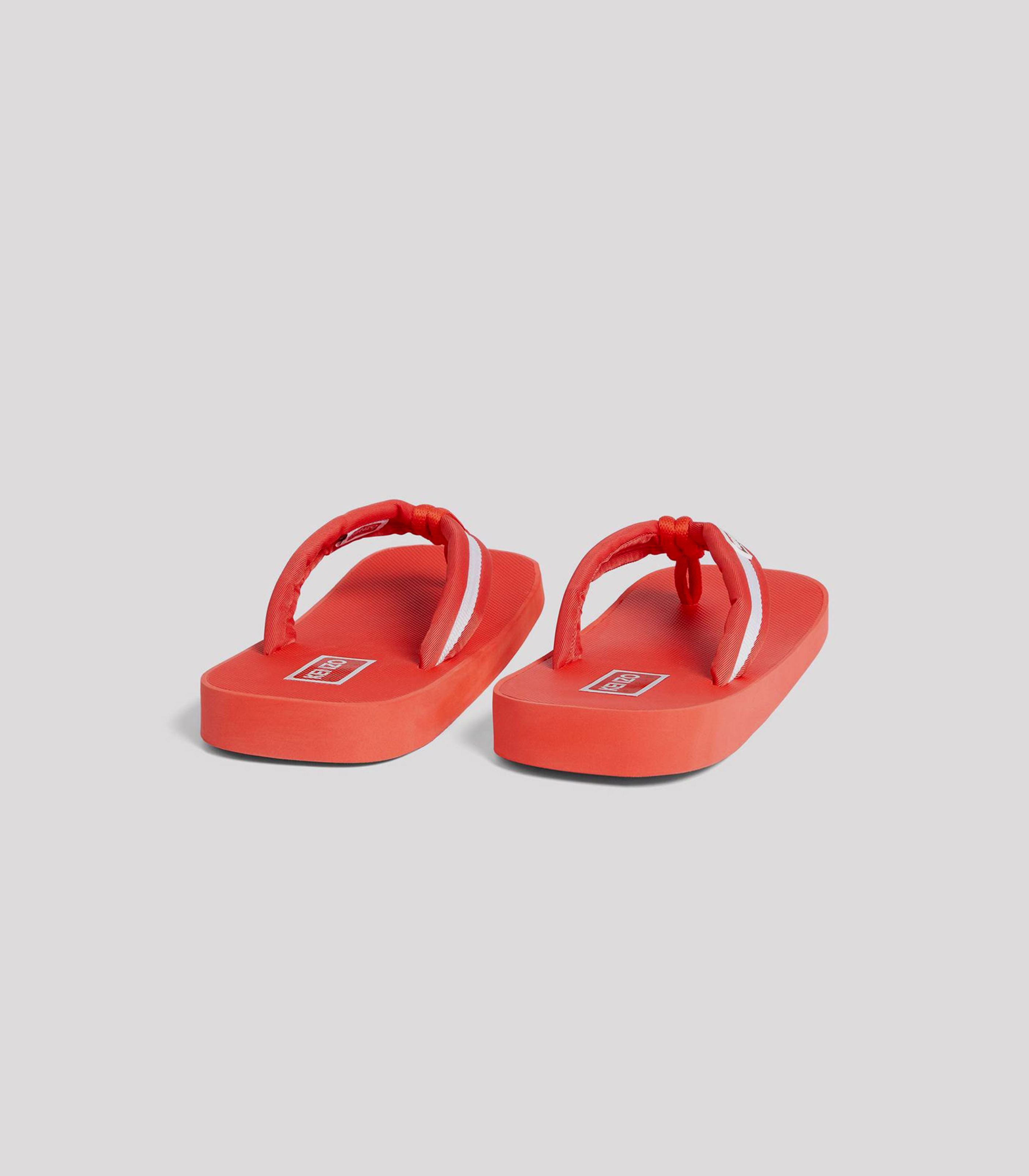 • They feature a thick rubber sole and a striped thong strap with a logo patch at the side.