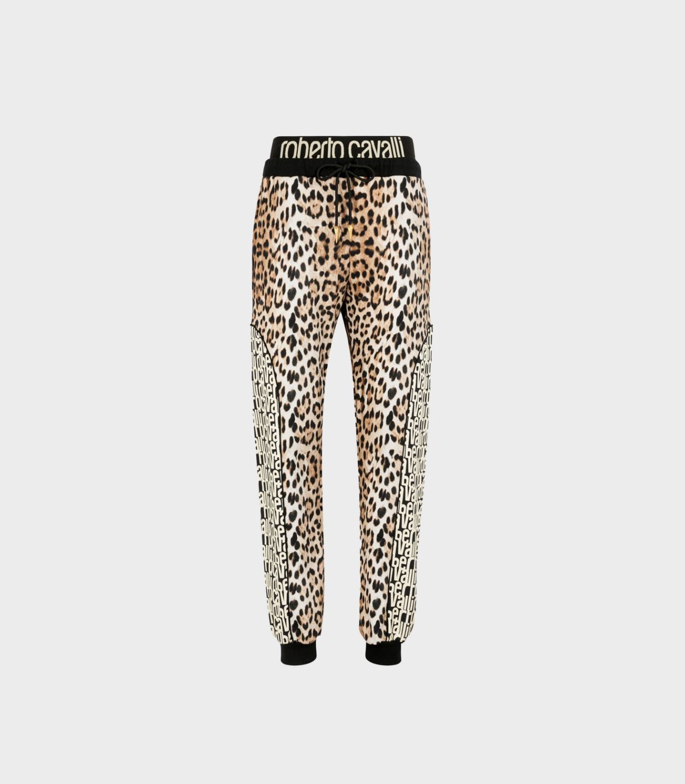 • These leopard-print track pants are an animated take on athleisure; their clashing monogram side panels showcase Cavalli's confident aesthetic. The waistband nods to layered boxing shorts while signature Tiger Tooth pendants provide animal energy.