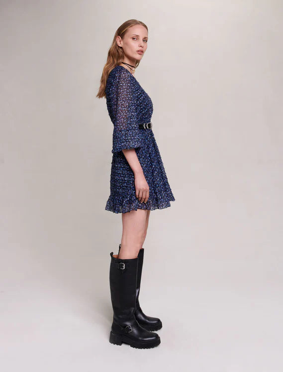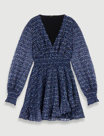 • This dress in delicately sparkling stretch fabric has a close• fitting cut, long full sleeves with tighter cuffs and a wrapover V-neck. It has long sleeves and is gathered at the waist, delicately shaping it. The skirt is lined and delicately pleated, playing with volumes for a stunning silhouette. To accessorise it, add a leather belt, cowboy boots and a choker for a rock edge.