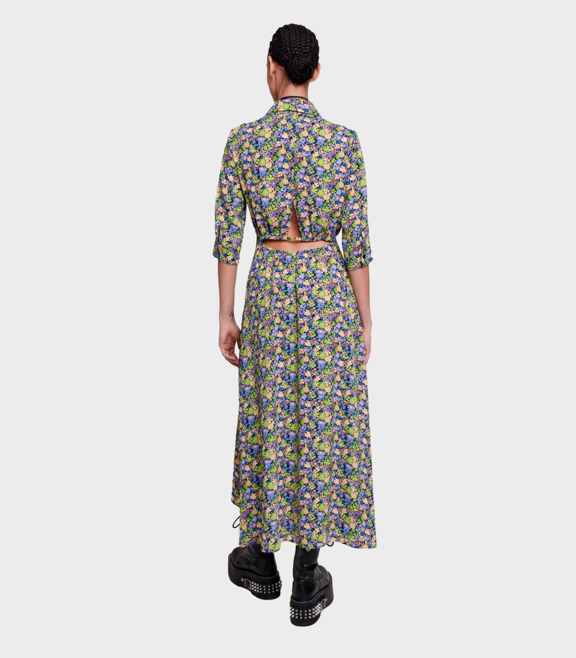 • A breath of fresh air flows through this long shirt dress in one of the season's key prints, primrose. Alongside a collar and short sleeves, it has a button fastening and a backless design with an openwork panel. Its slightly flared skirt creates an airy, fluid yet fitted silhouette.