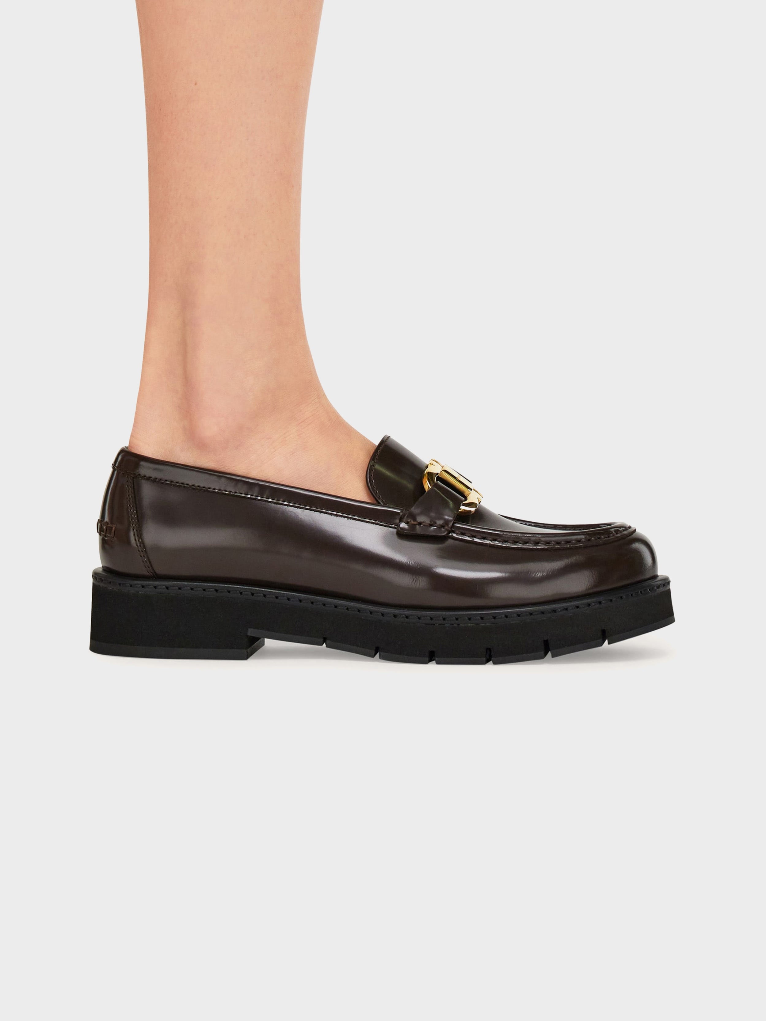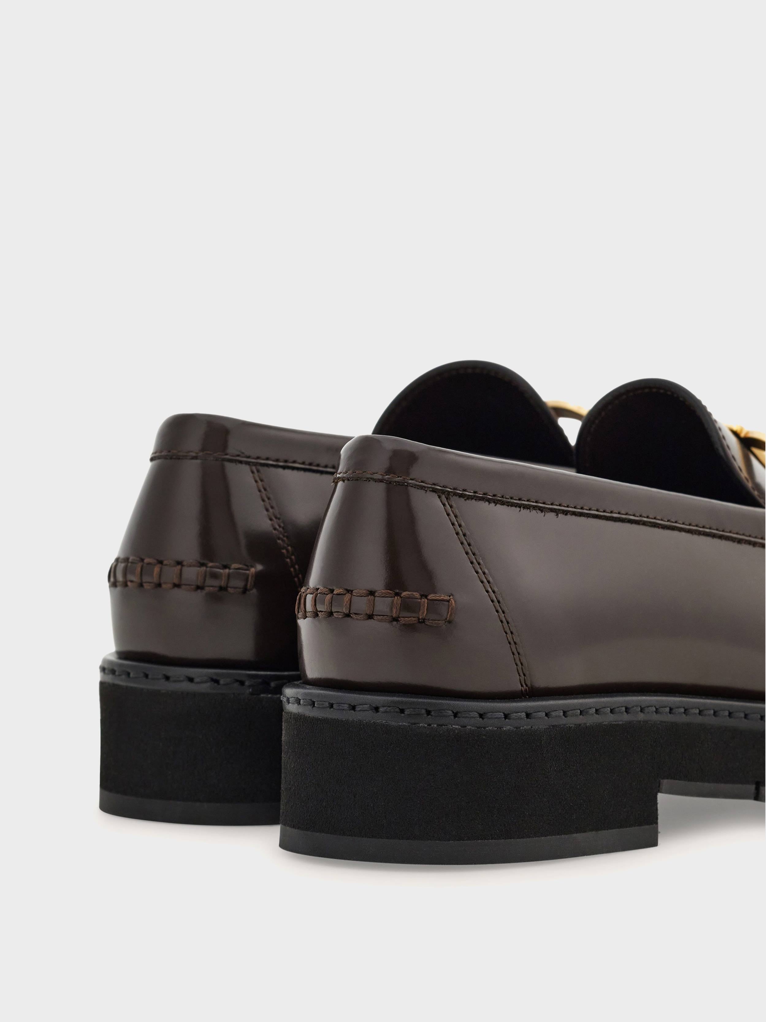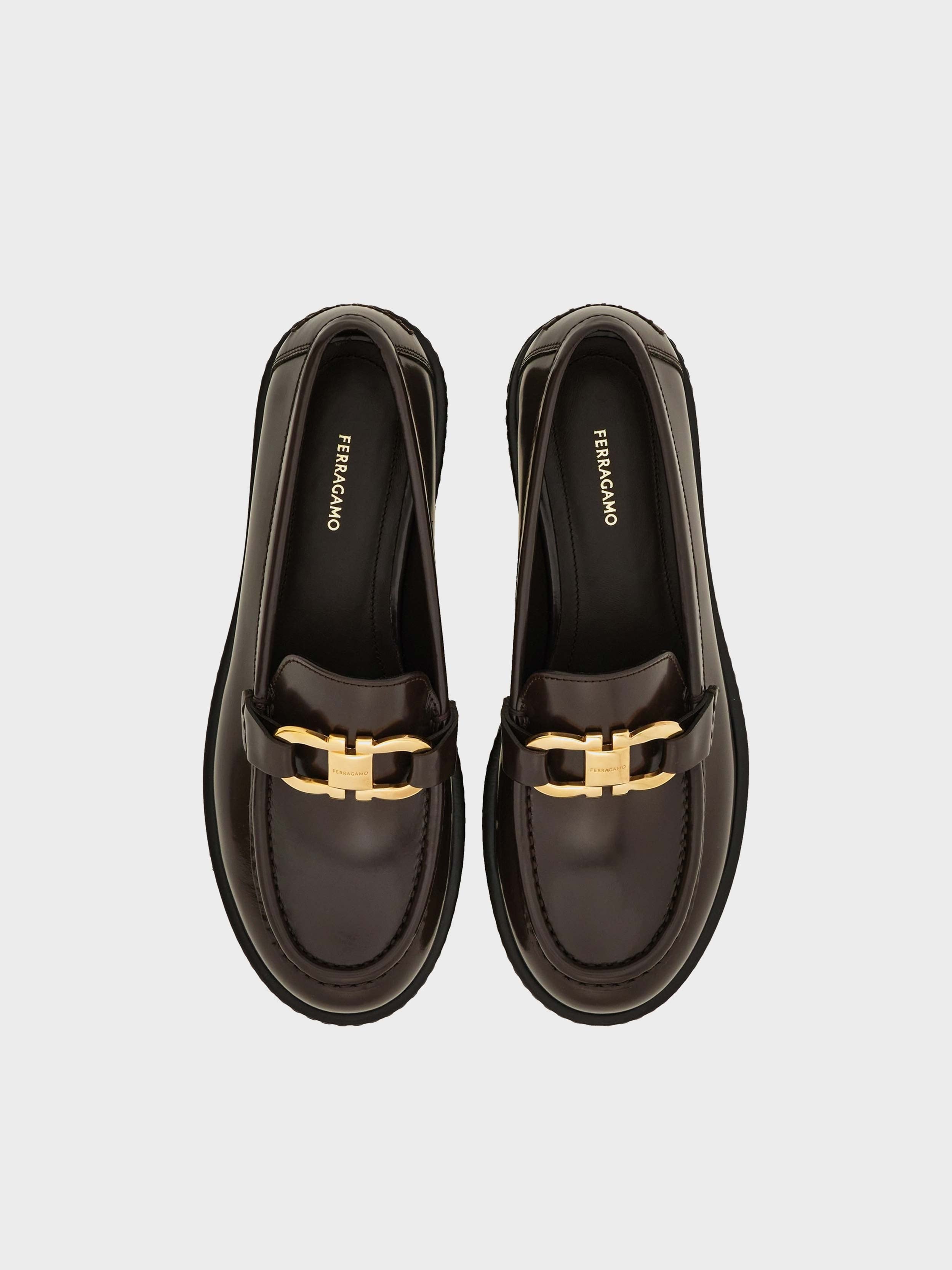 • Infused with British sensibility, this new chunky loafer is made from calf leather punctuated by stitch detailing. The soft leather upper features a golden Gancini buckle for a luxurious finish. Rubber sole with custom tread.