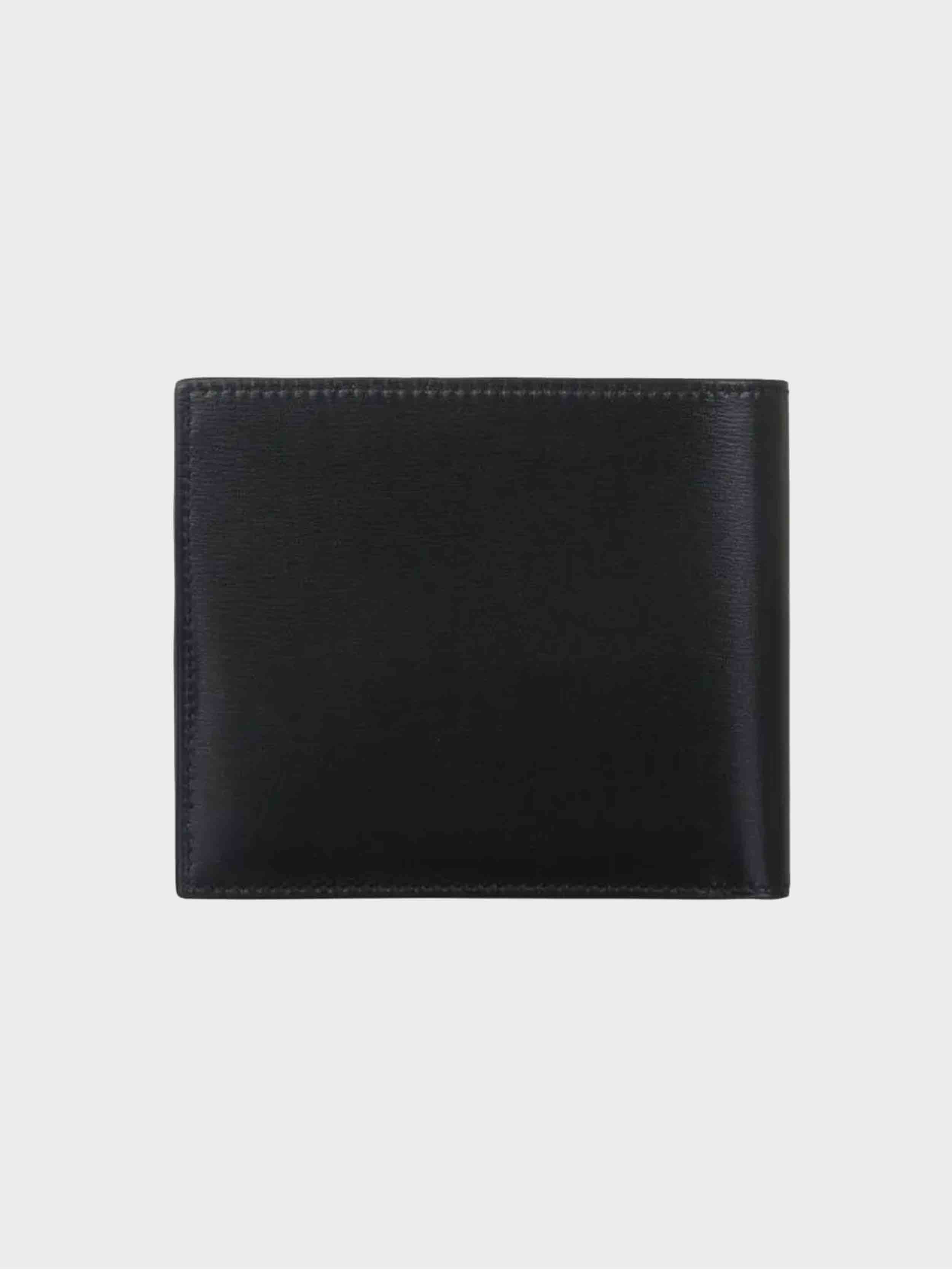 • calfskin with card slots and bill and document pockets. It features a small silver logo on the front.
