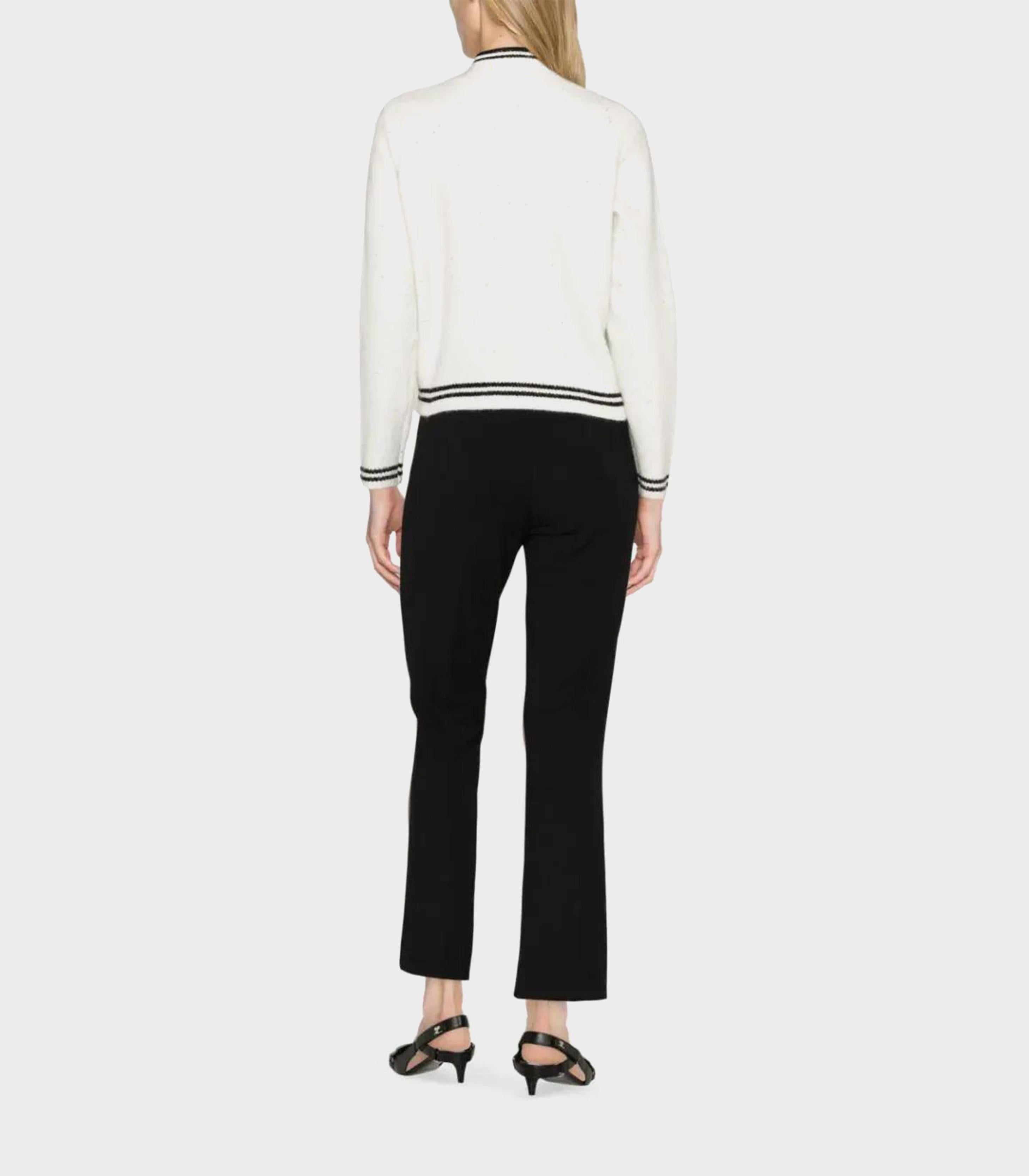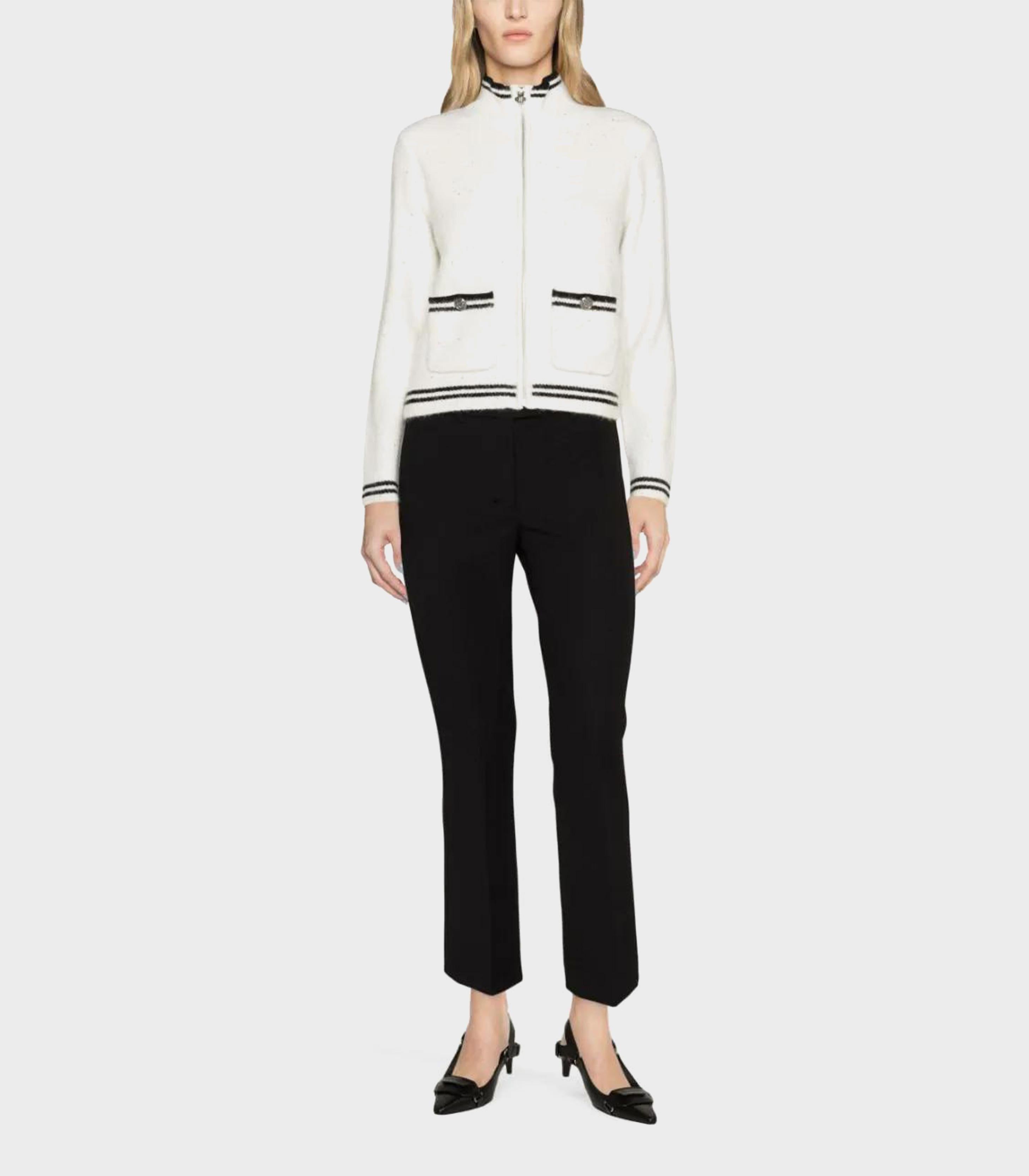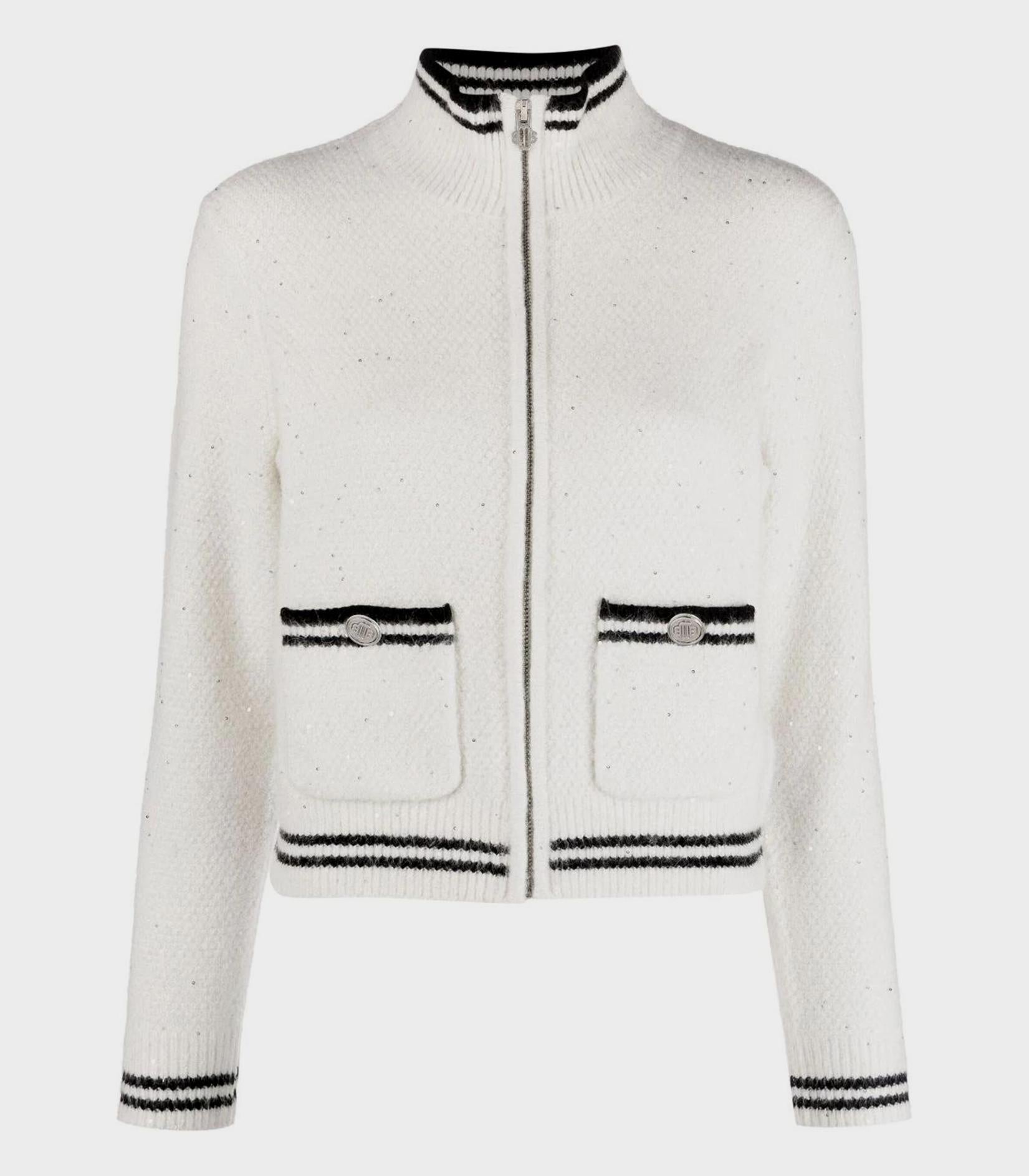 • With its long sleeves, this short, zip-up wool blend cardigan features a glittery knit with metallic threads. Whether you prefer a high or a wide neck, the zip fastening embellished with a Clover logo means you can adjust the fit to suit you. Featuring two patch pockets with gold buttons, it is embellished with sequins and ribbed hems with contrasting black stripes for a sports-chic look.