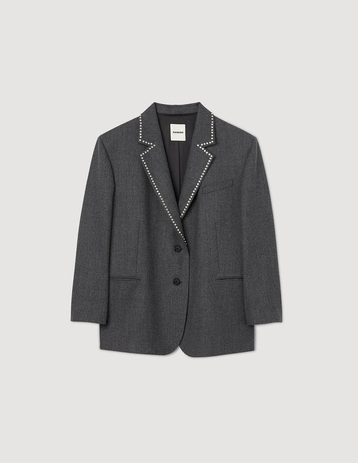 • Wool suit jacket with long sleeves and a collar embellished with rhinestones.