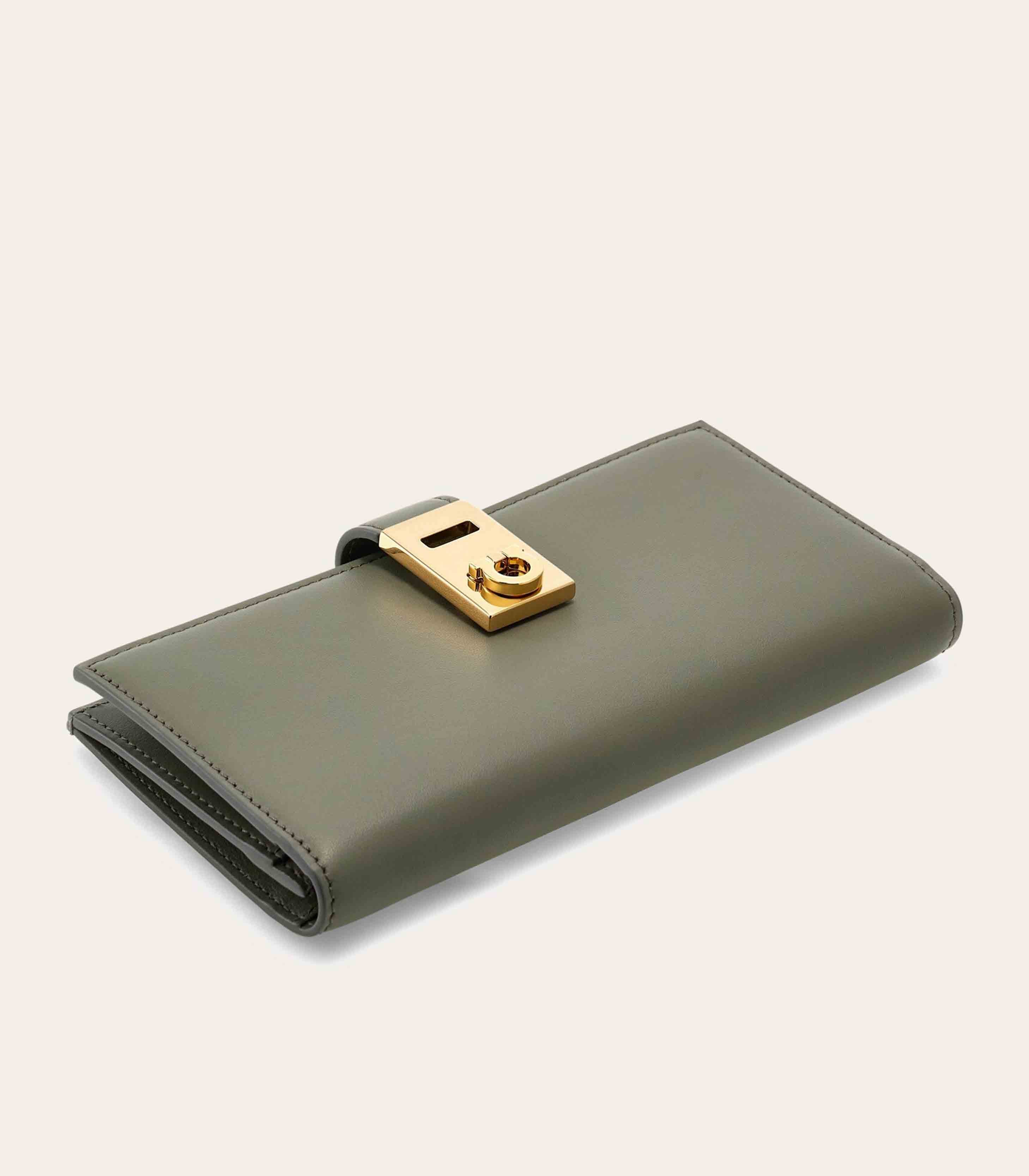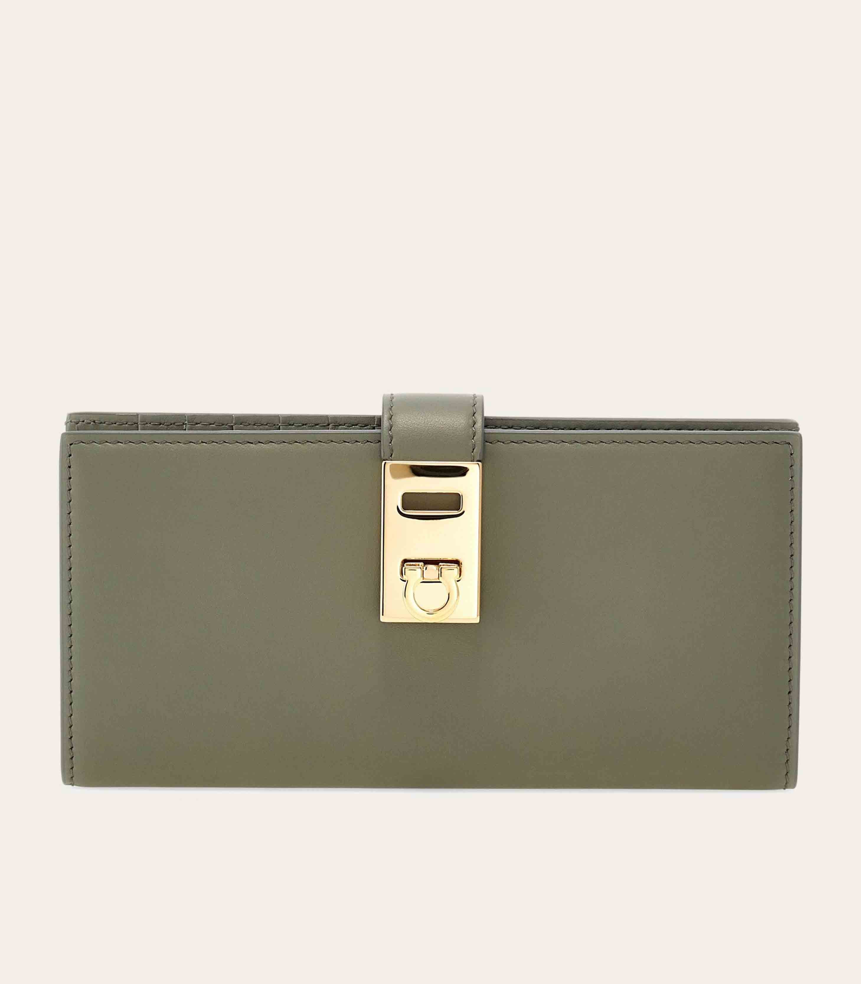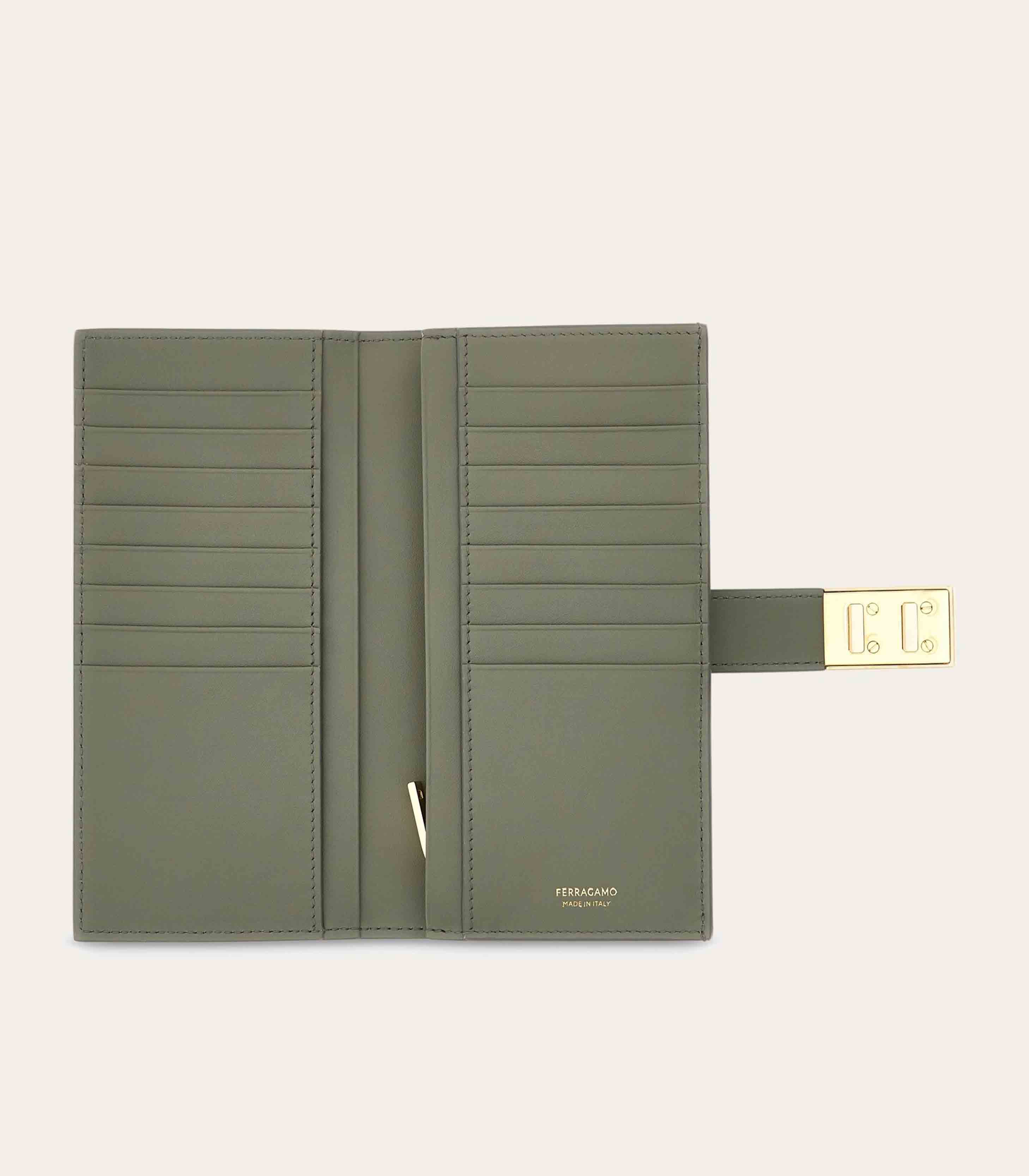 • Spacious, roomy, and elegant: the continental wallet is crafted in smooth calfskin, with a contrasting interior and a Gancini closure inspired by the Hug collection. The slots, zip pocket, and compartments provide perfect organization for personal belongings.