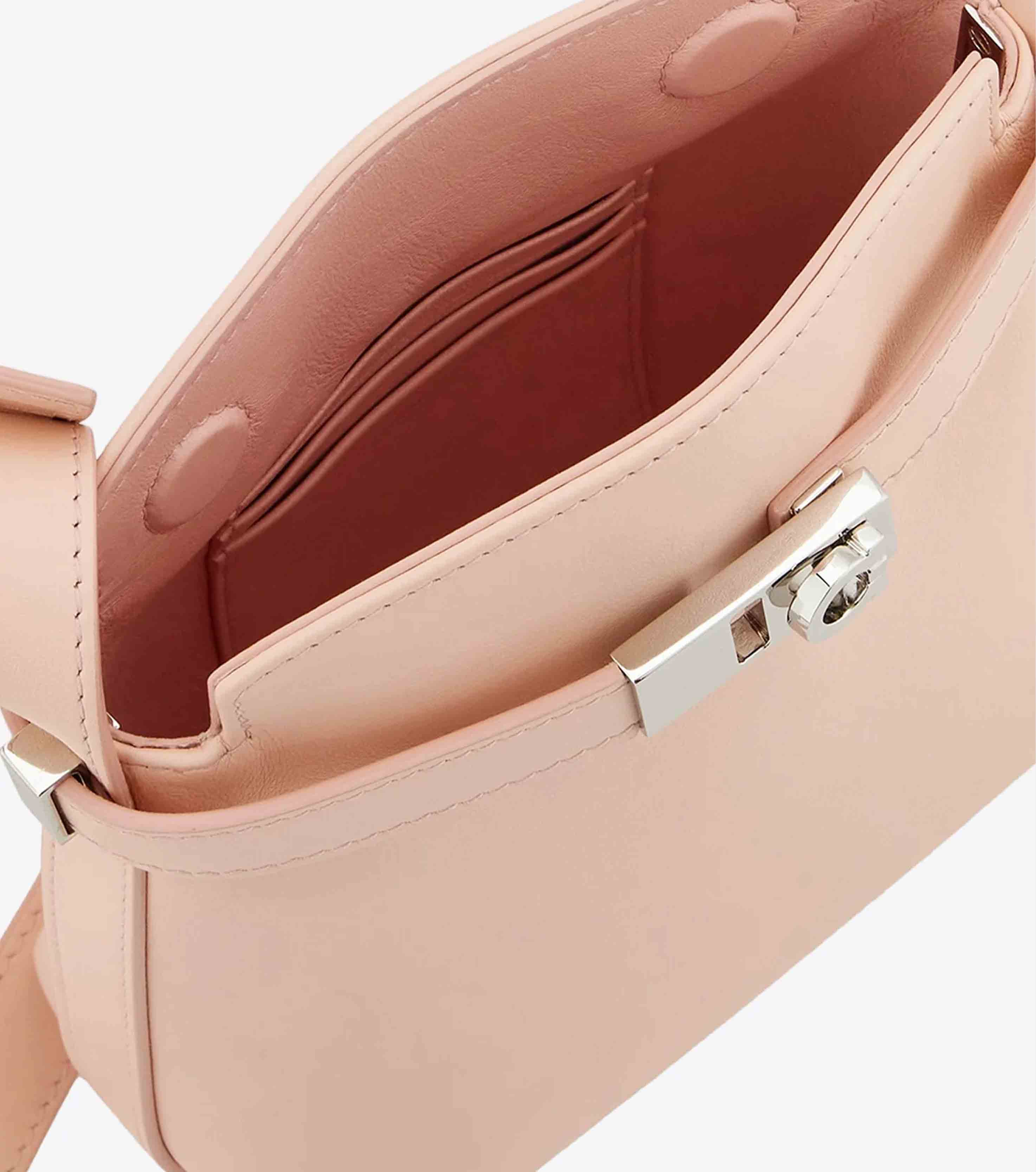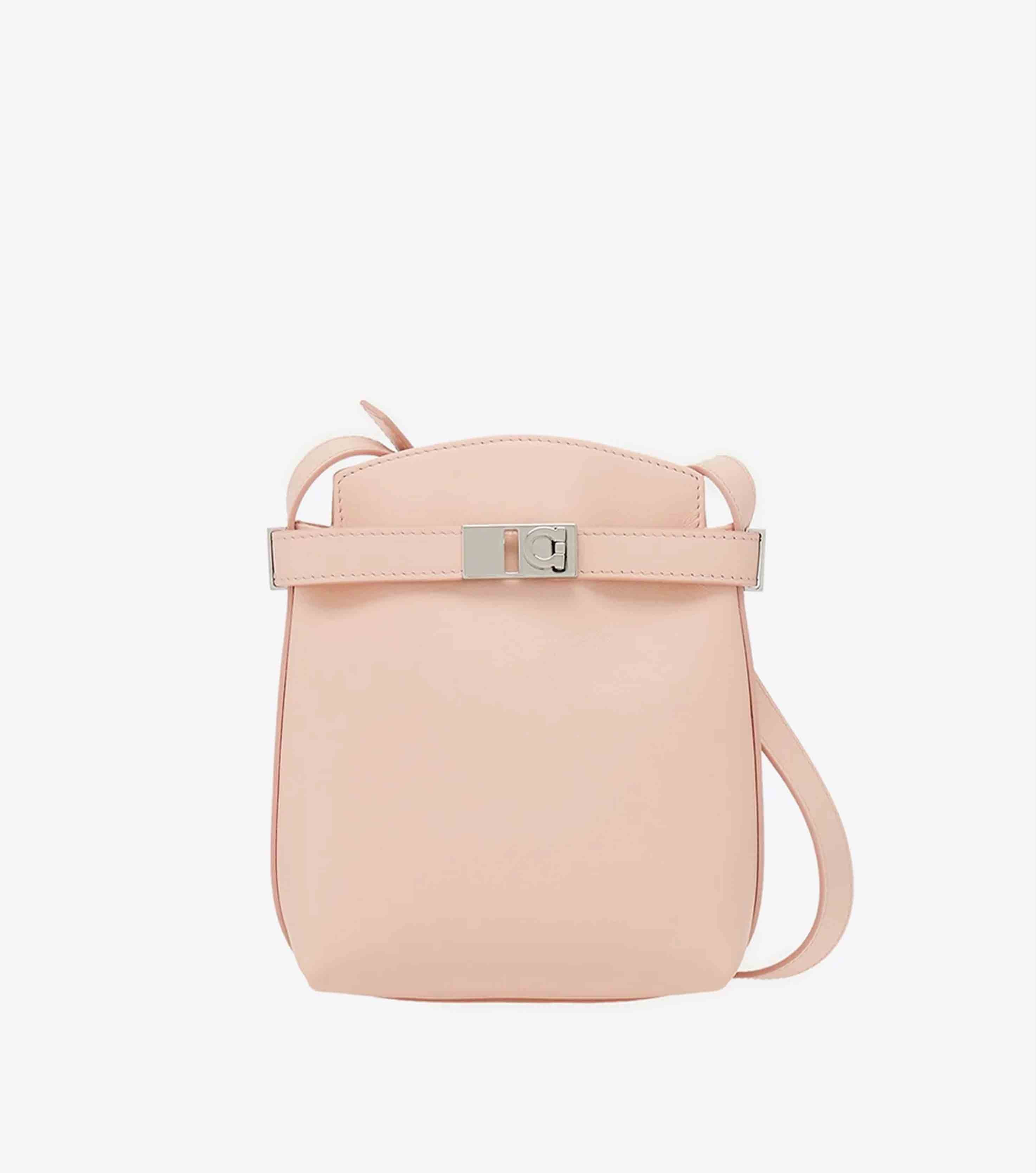 • It fastens with a magnetic button, has an adjustable shoulder strap, and a band with a golden Gancini buckle along the edge.