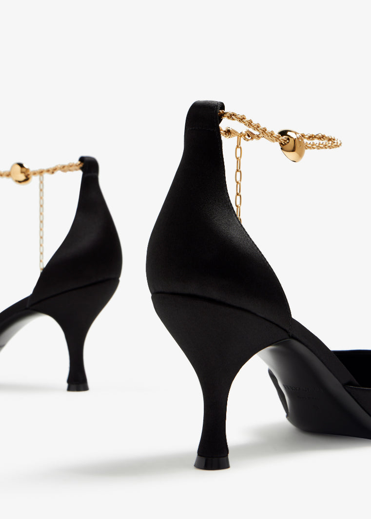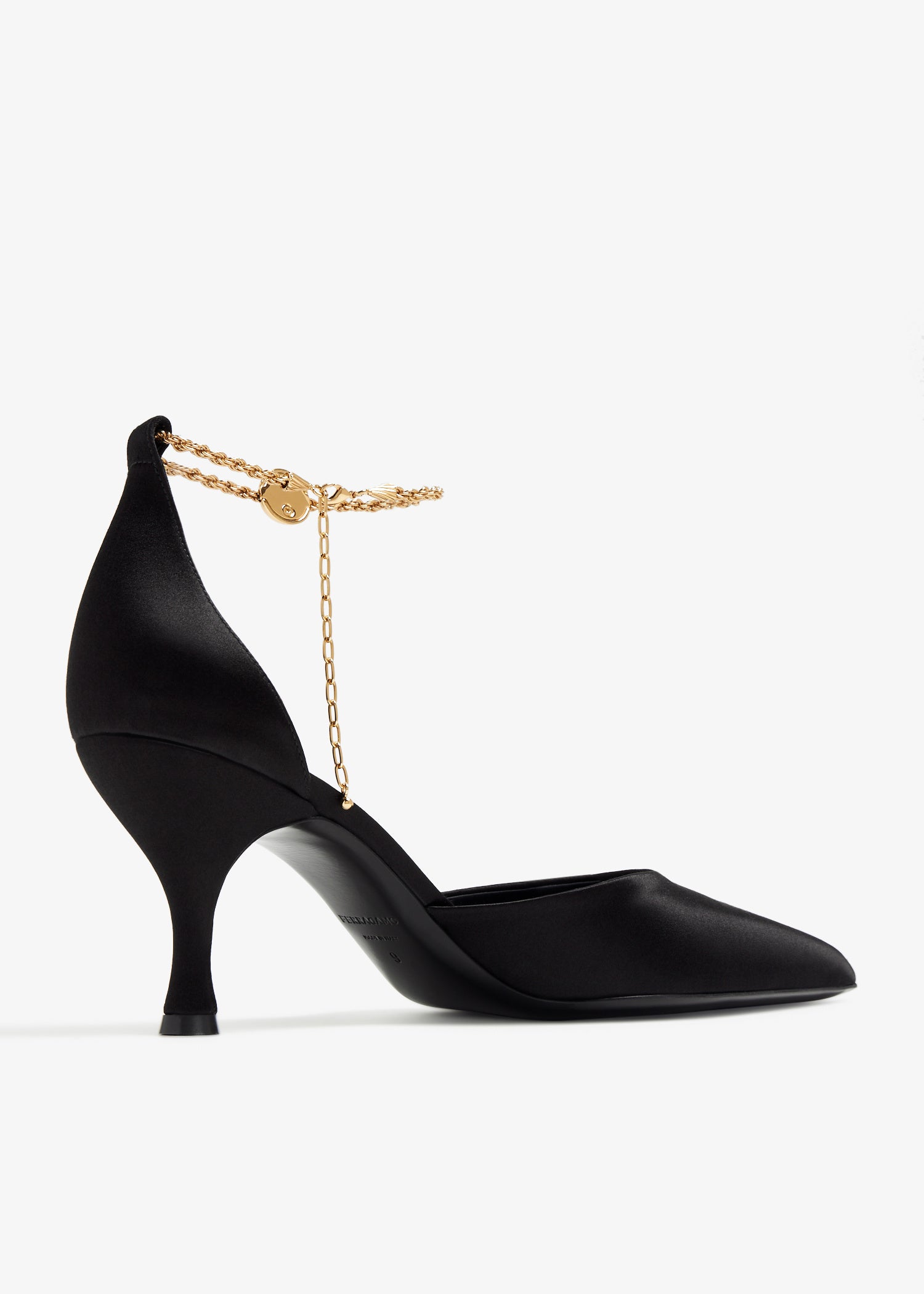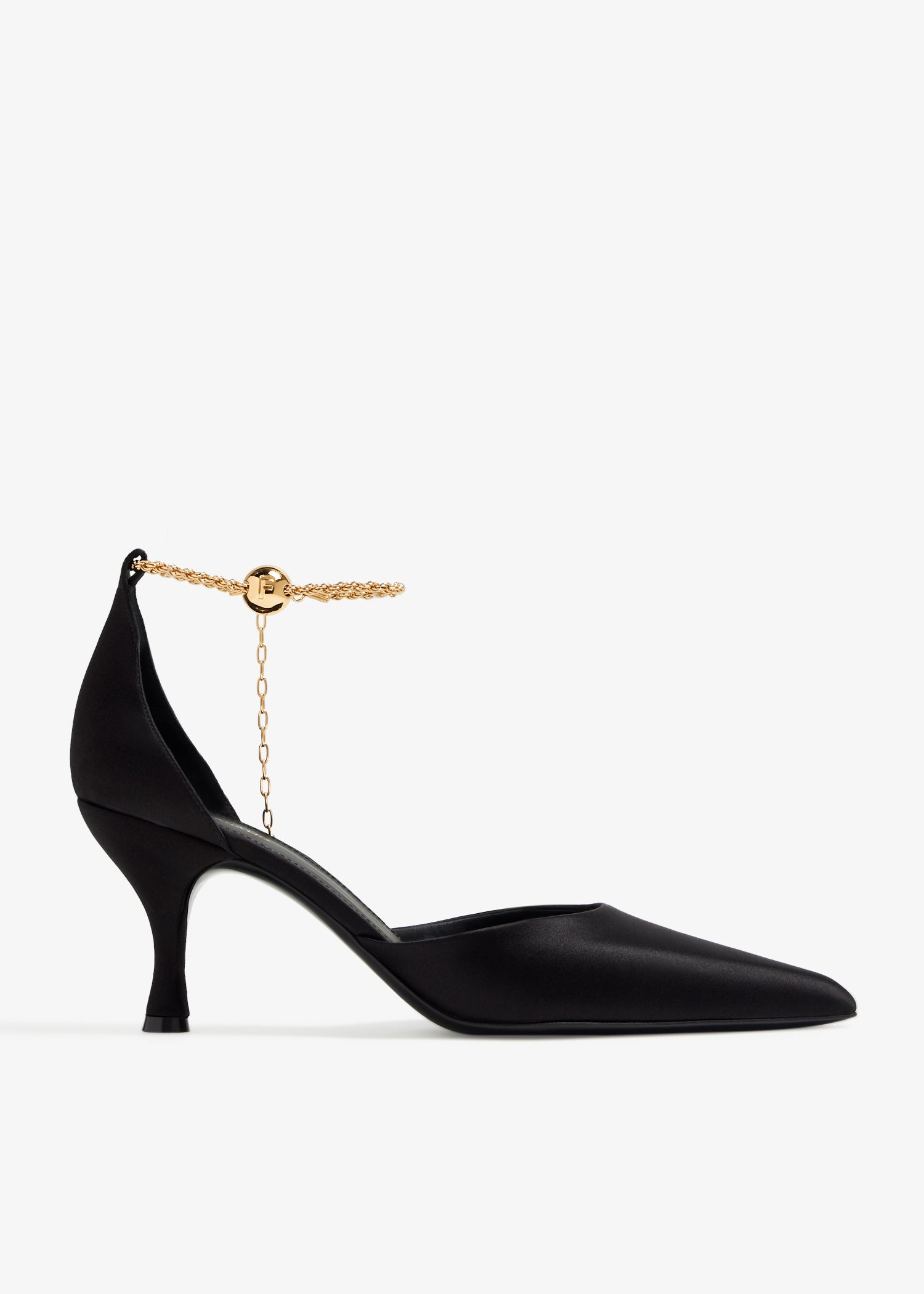 • Set on a mid-heel, these satin pumps are designed with a tapered toe with a squared tip, a golden ankle chain with an F engraved on the charm and a covered kitten heel with a slight tilt.
