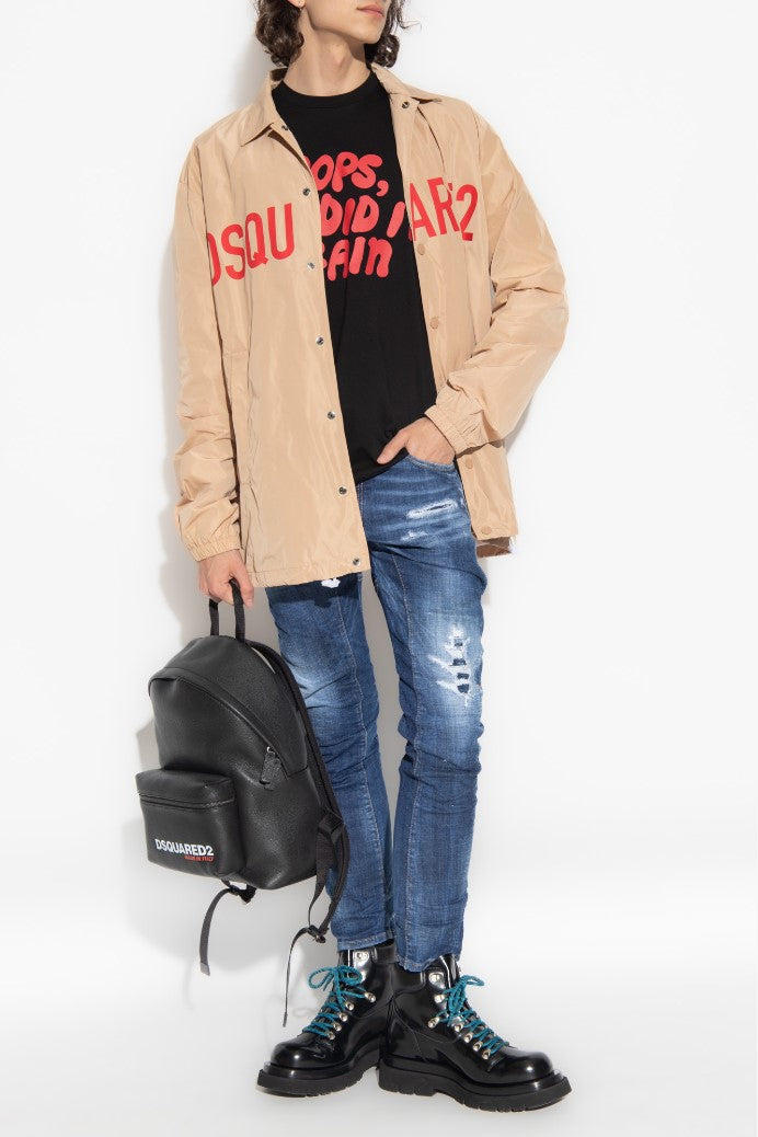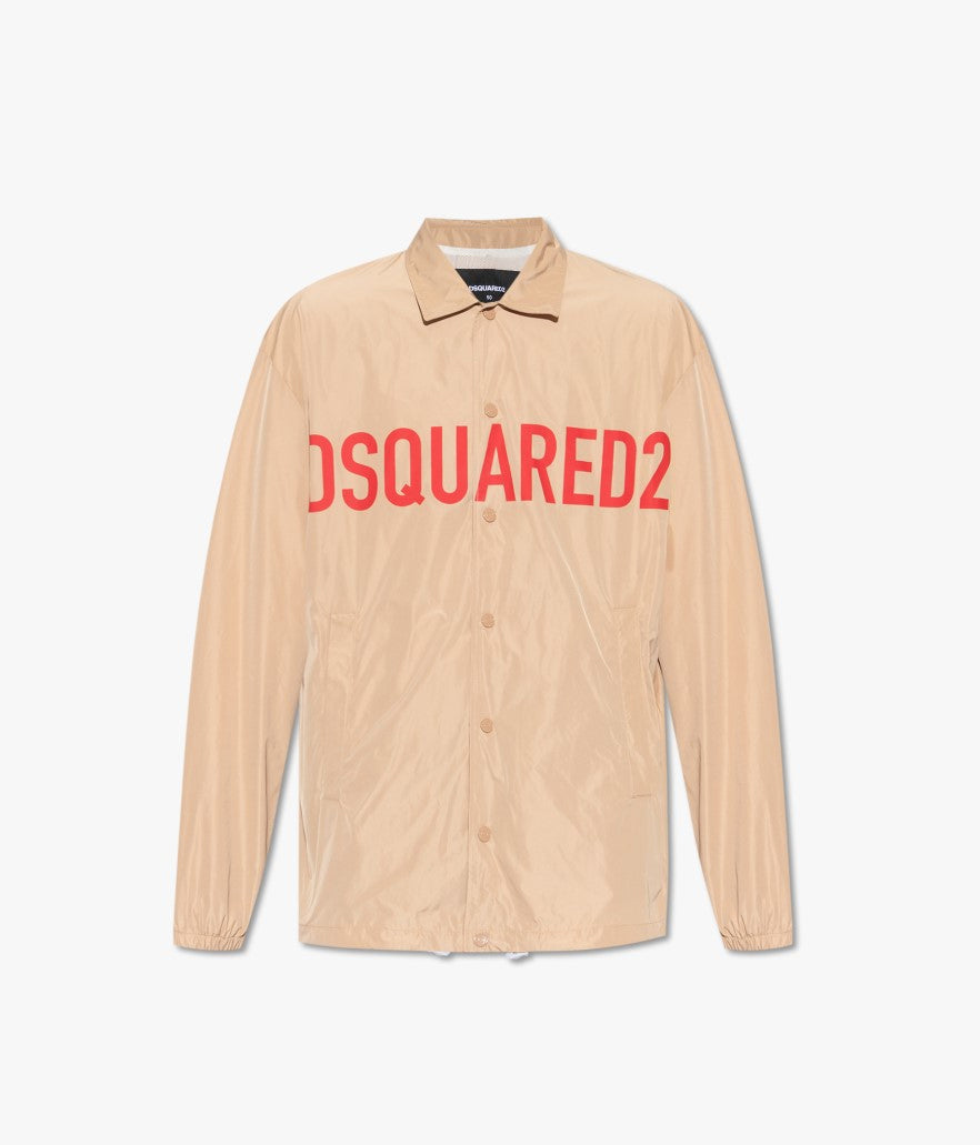 • This scarlet shirt jacket is crafted from lightweight polyester for wind and water resistance. It features a mesh lining, two side pockets, elastic cuffs, and an adjustable drawstring hem. The central element of the garment, which fastens with branded snaps, is a large, contrasting logo print on the chest.