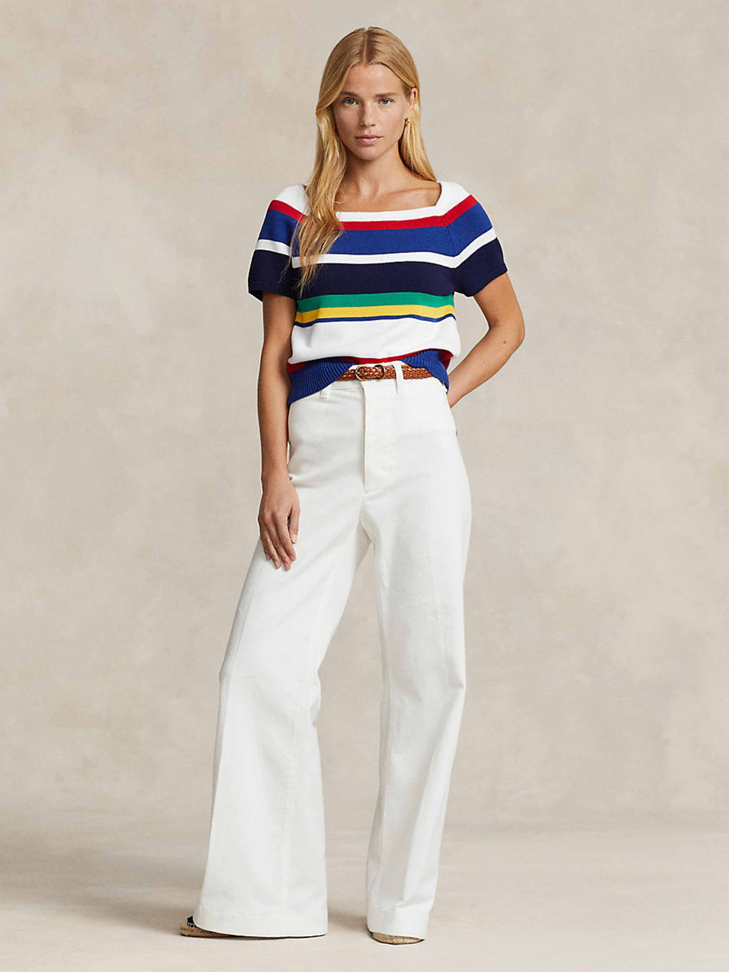 • Accented with a flattering square neck, this stretch cotton sweater is finished with bold stripes in an array of colors.