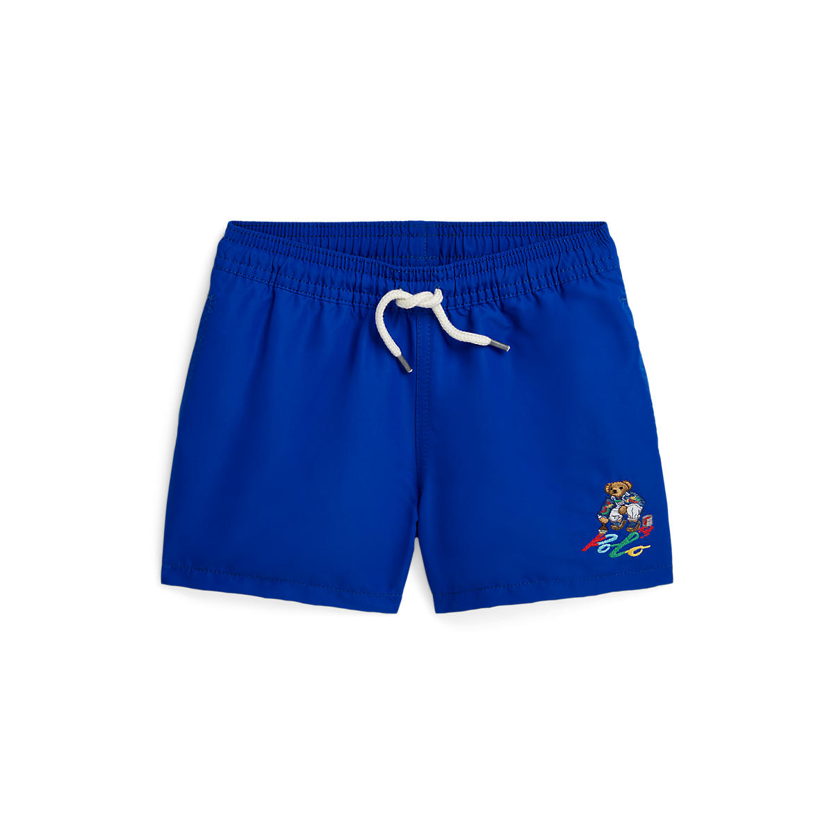 • Made with recycled polyester, these mesh-lined swim trunks feature our beloved mascot painting the “Polo” logo.