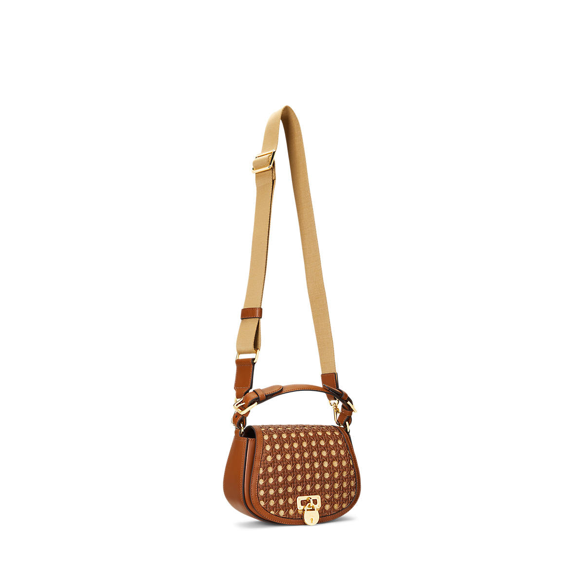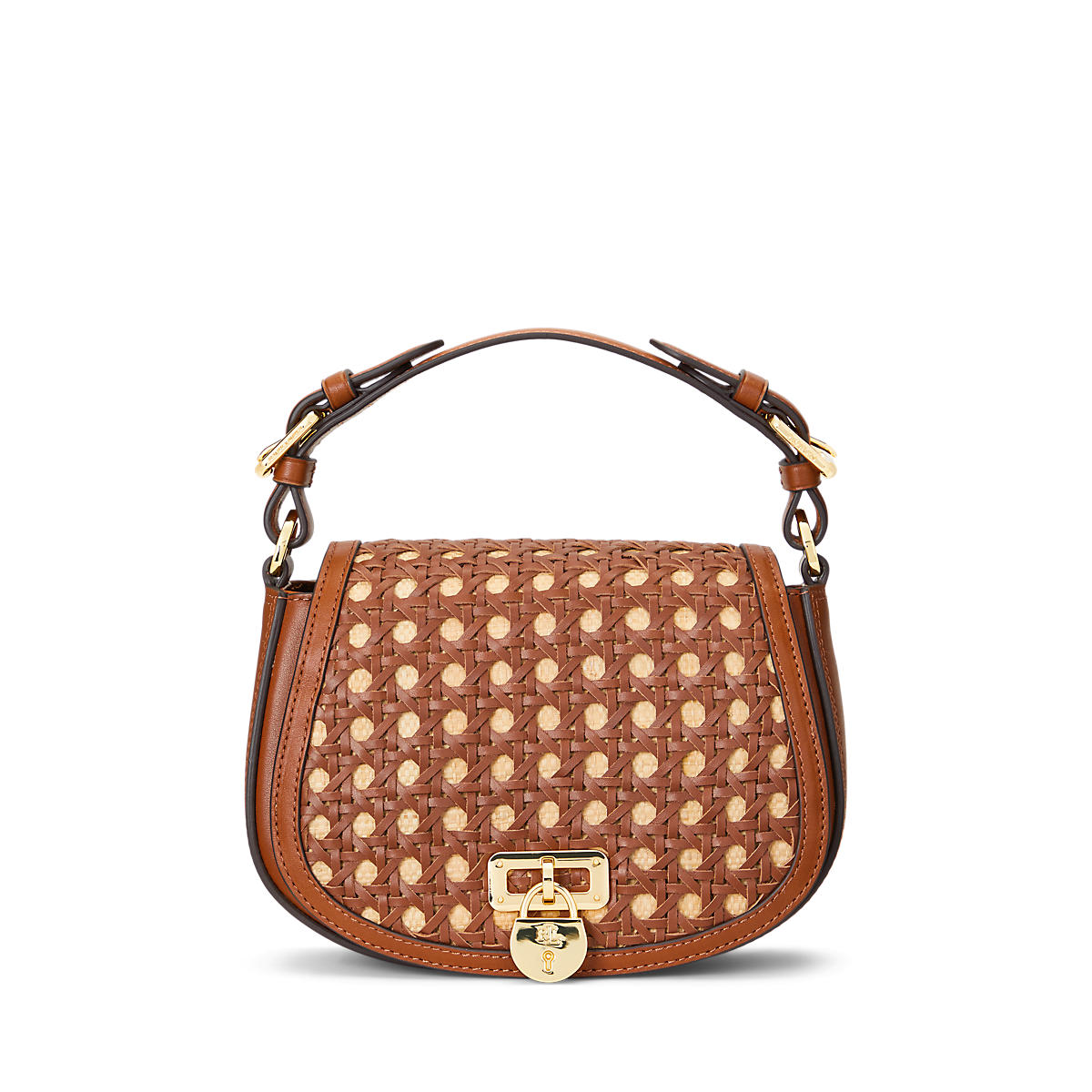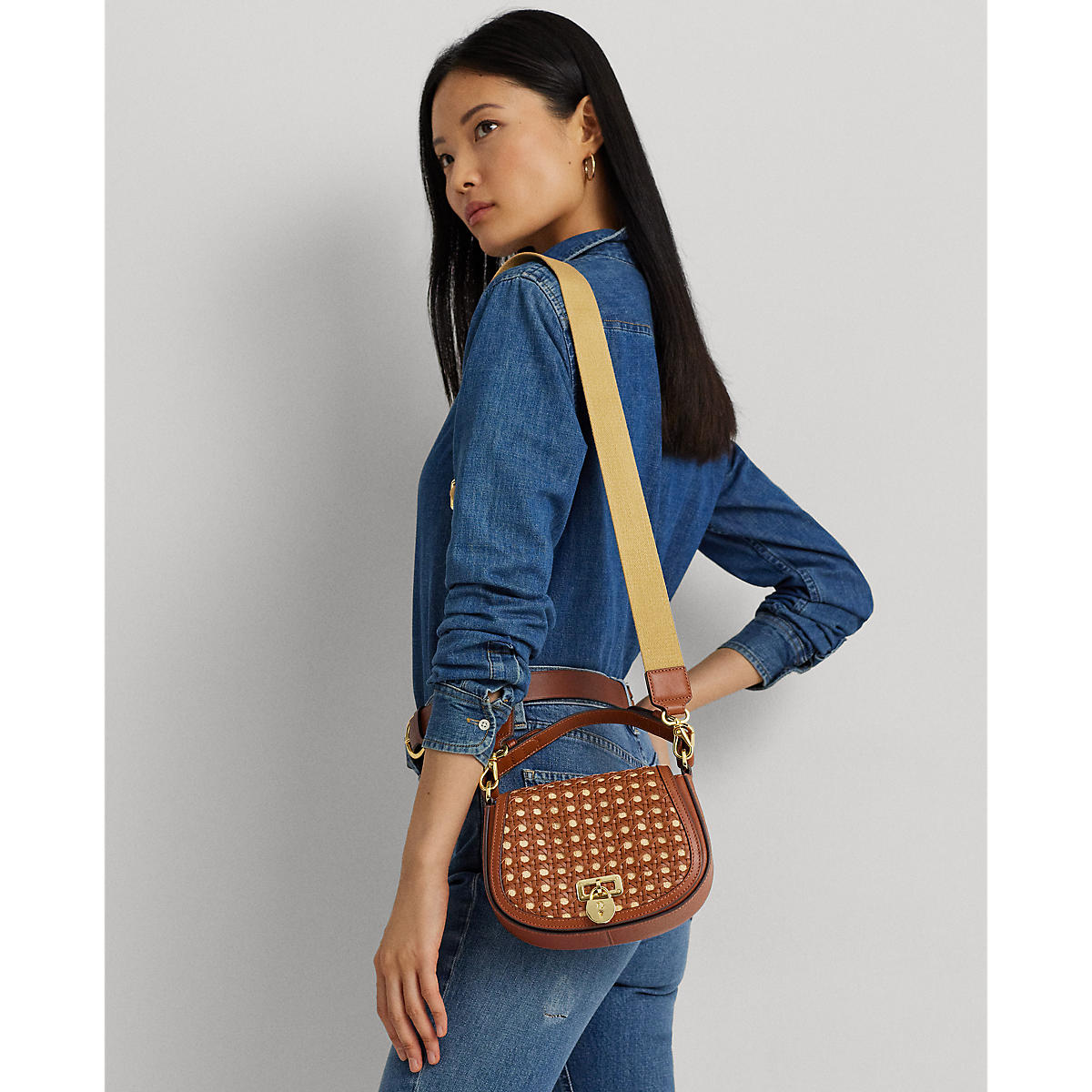 • Crafted with a luxurious combination of supple, handwoven full-grain leather—distinguished by its naturally smooth finish—and warm weather–ready raffia, this iteration of the medium Tanner features an “LRL”-engraved brass padlock charm and “Lauren Ralph Lauren”–engraved brass buckles. A versatile and chic must-have accessory, it’s designed with a removable, adjustable webbed crossbody strap for hands-free styling.