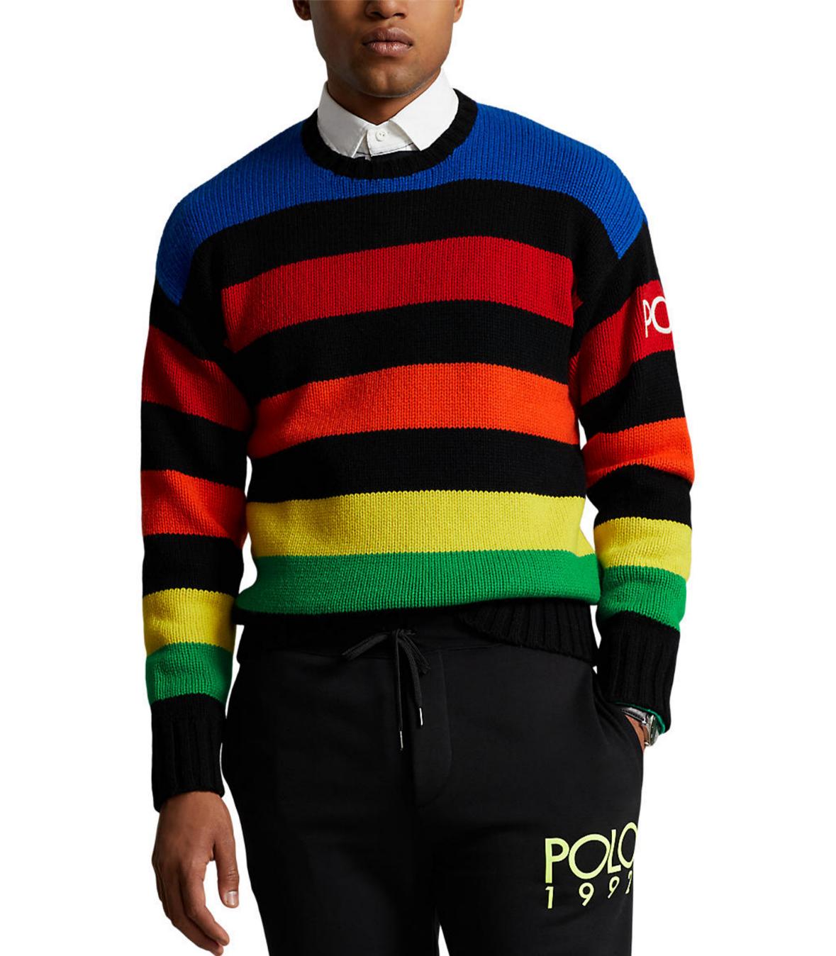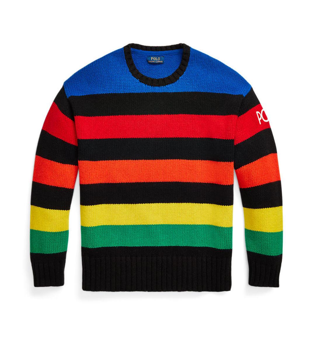 • This heavyweight sweater achieves a colorful striped pattern with six wool-blend yarns. At the left sleeve, it is embroidered with the Polo logo.