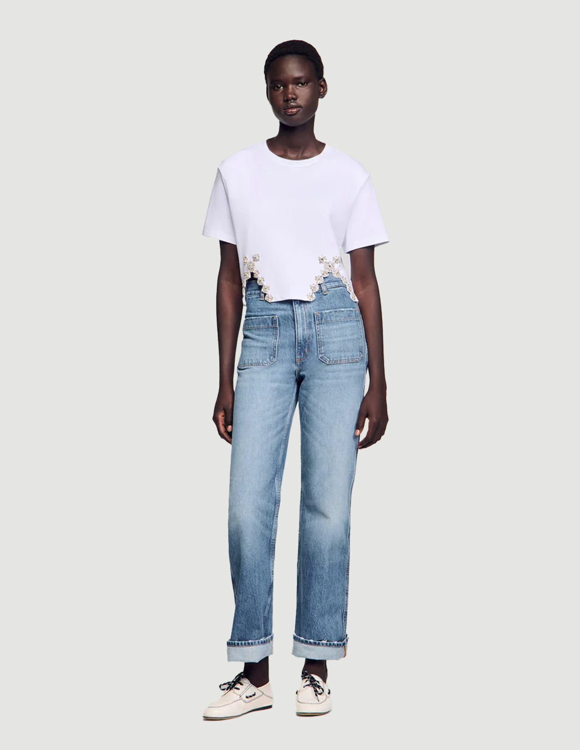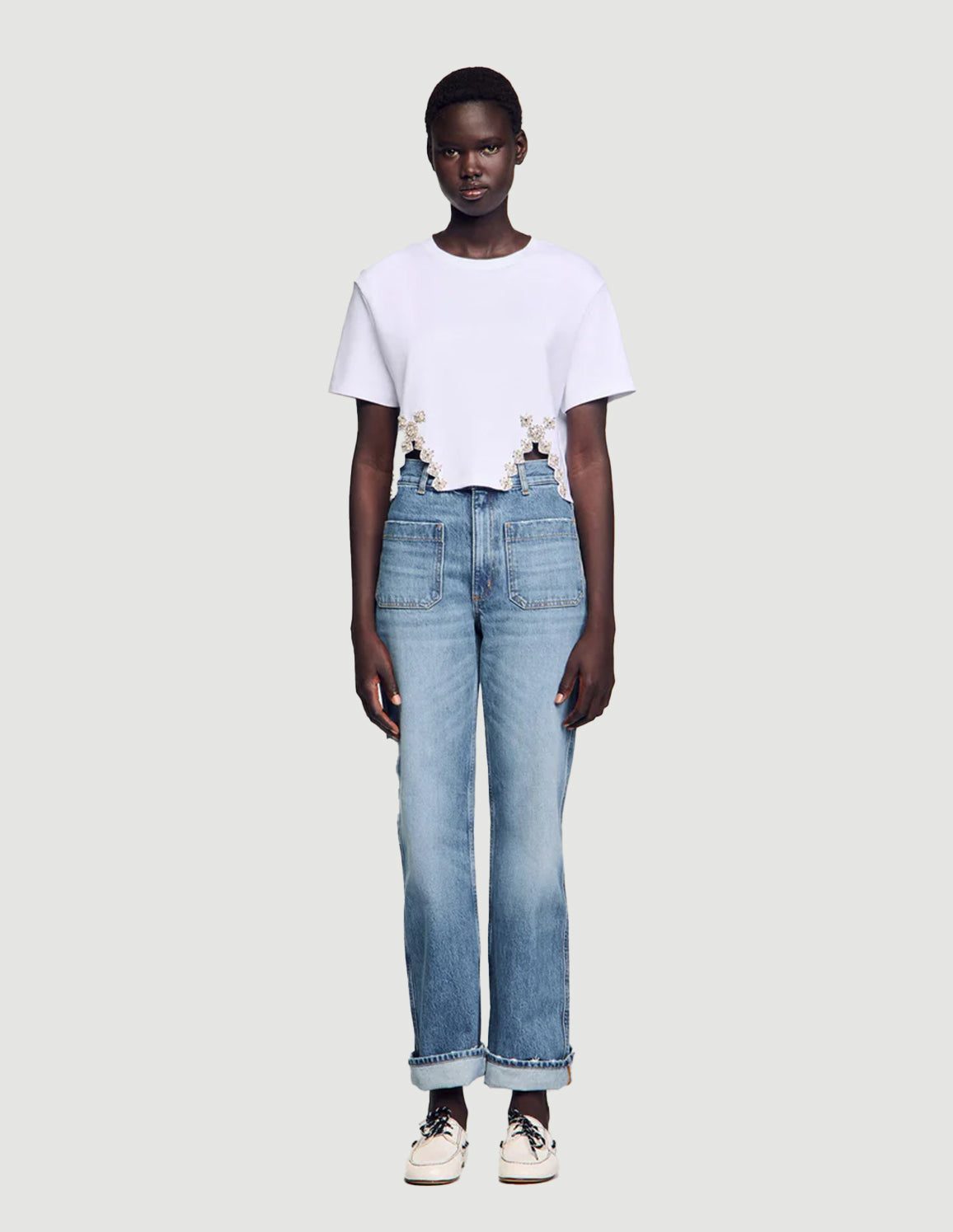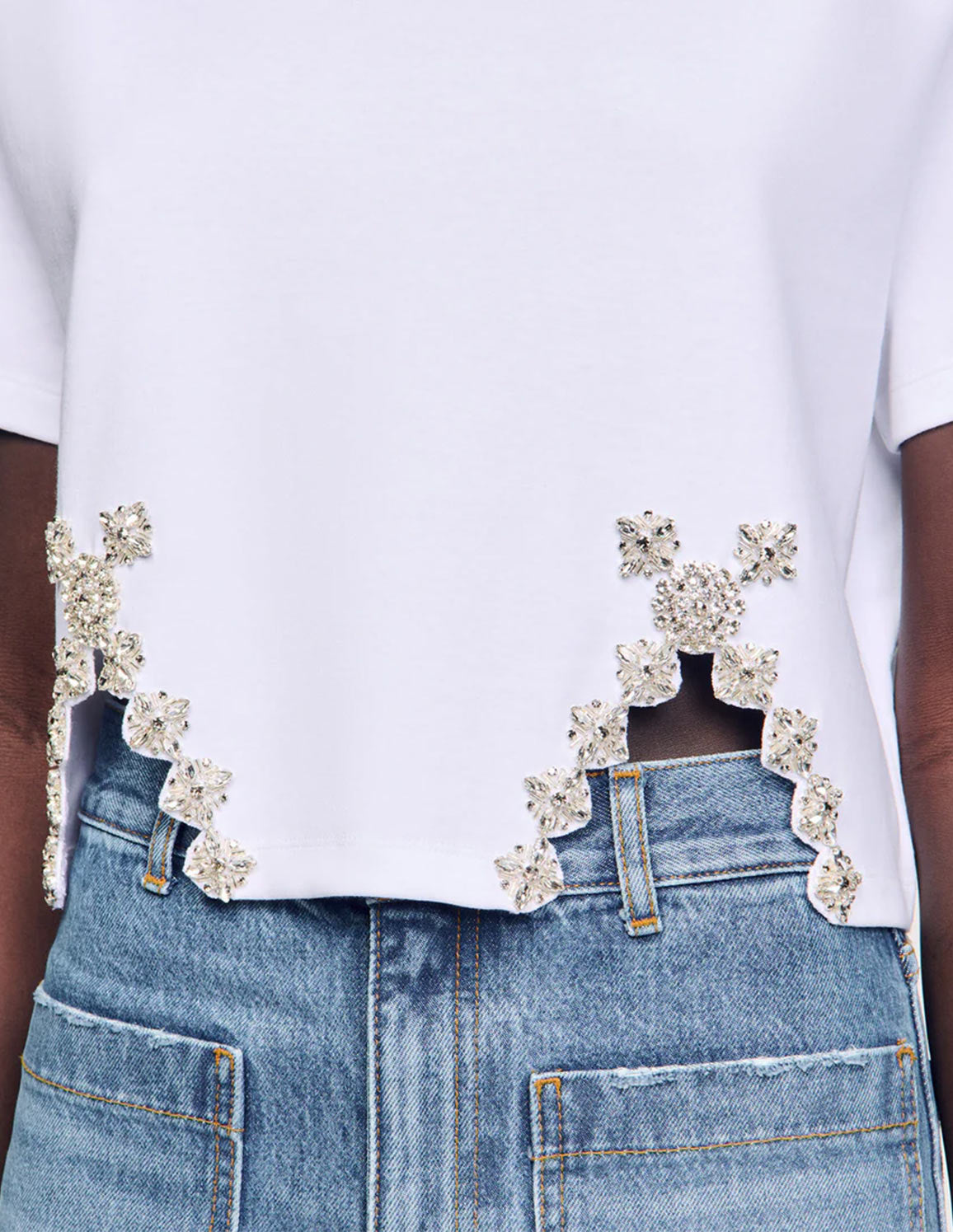• Short T-shirt with round neck, long sleeves, small front slits and embellished with floral crystals.