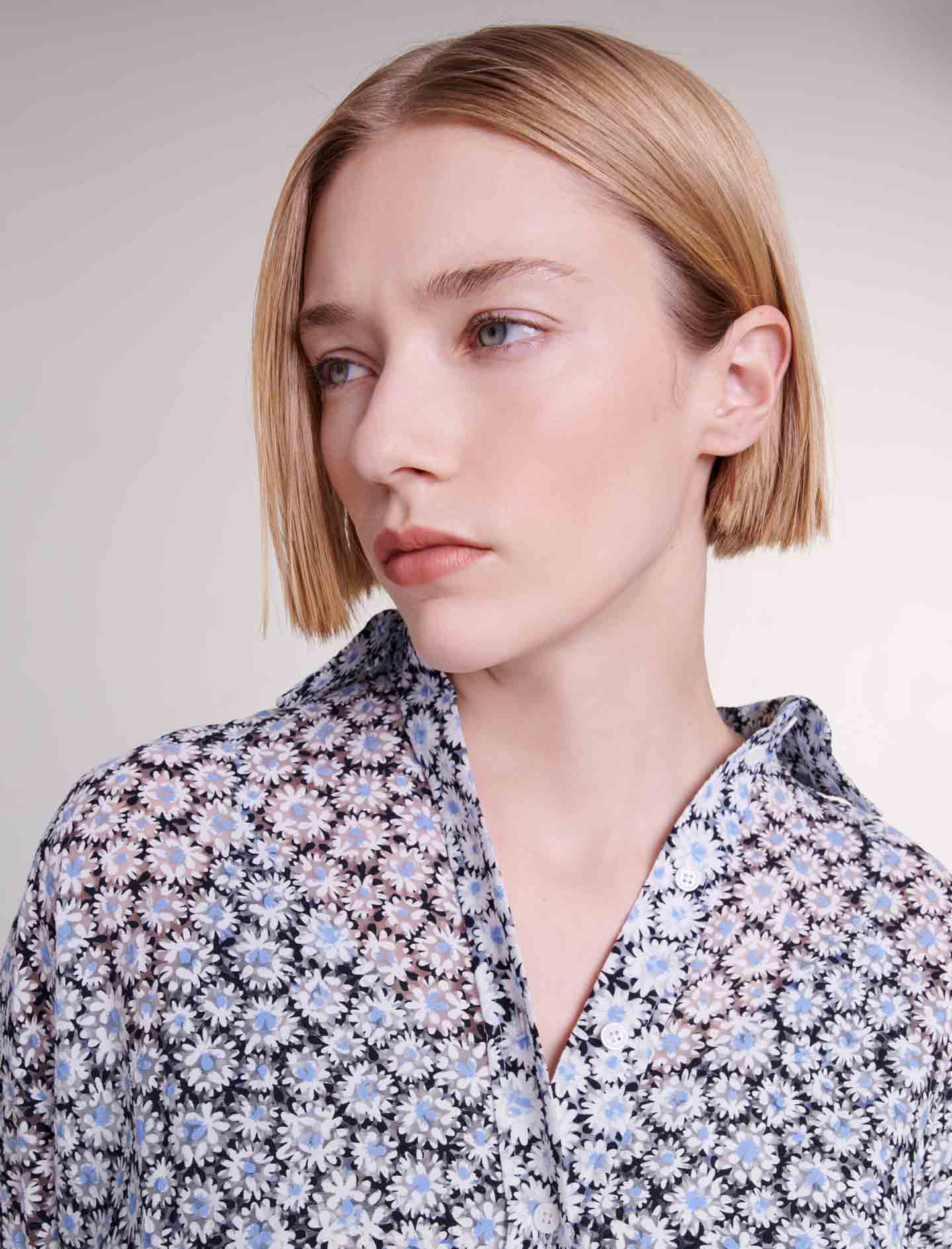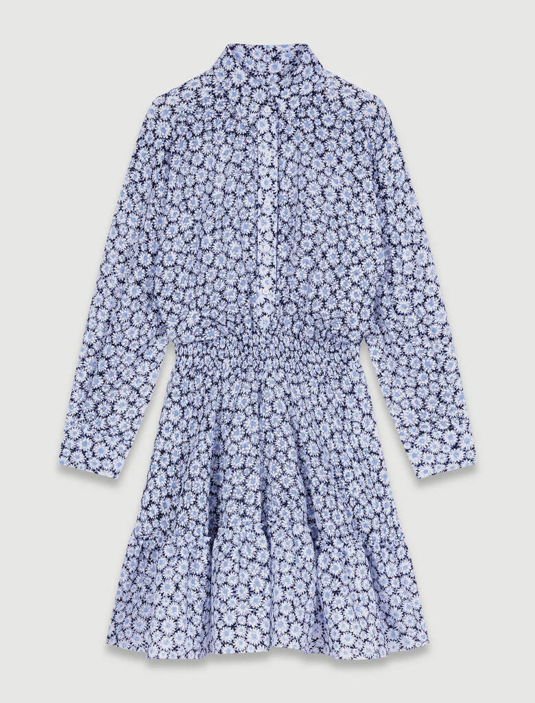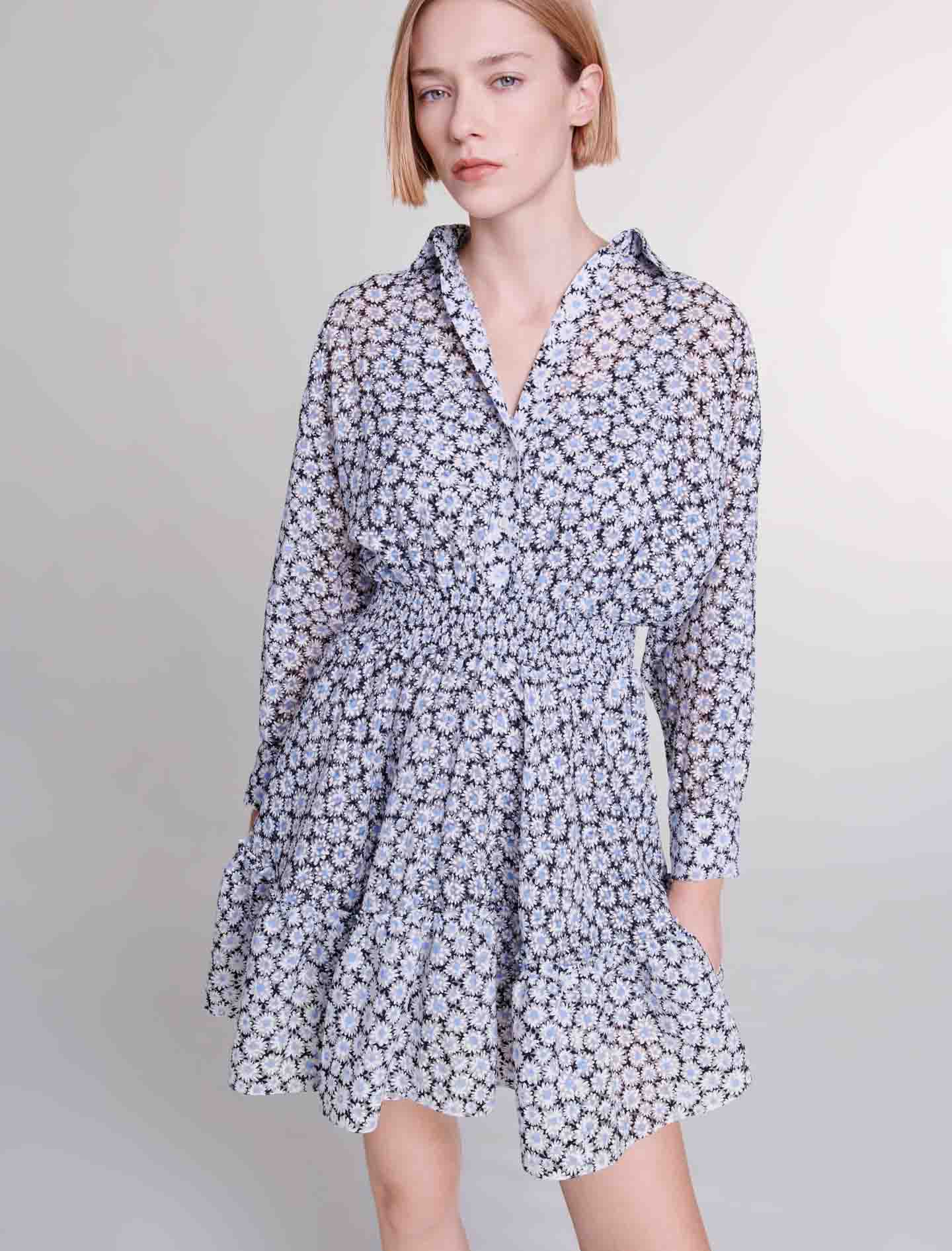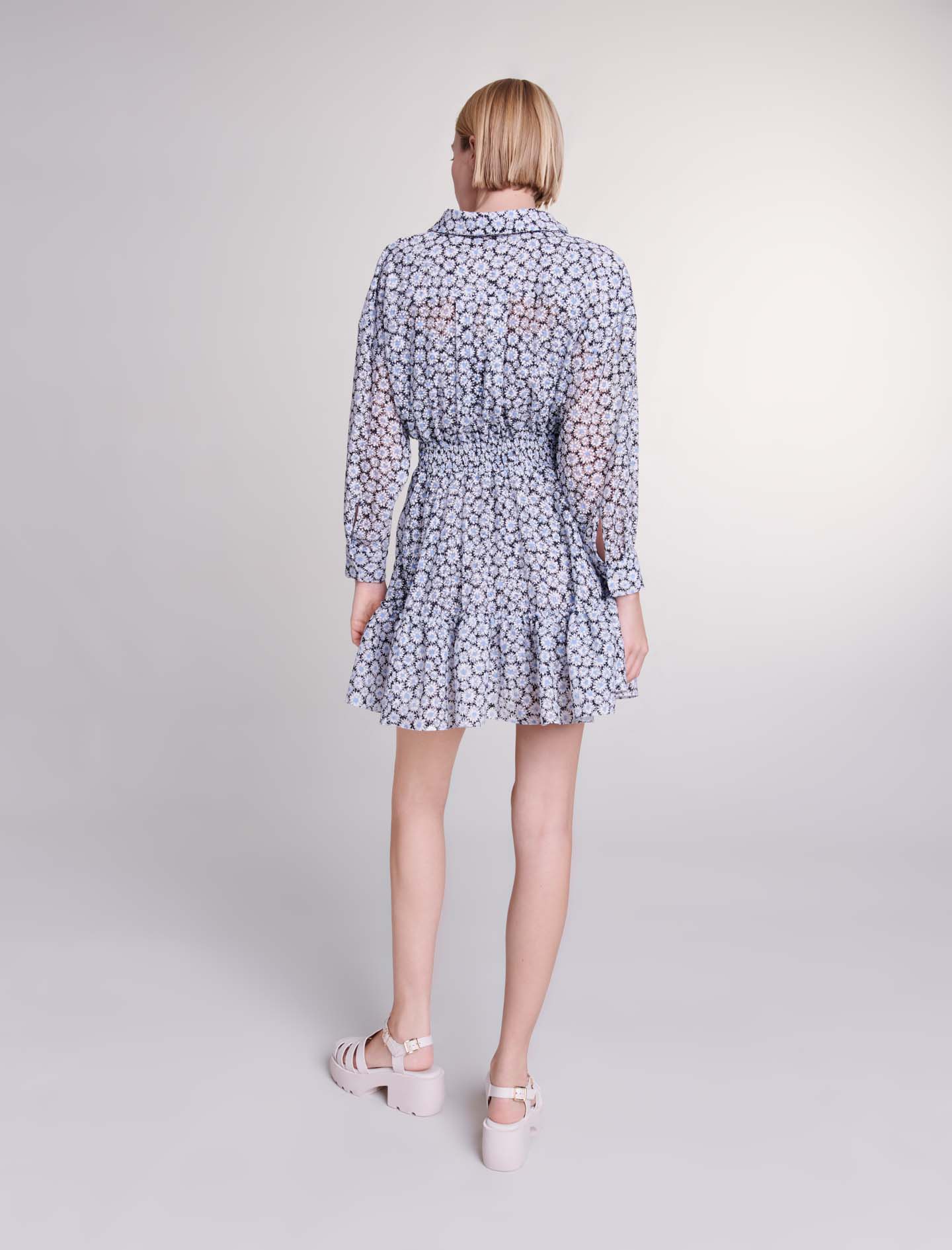 • This short, semi-sheer shirt dress is light and breezy with, its dévoré daisy pattern. Alongside its satin-effect, tone-on-tone, adjustable inner slip, it features a shirt collar, long sleeves, a button-down fastening and cuffs, plus two pockets. It has a smocked waist and a flared skirt for an airy yet perfectly fitted silhouette.