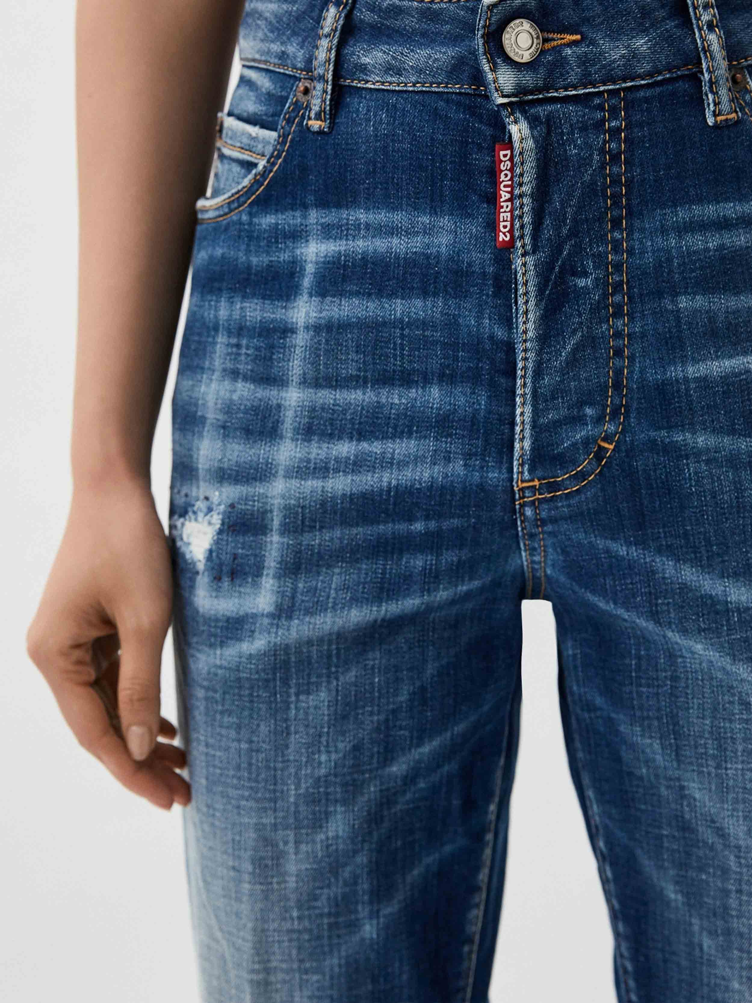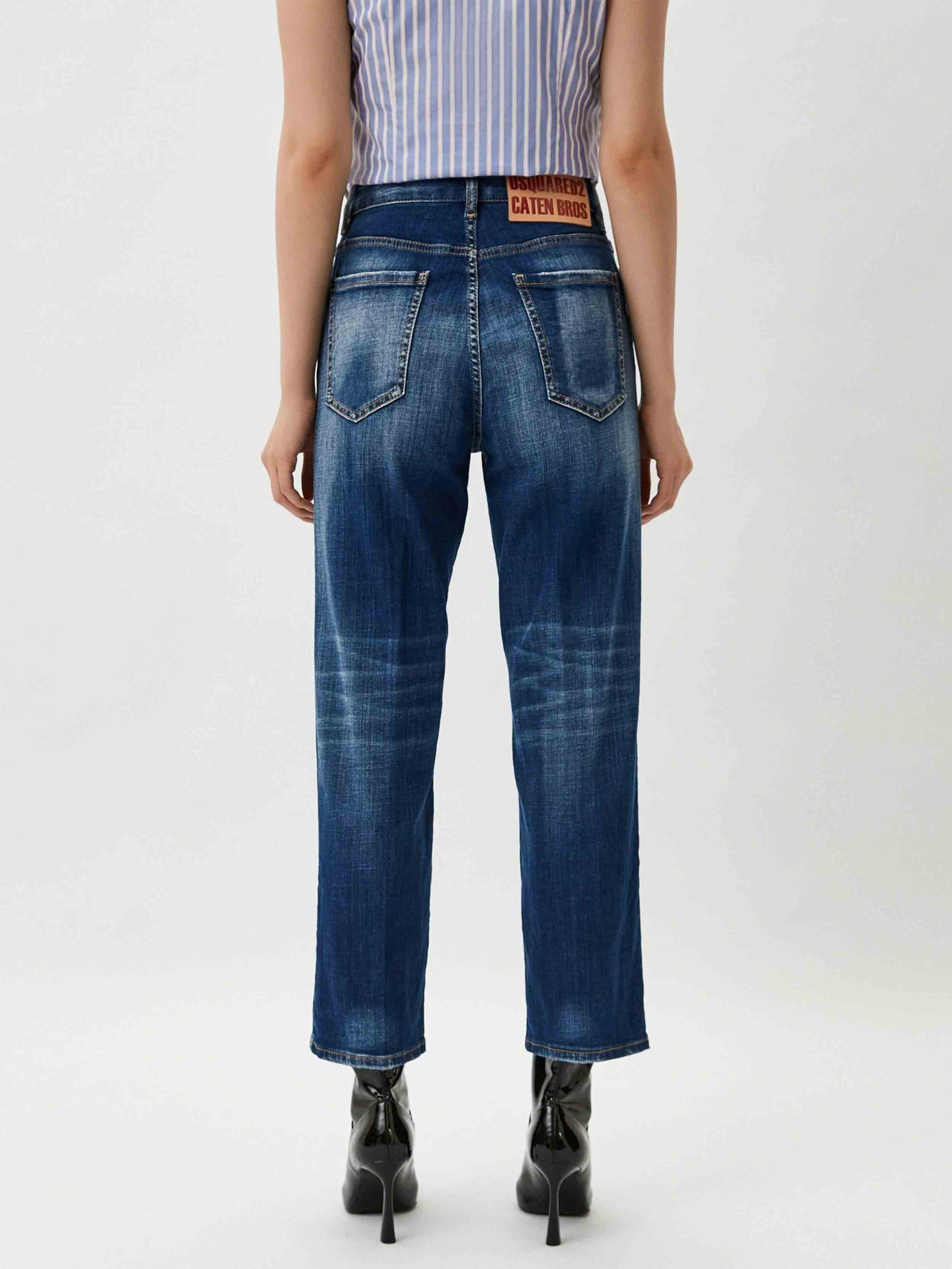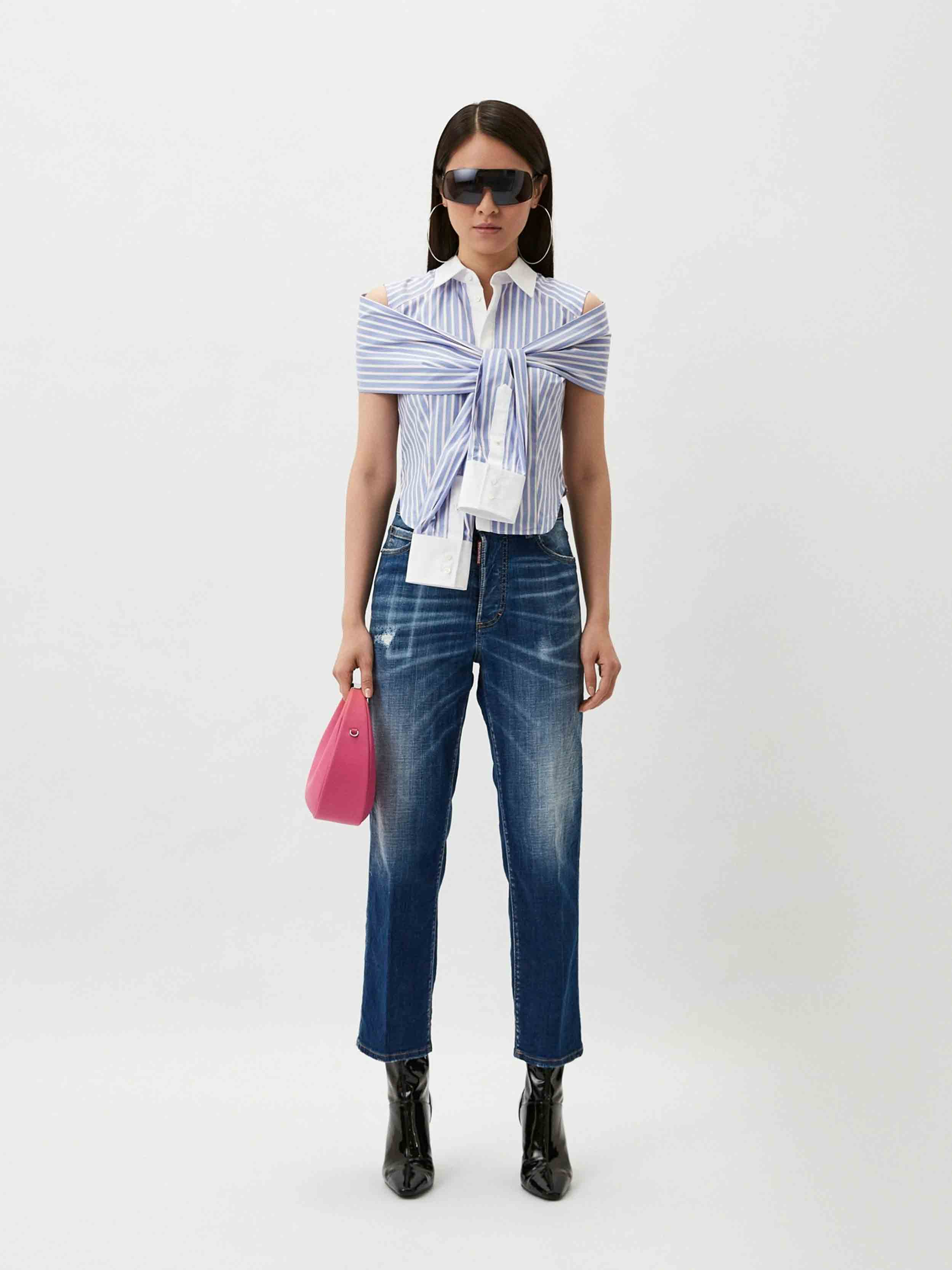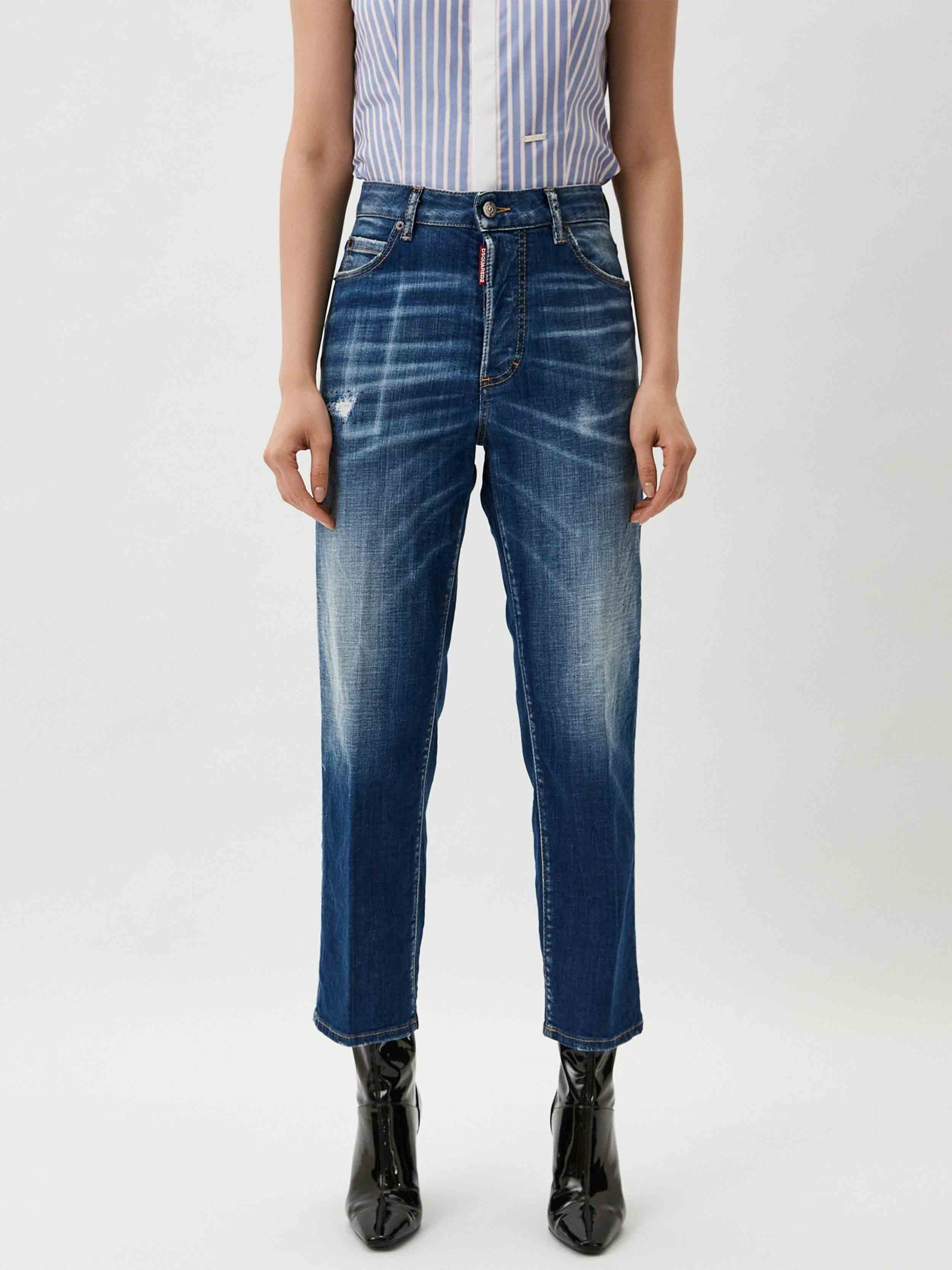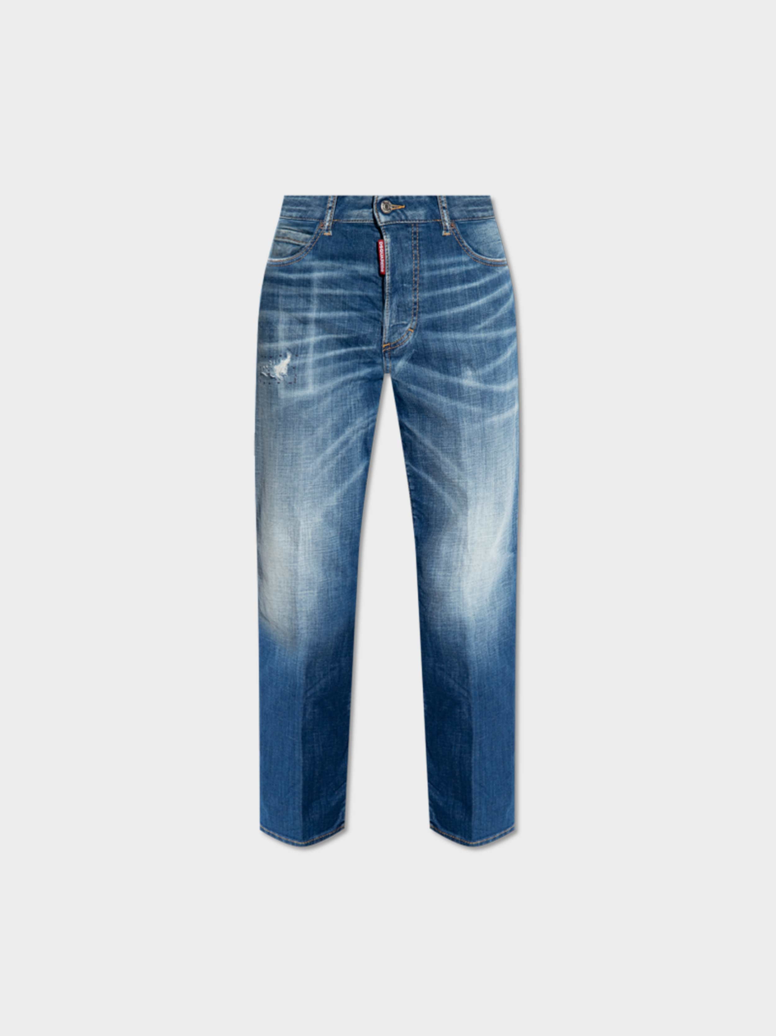 • Blue ‘Boston’ jeans from Dsquared2. Made of cotton, this pair falls with slightly tapered legs and features buttons as well as a worn, faded and vintage effect.