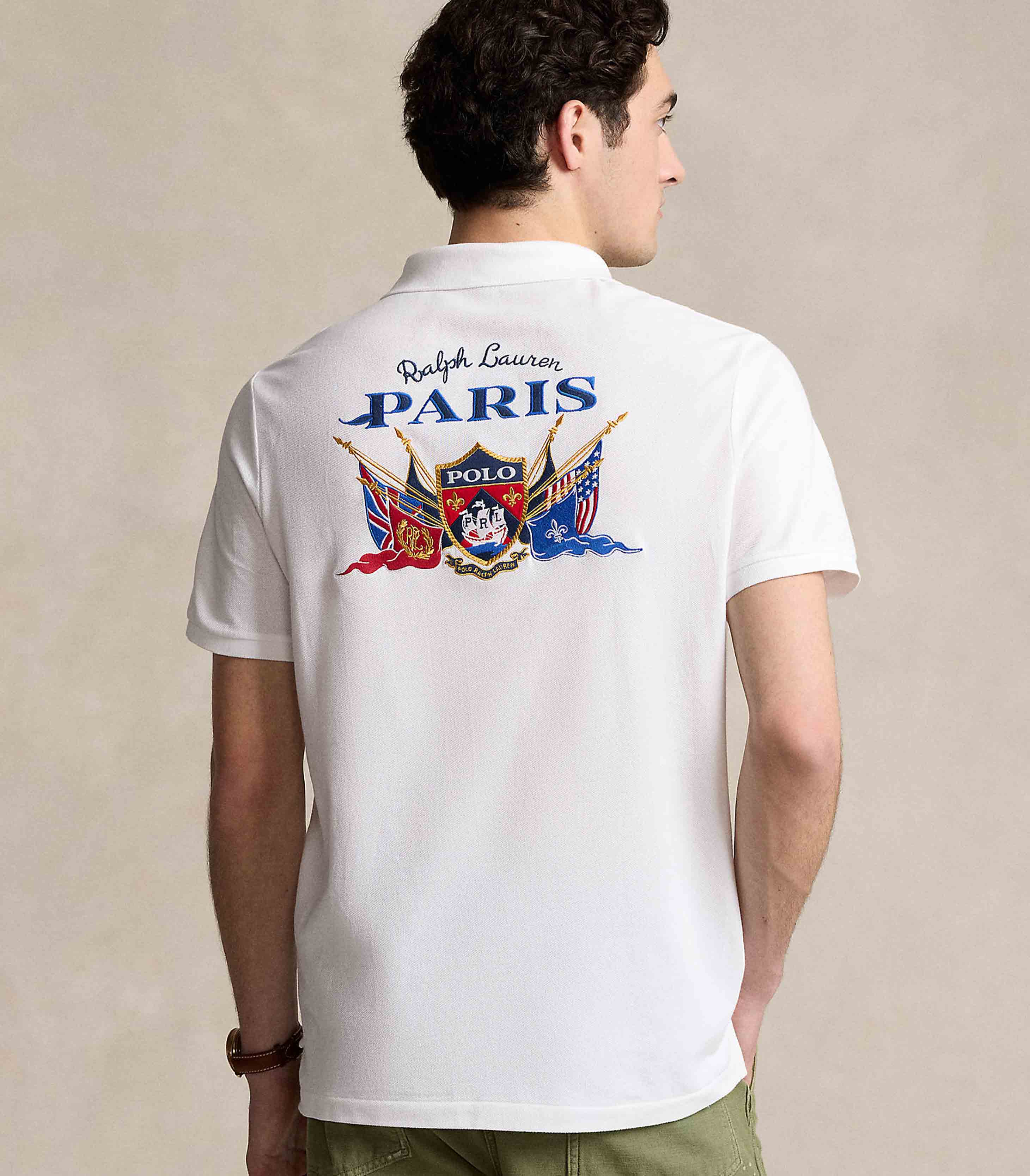 • Heraldic lion embroidered at the left chest. "Ralph Lauren Paris," a "Polo" shield and flags embroidered at the center back.