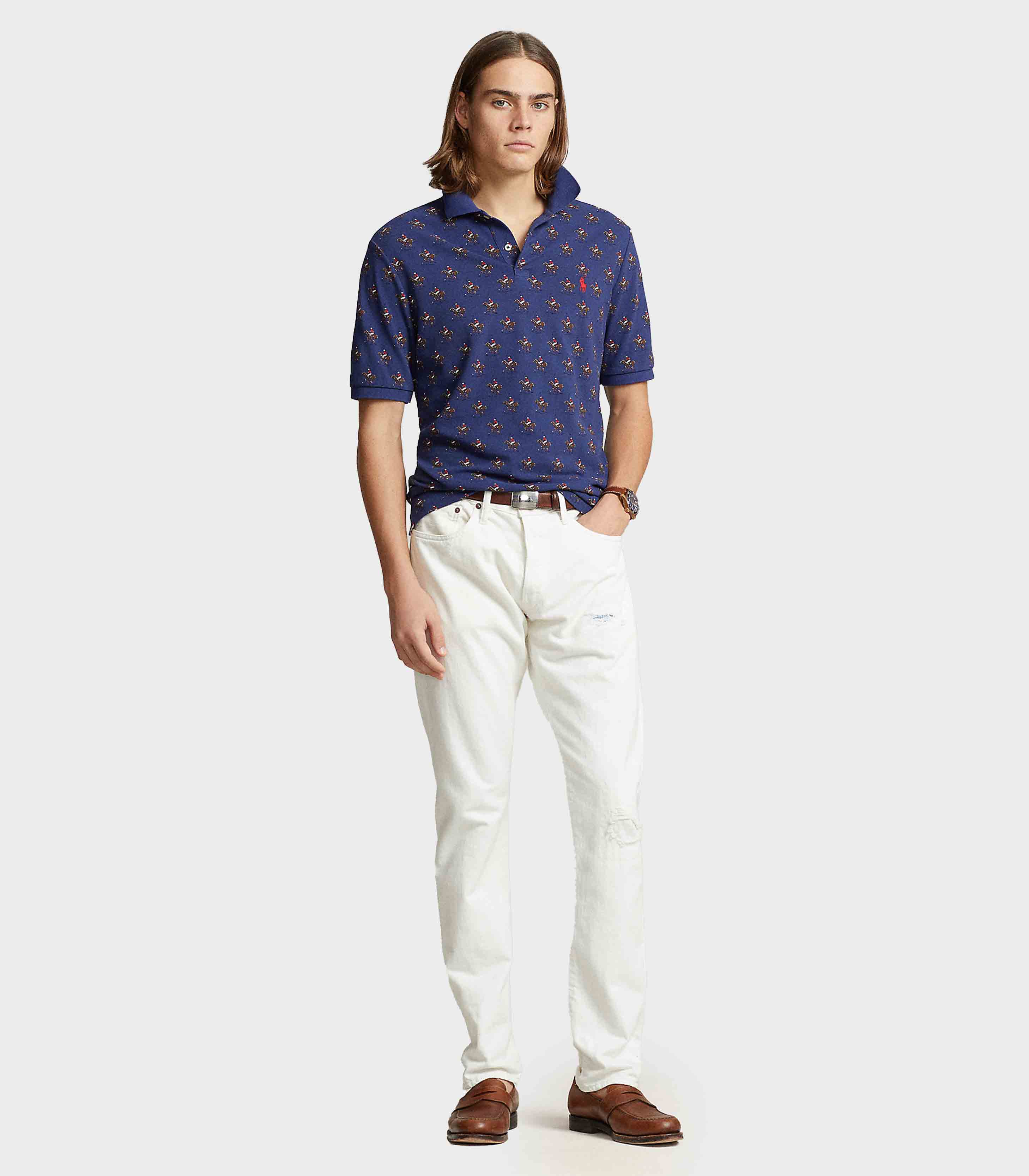 • An American style standard since 1972, the Polo shirt has been imitated but never matched. Over the decades, Ralph Lauren has reimagined his signature style in a wide array of colors and fits, yet all retain the quality and attention to detail of the iconic original. This version is made with our highly breathable cotton mesh and features an allover print of a horseback rider.