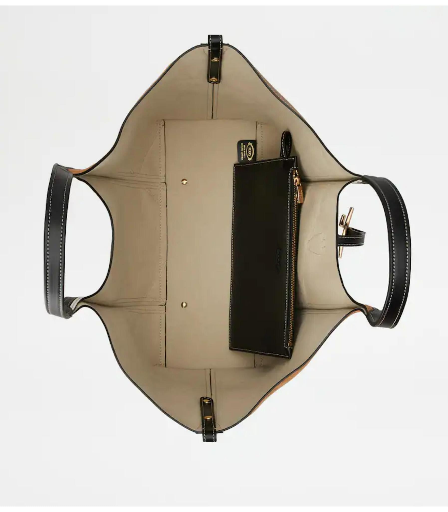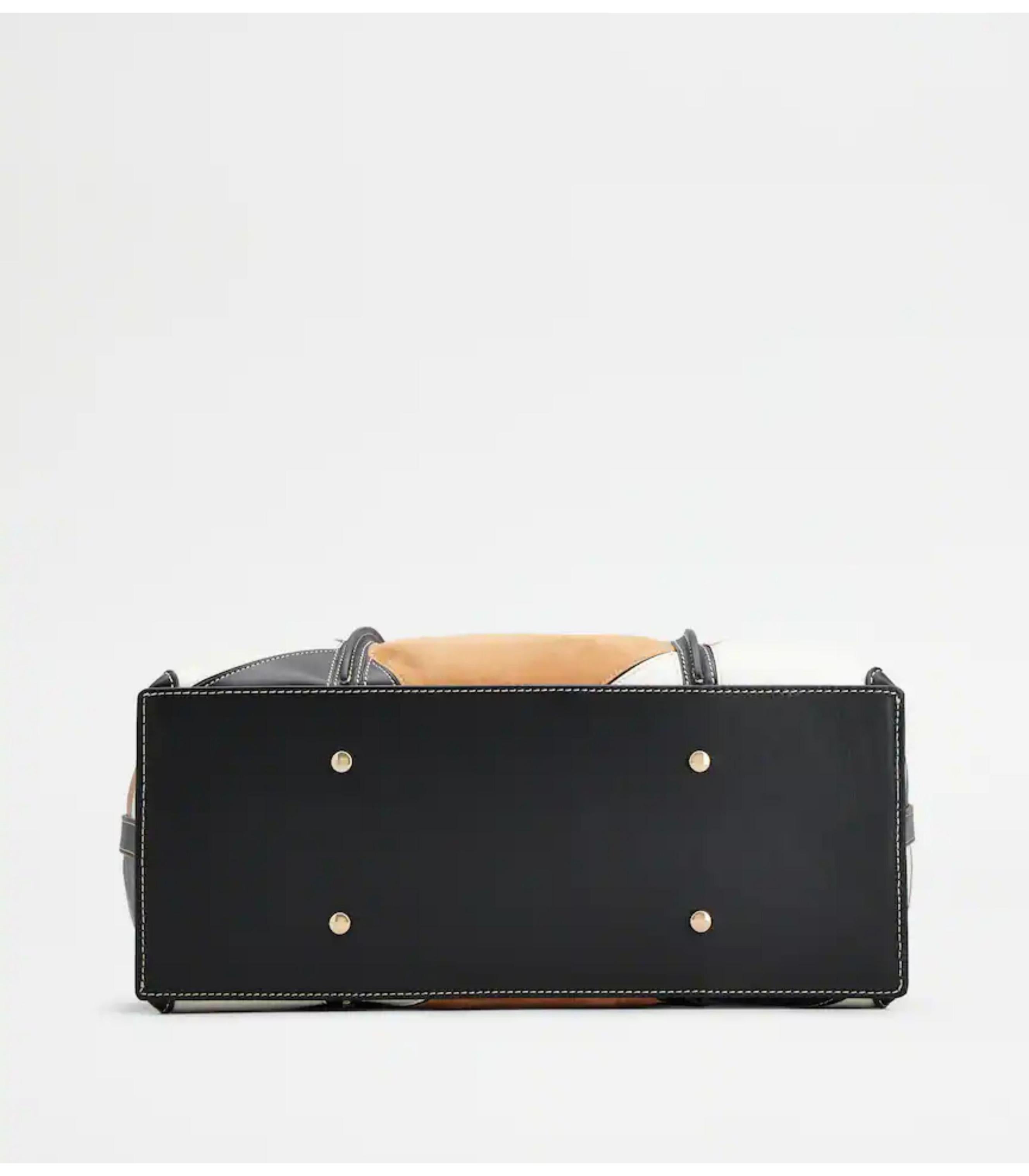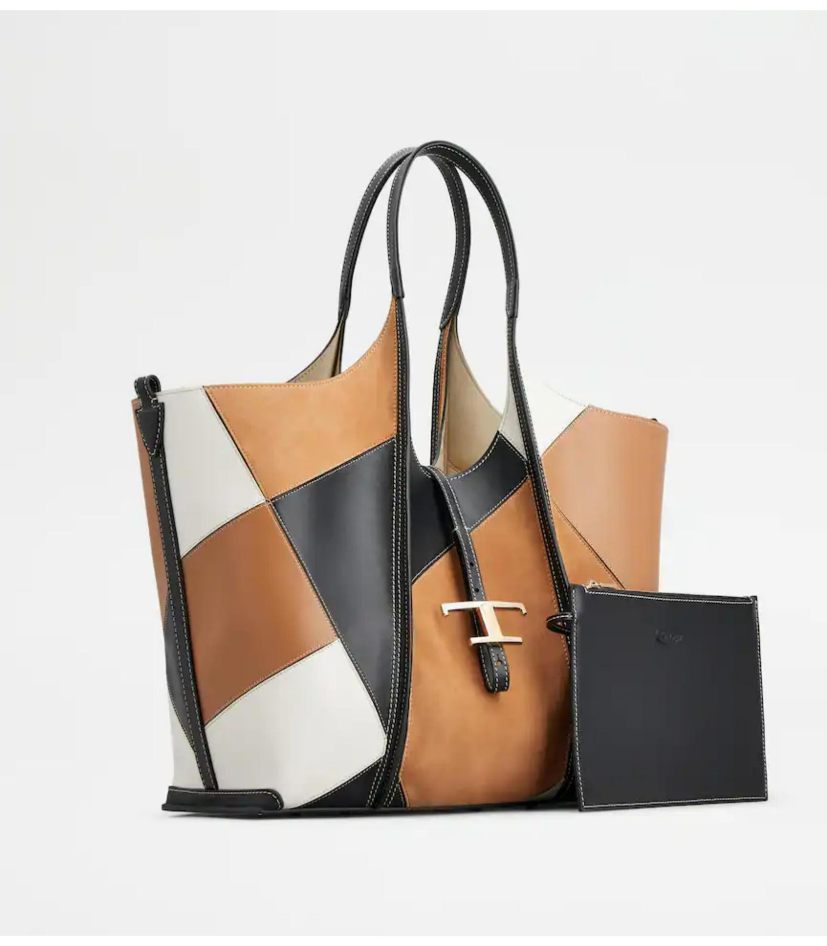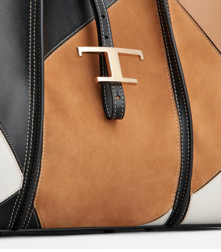 • Shopping bag with flowing lines, crafted combining smooth leather and suede patches. Characterized by the branded metal T Timeless pendant, this elegant creation comes with two fixed handles and a practical internal pouch.
