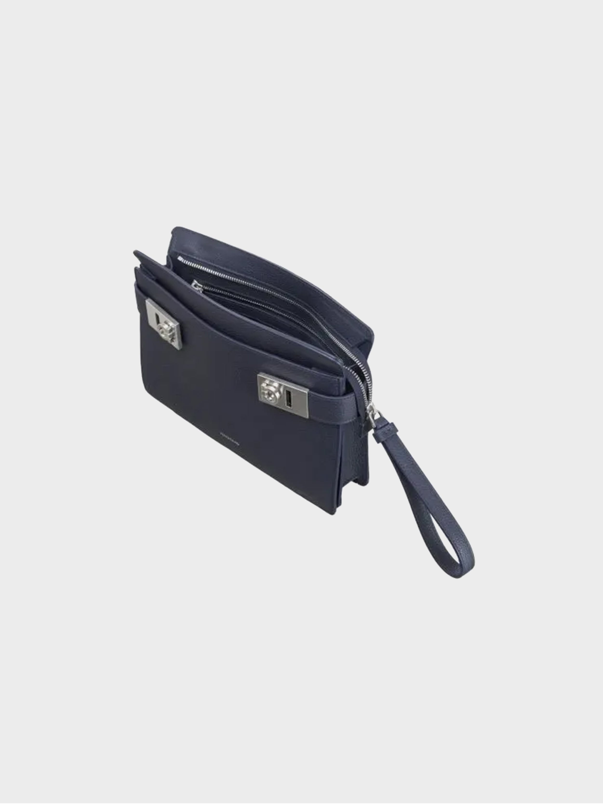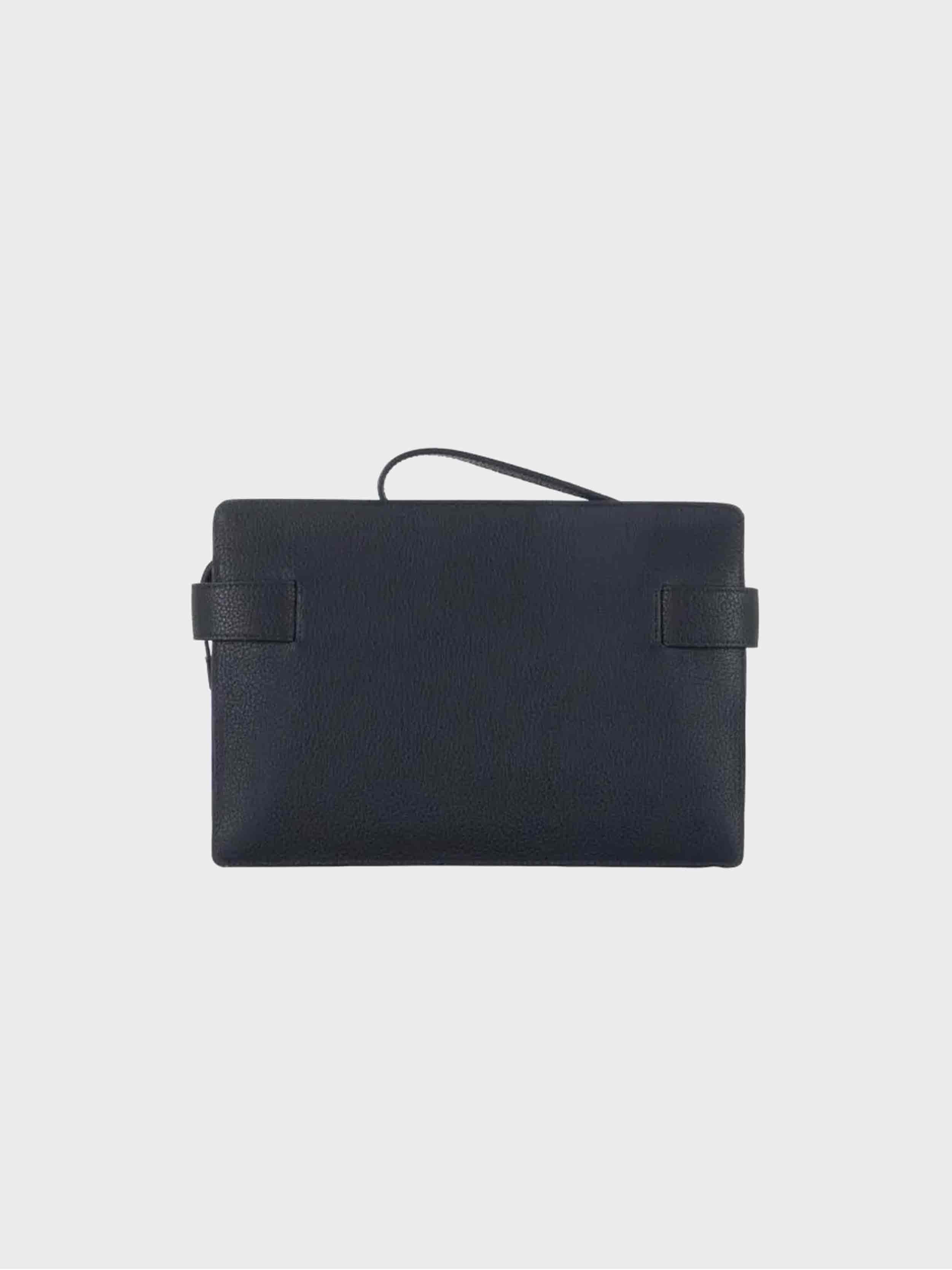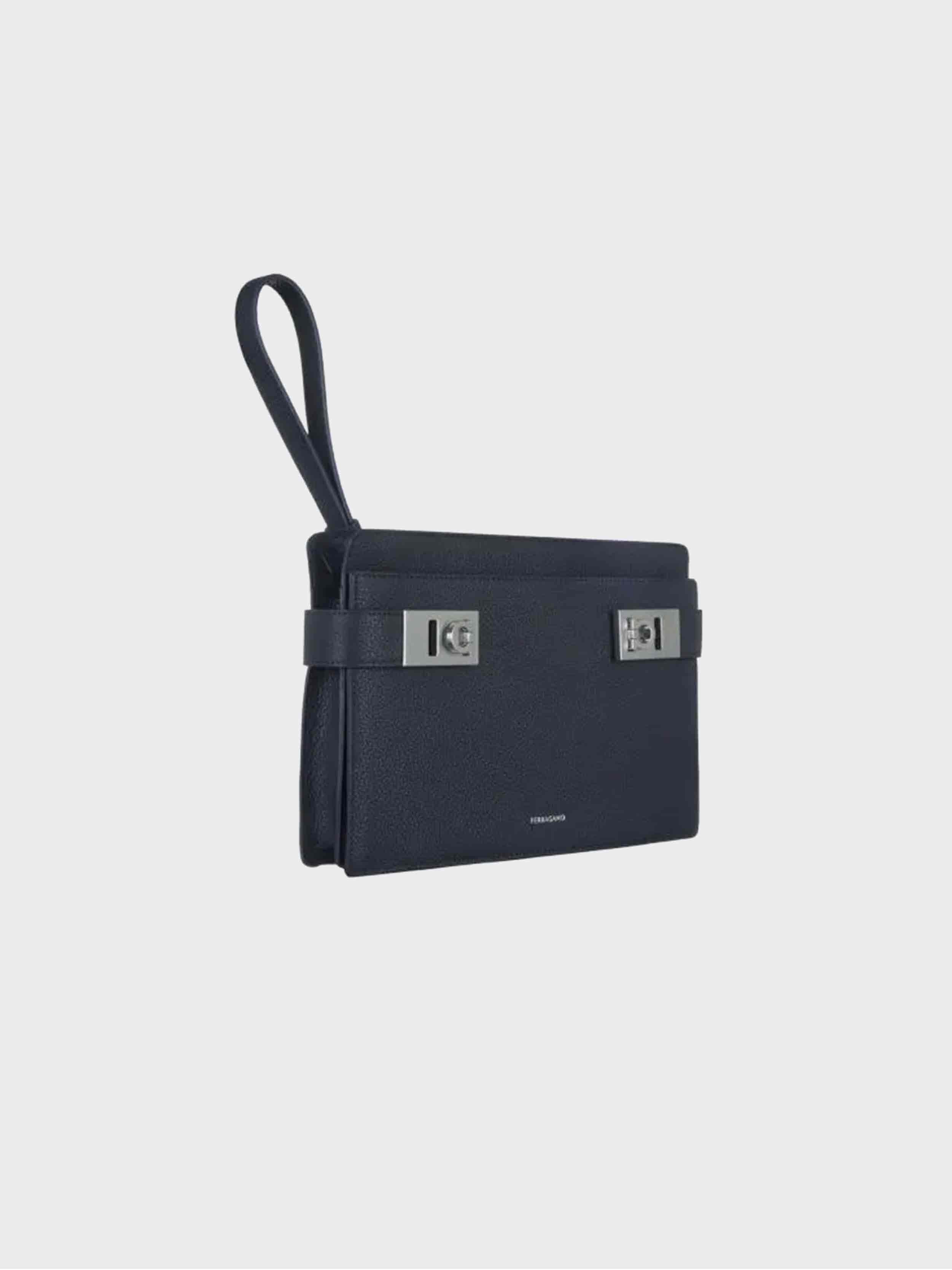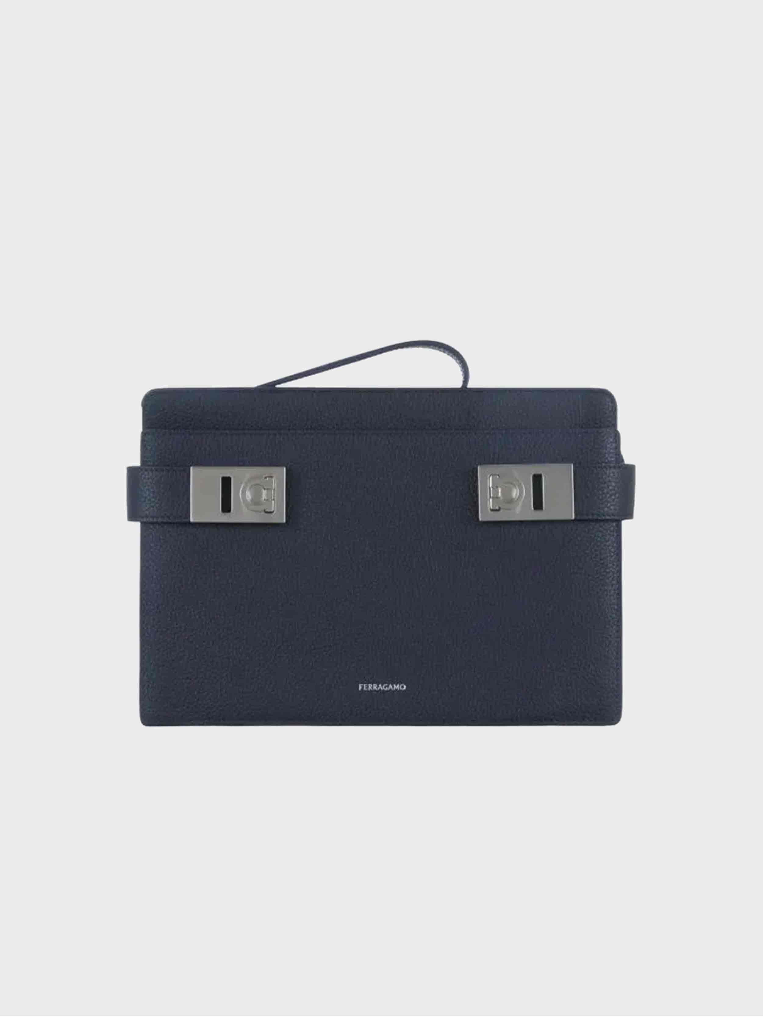 • For the modern man on the go, the Gancini buckle pouch by Ferragamo complements your busy schedules and fits effortlessly into your summer wardrobe. Made from hammered calfskin, it features multiple compartments and is finished with two Gancini buckles and a long puller strap for easy wear.