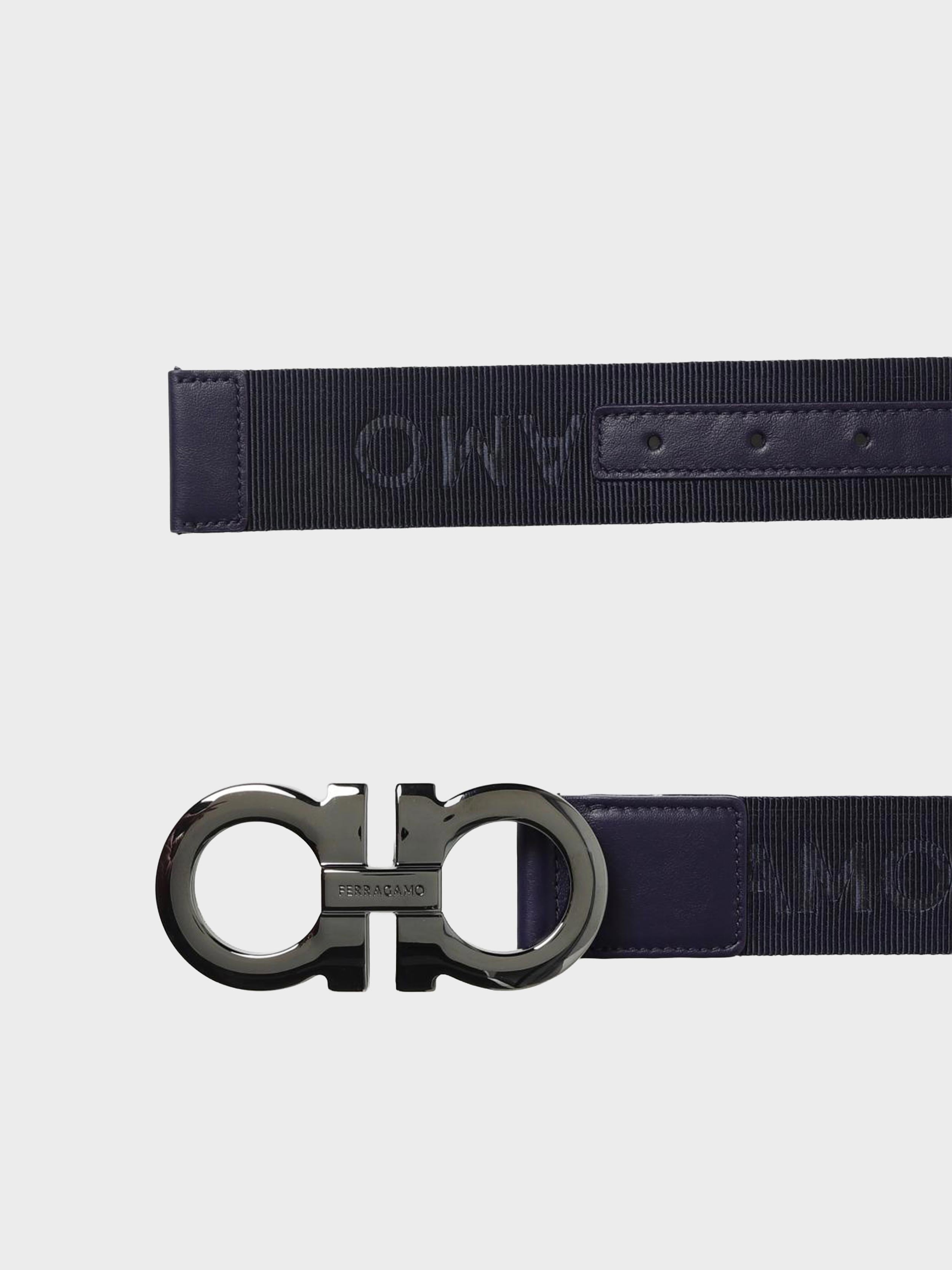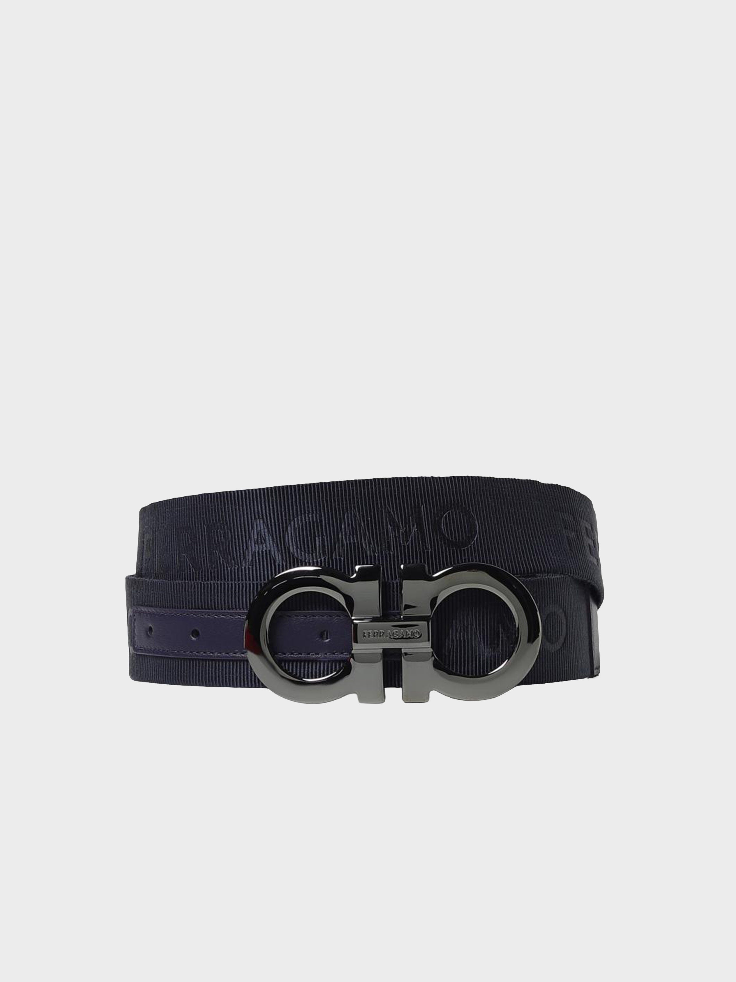 • Metropolitan allure and a casual edge define this belt crafted from jacquard tape with Ferragamo lettering.