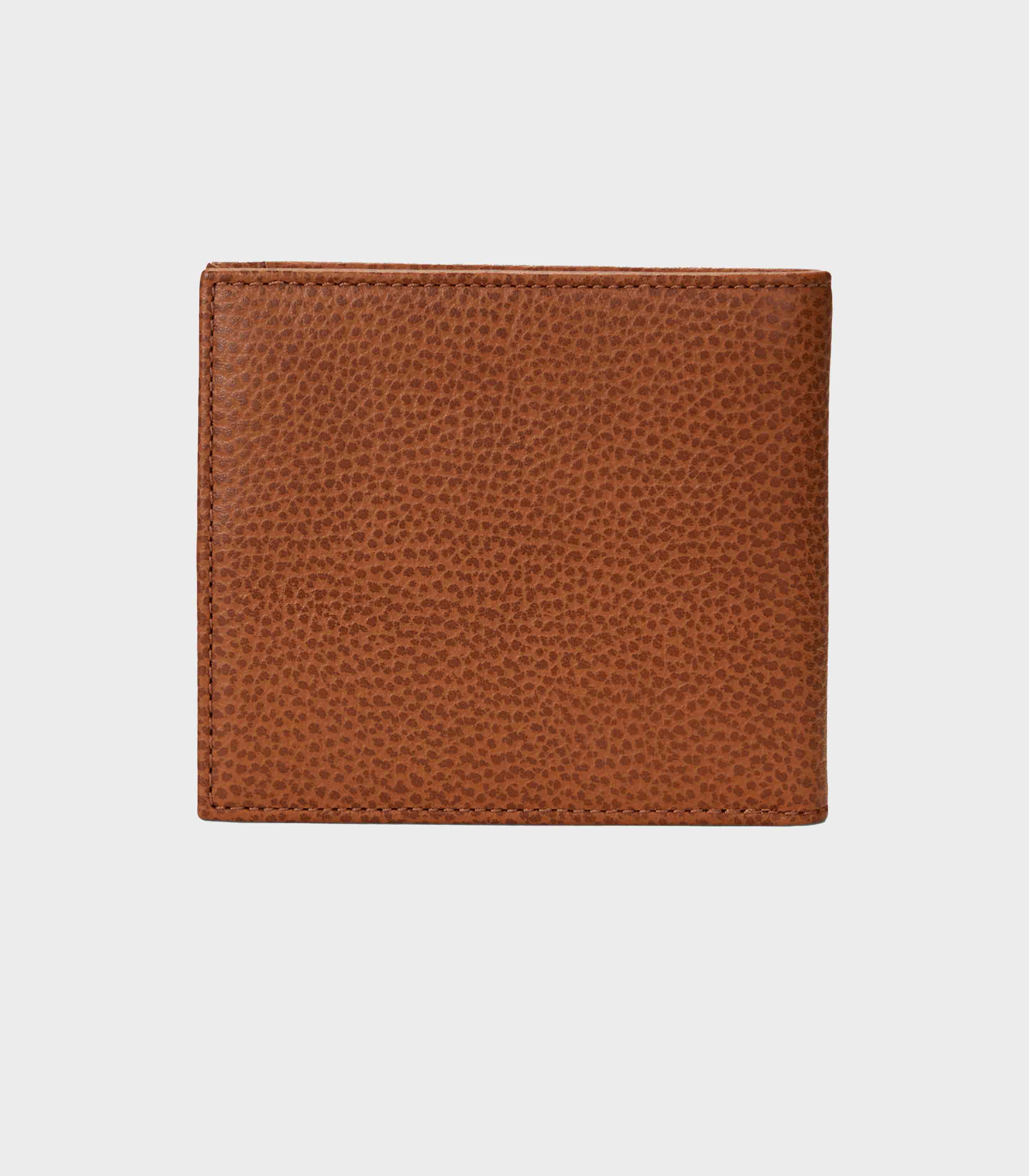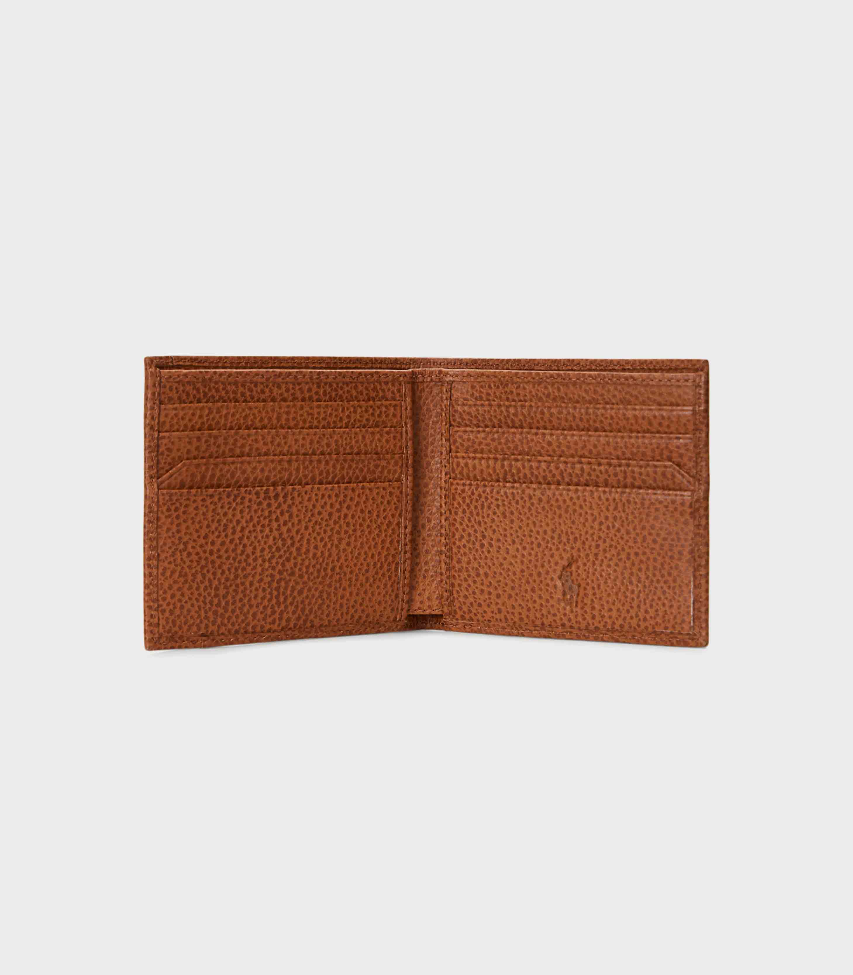 • Crafted with pebbled leather, this slender billfold wallet is designed with multiple pockets, including a card slot at the front.
