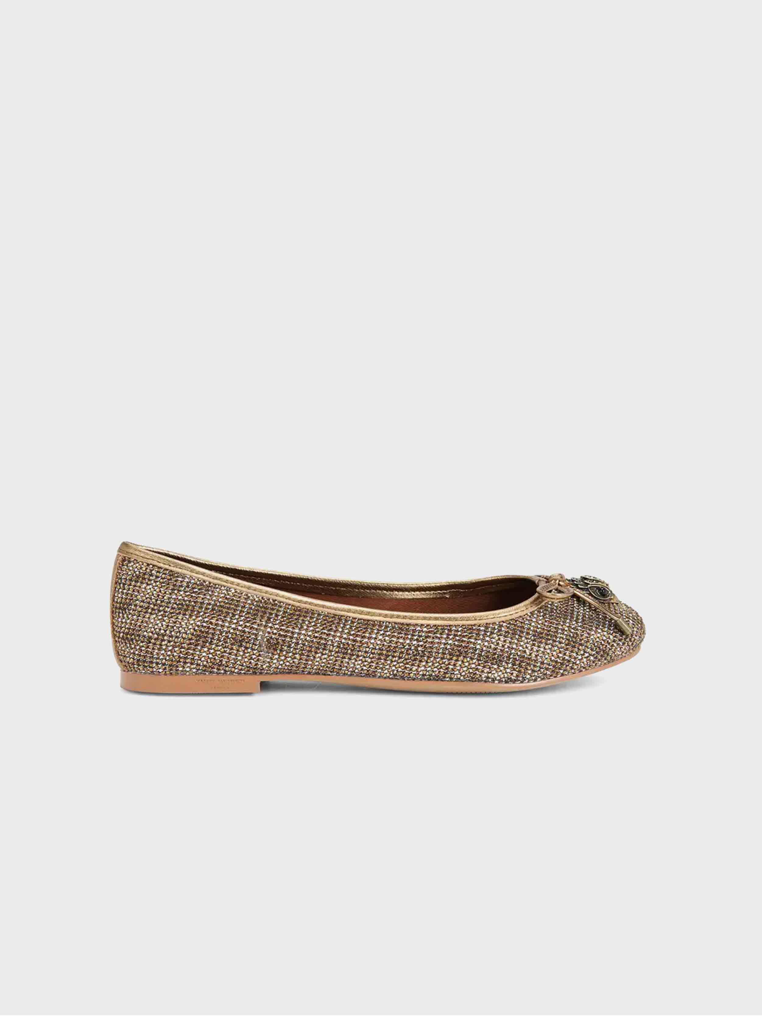 • The Eagle Ballerina is a slip-on flat with a beige houndstooth upper with bronze crystals.