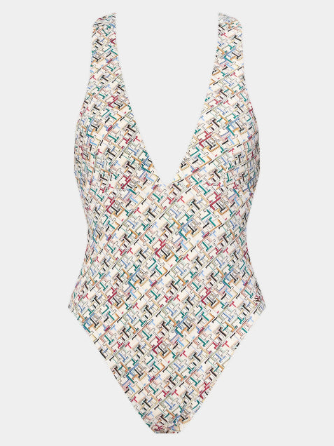 Tommy hilfiger - plunge one piece , s , th multi monogram calico , style uw0uw05273