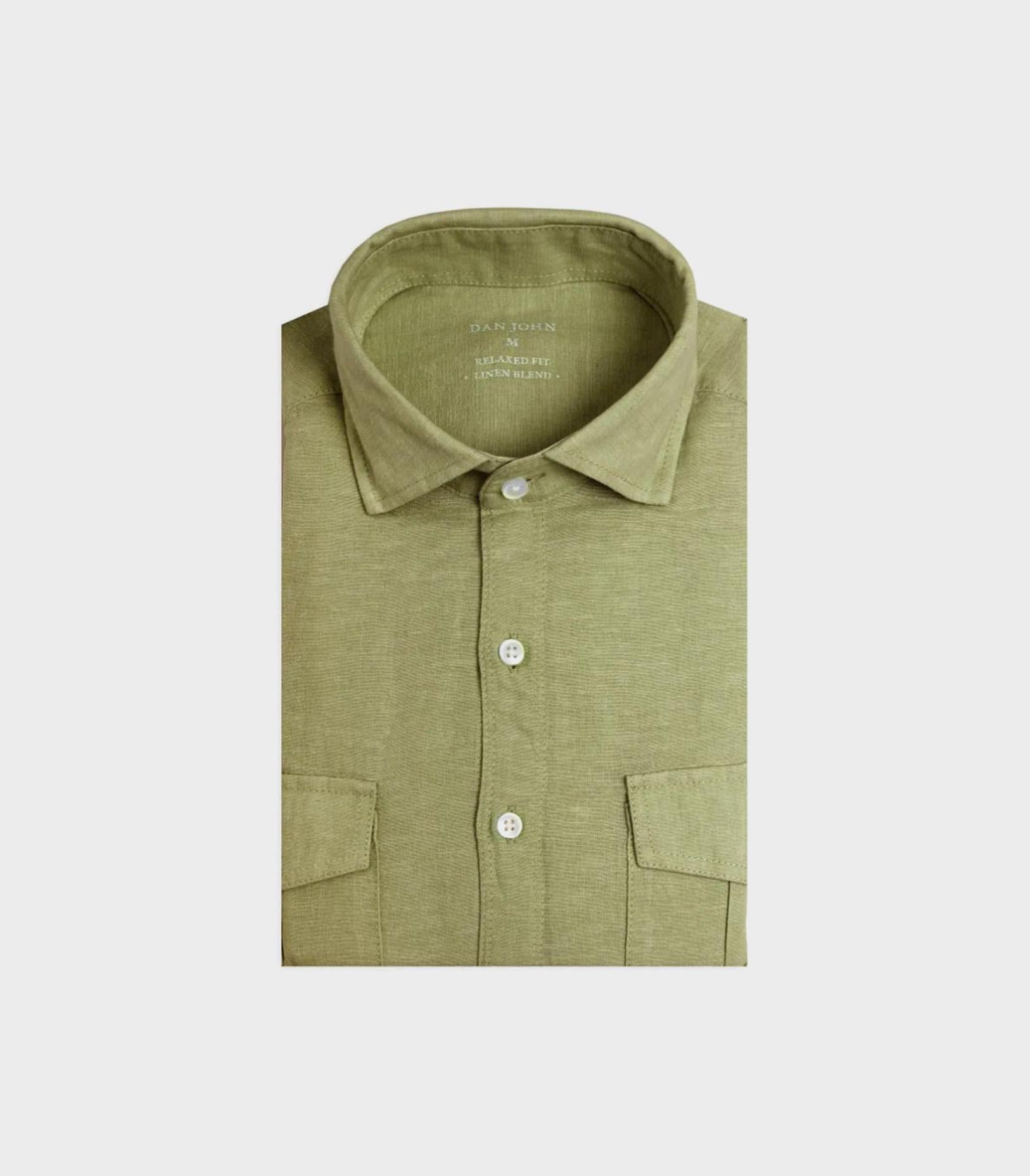 • Dan John- Army Green Linen Blend Shirt With Chest Pockets