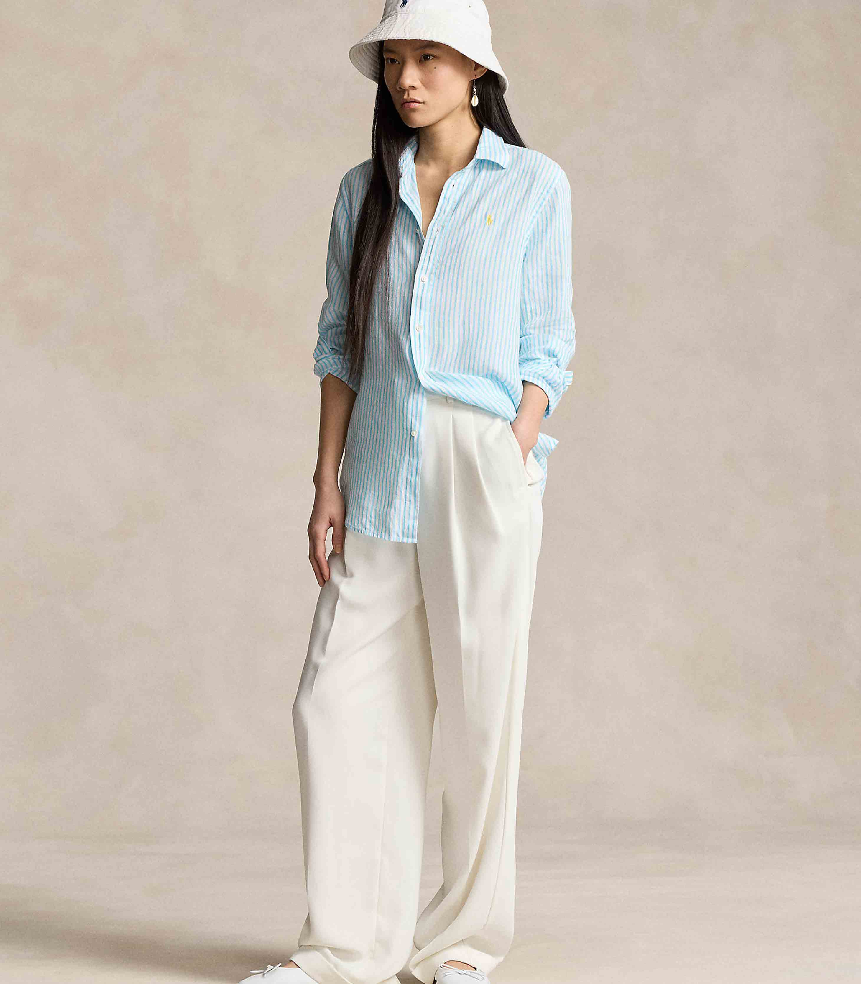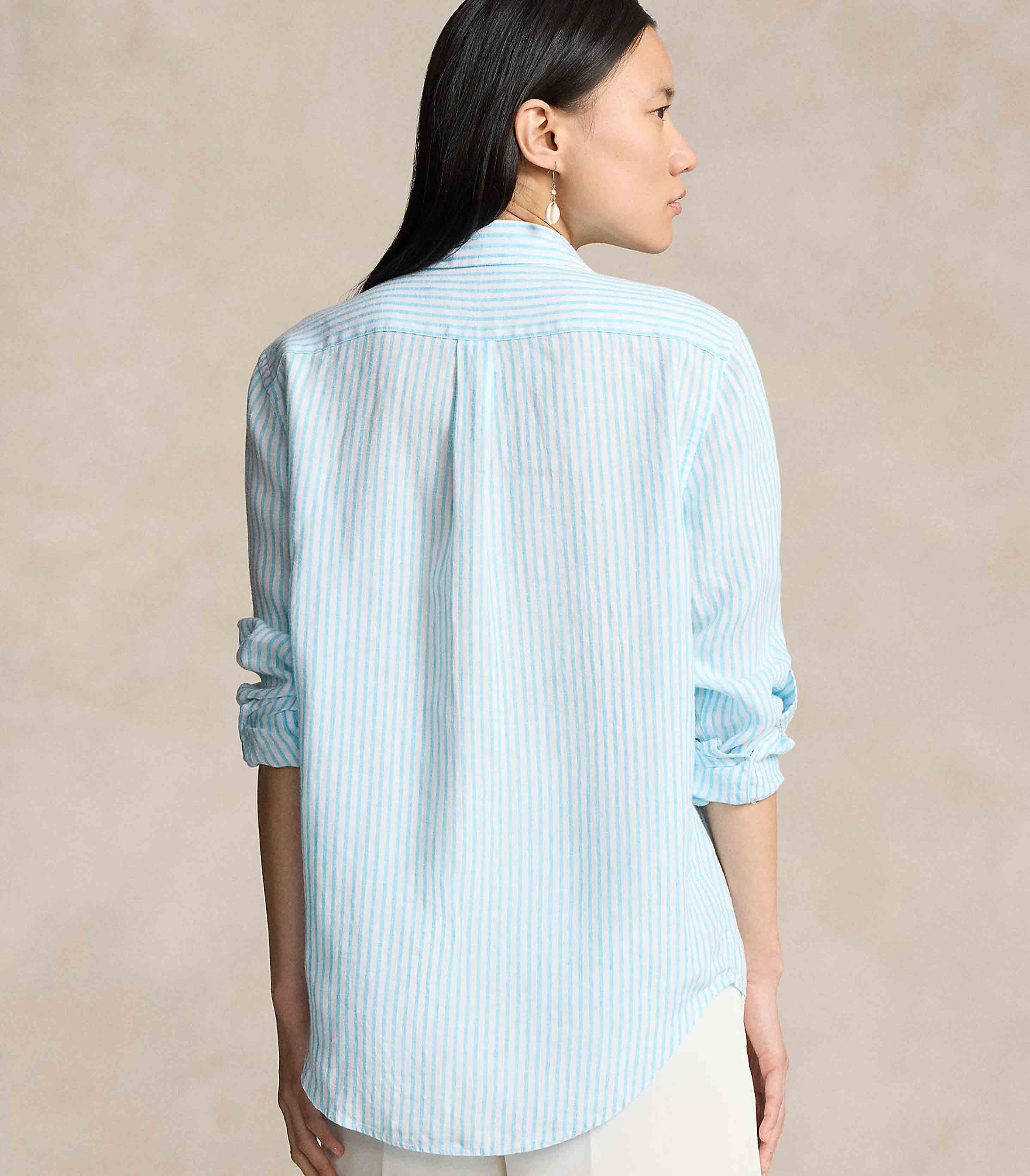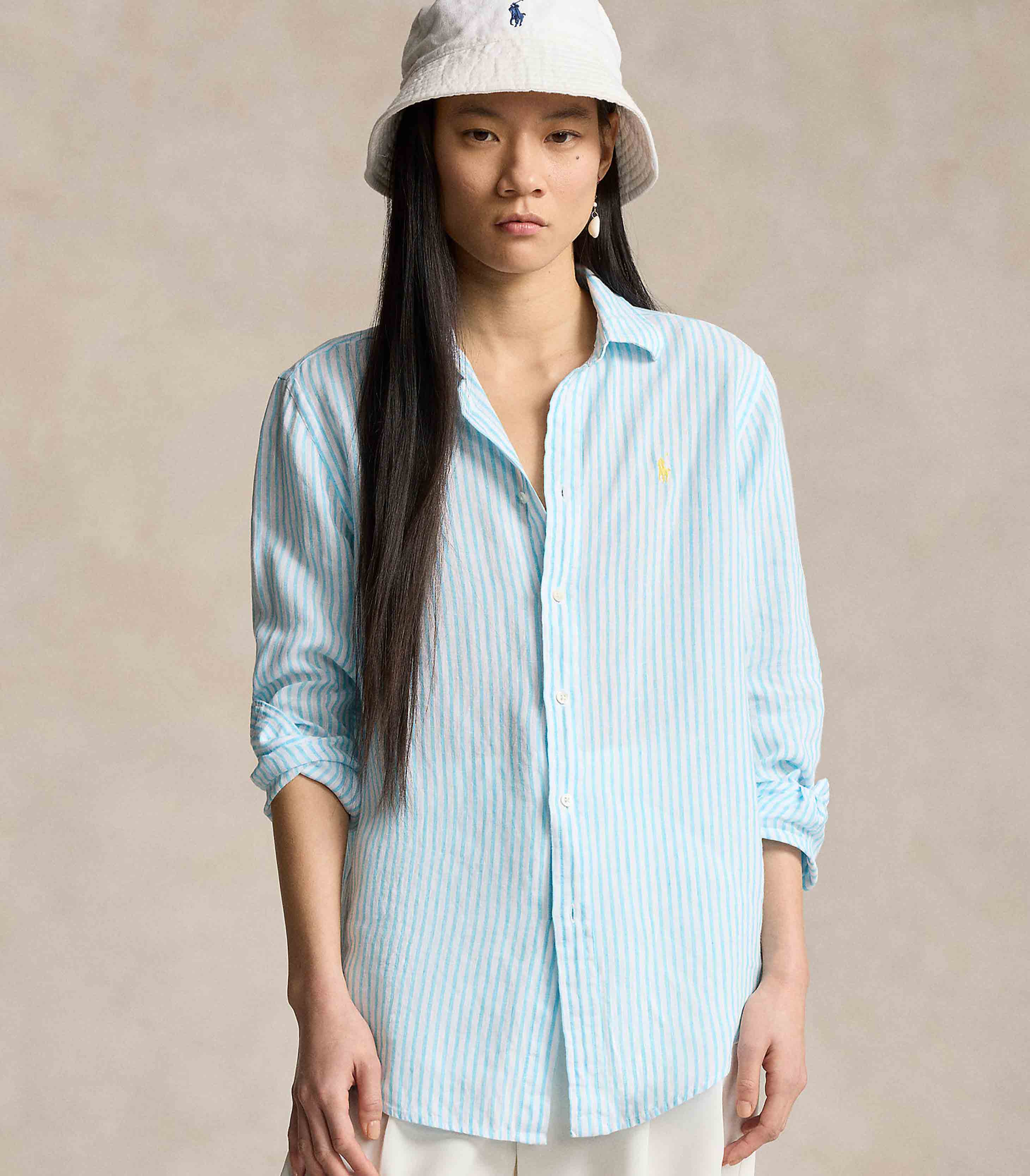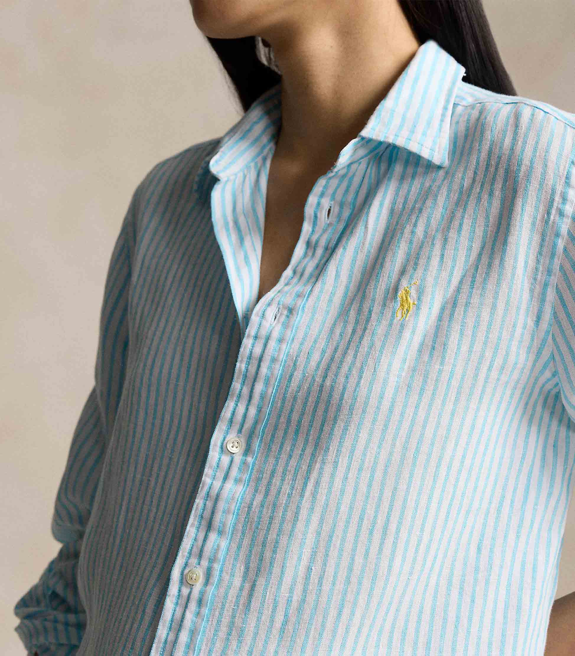 • Vertical stripes and lightweight linen meet a relaxed silhouette in this point collar shirt. Lustrous shell buttons and our meticulously embroidered Pony add smart finishing touches.