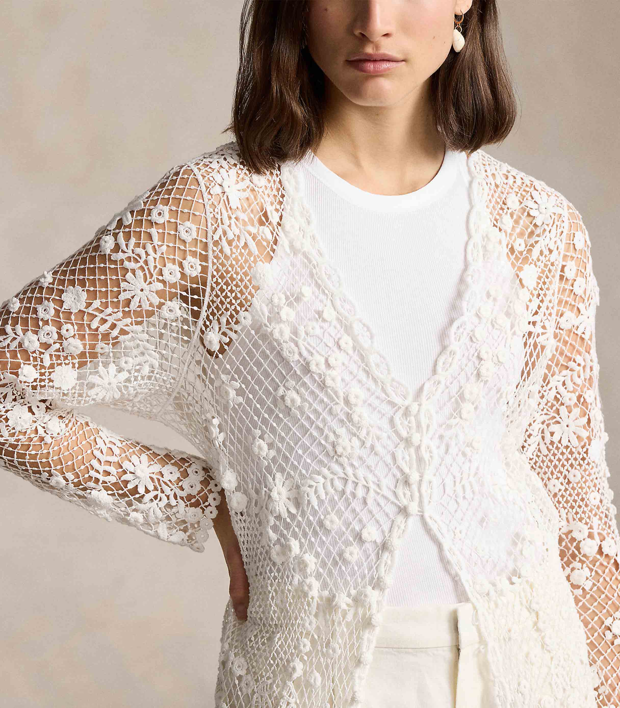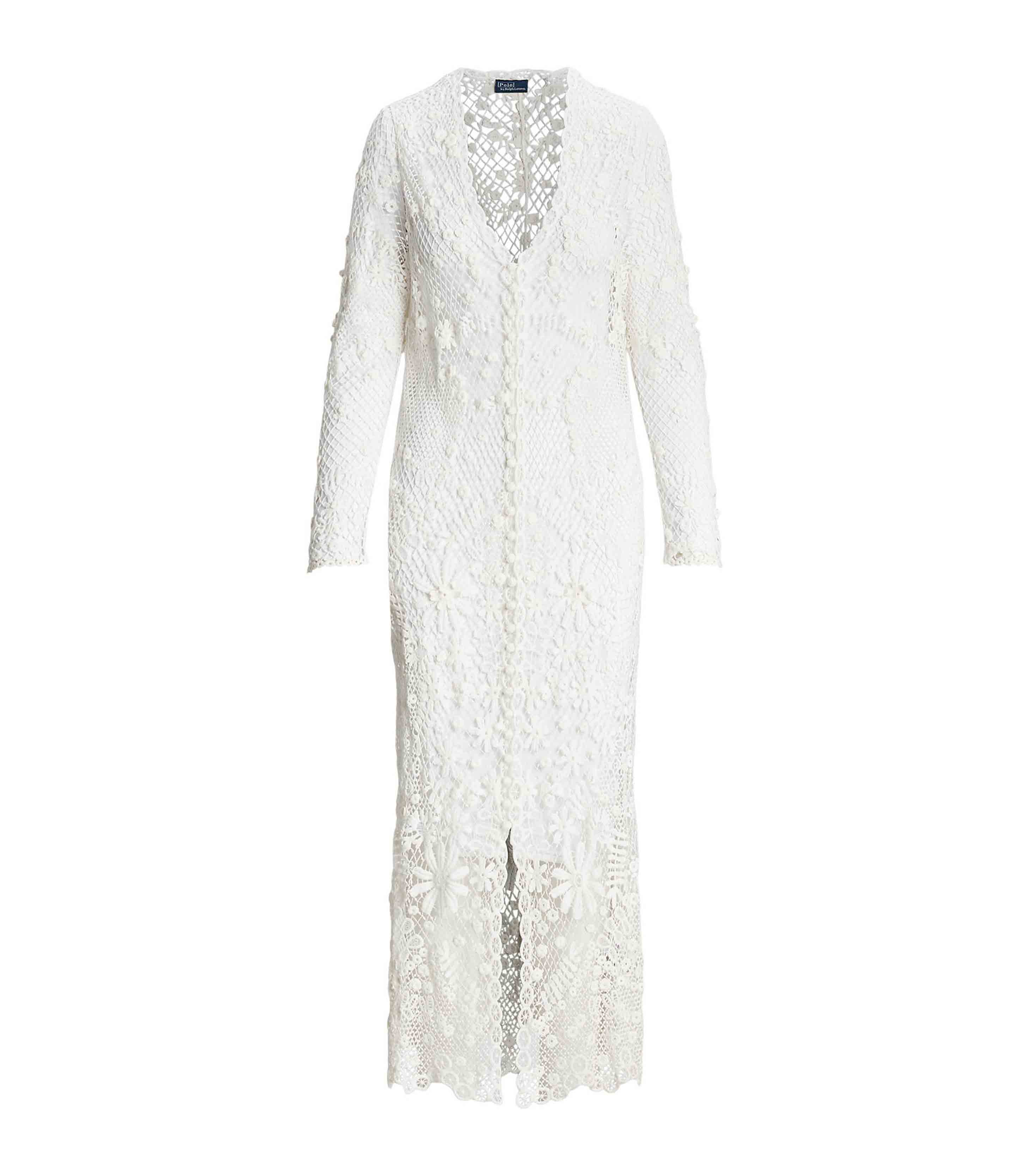 • Allover lace and embroidered florals come together to create this full-length duster, which is designed with crocheted button-and-loop closures at the front.