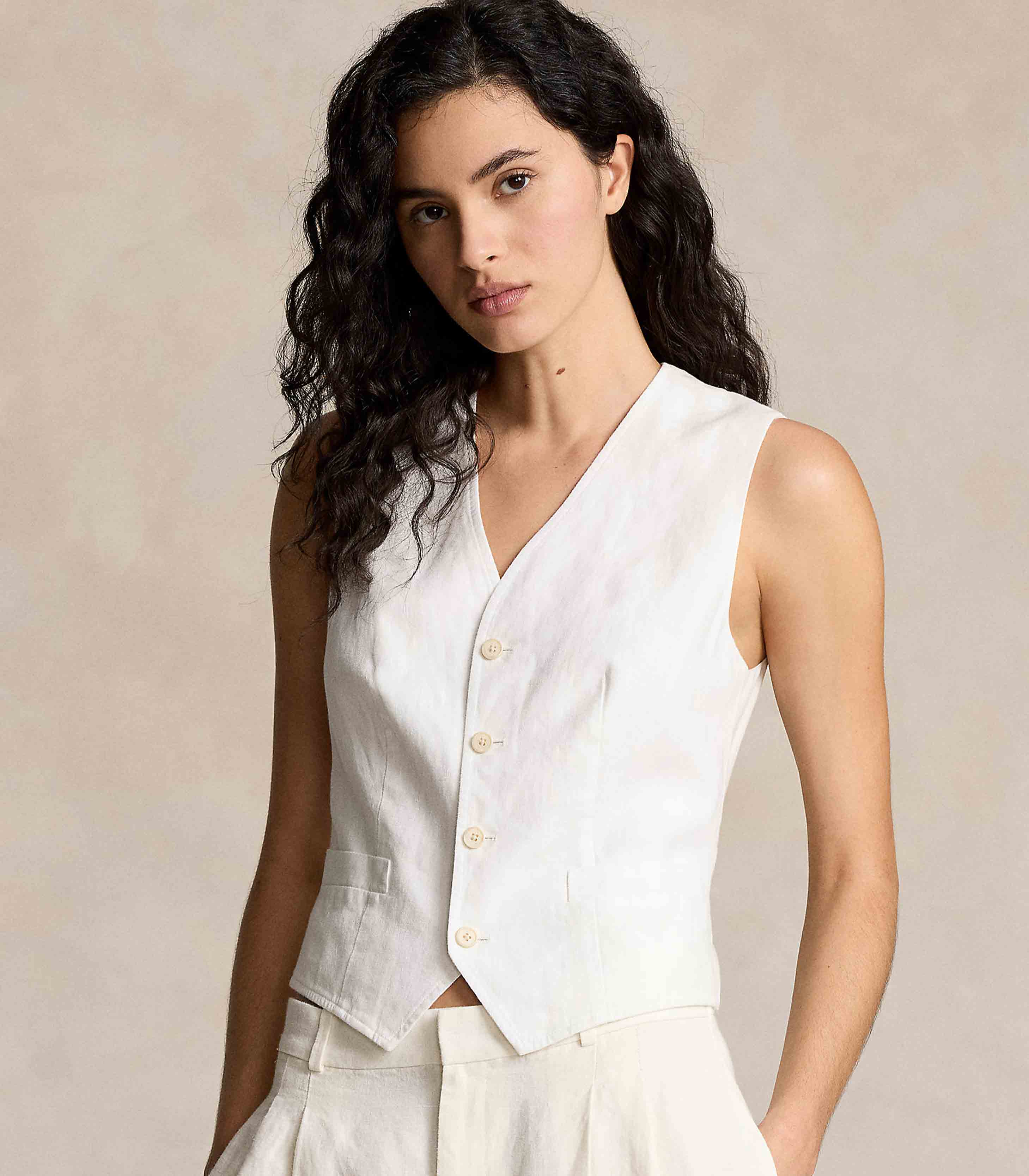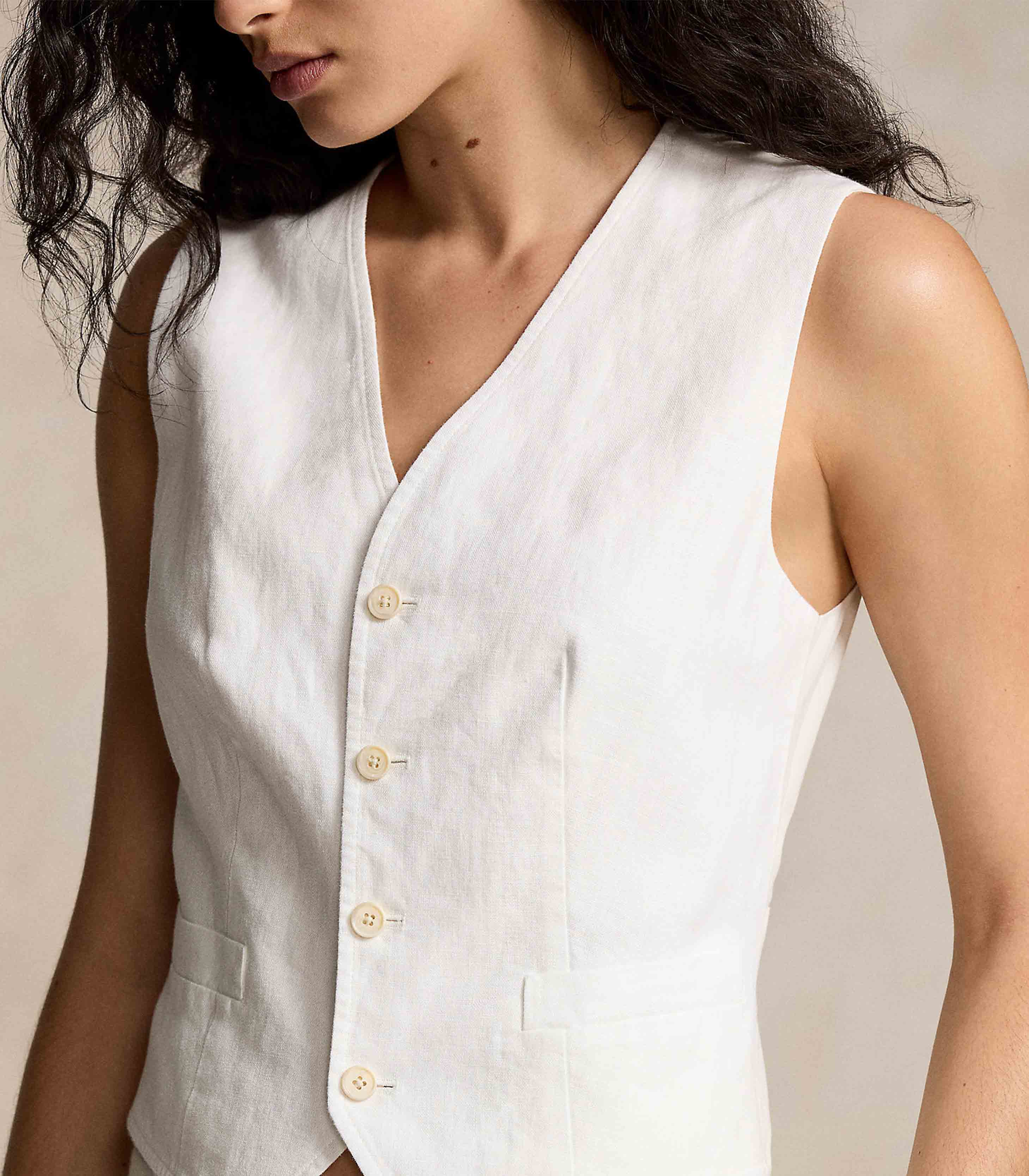 • V-neck. Buttoned placket. Sleeveless silhouette. Two front waist welt pockets.
