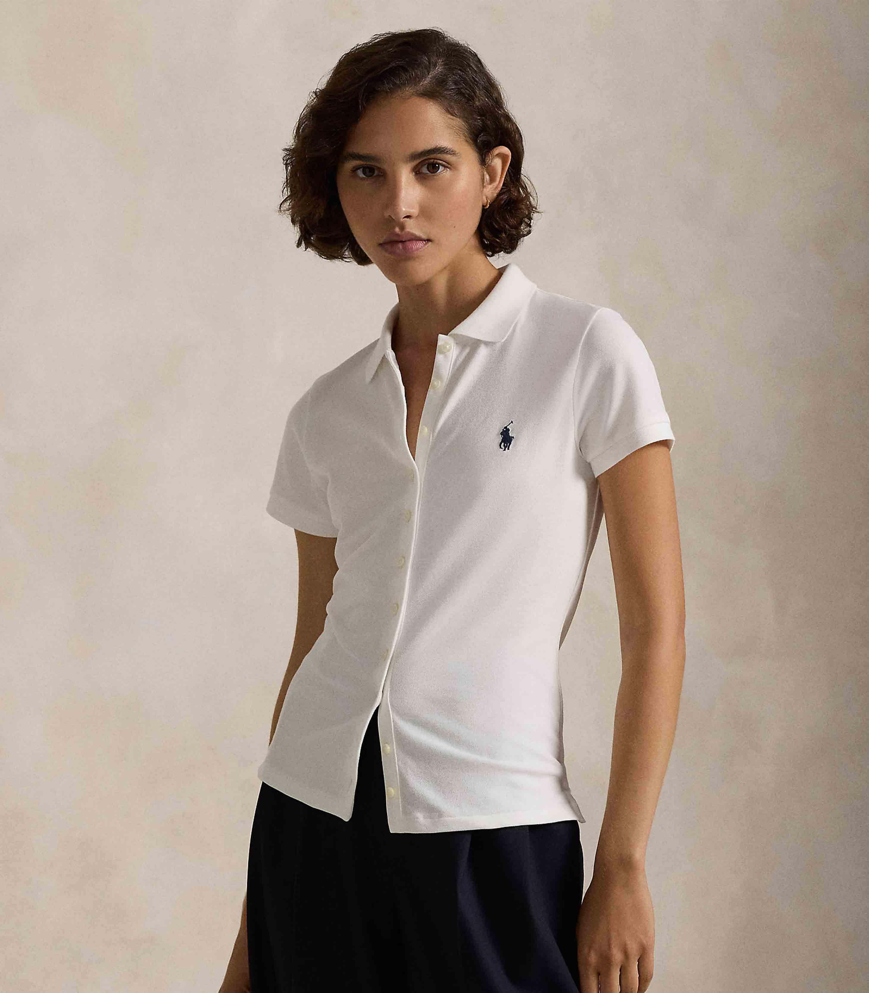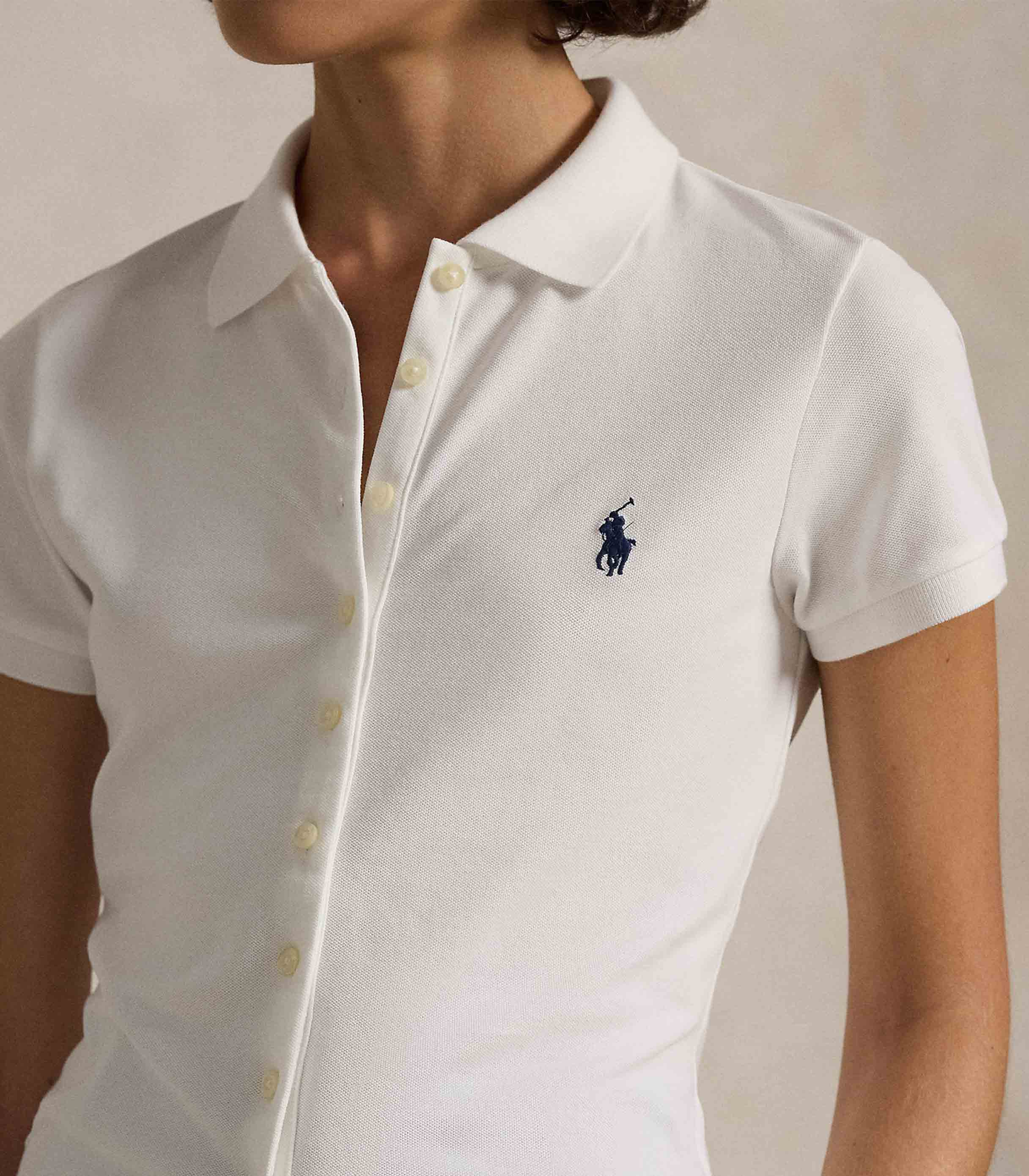• Polo collar. Five-button placket. Short sleeves with ribbed cuffs.