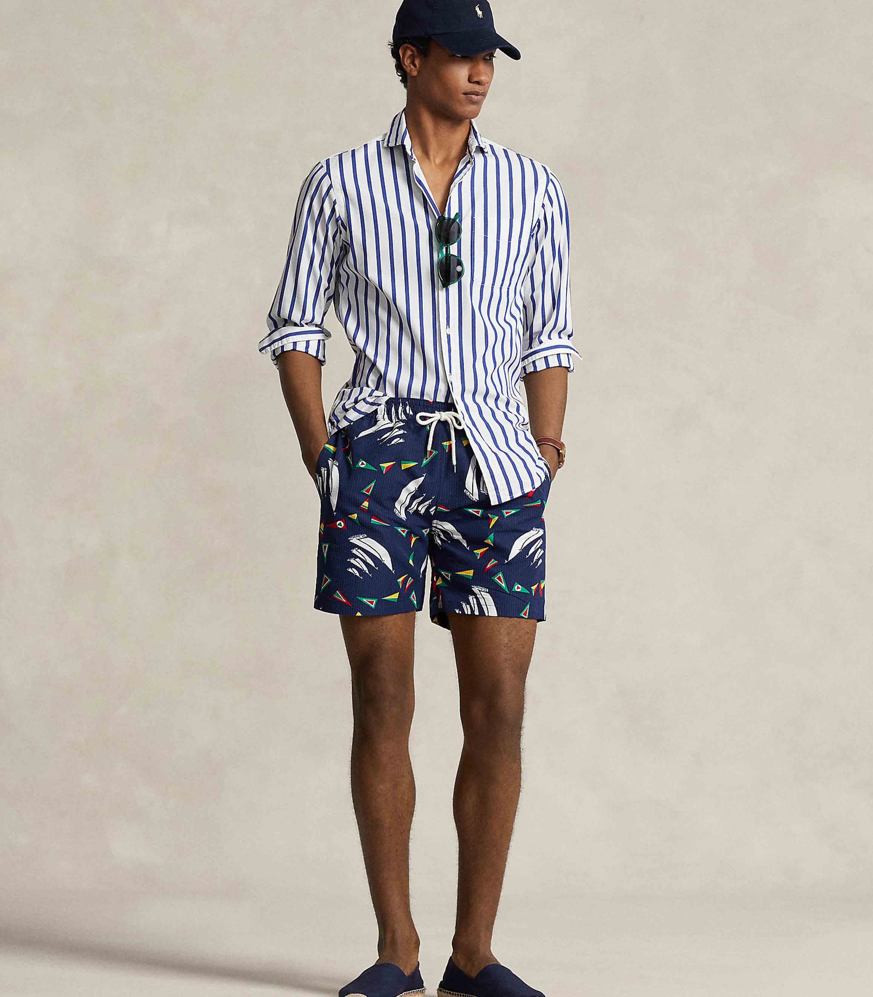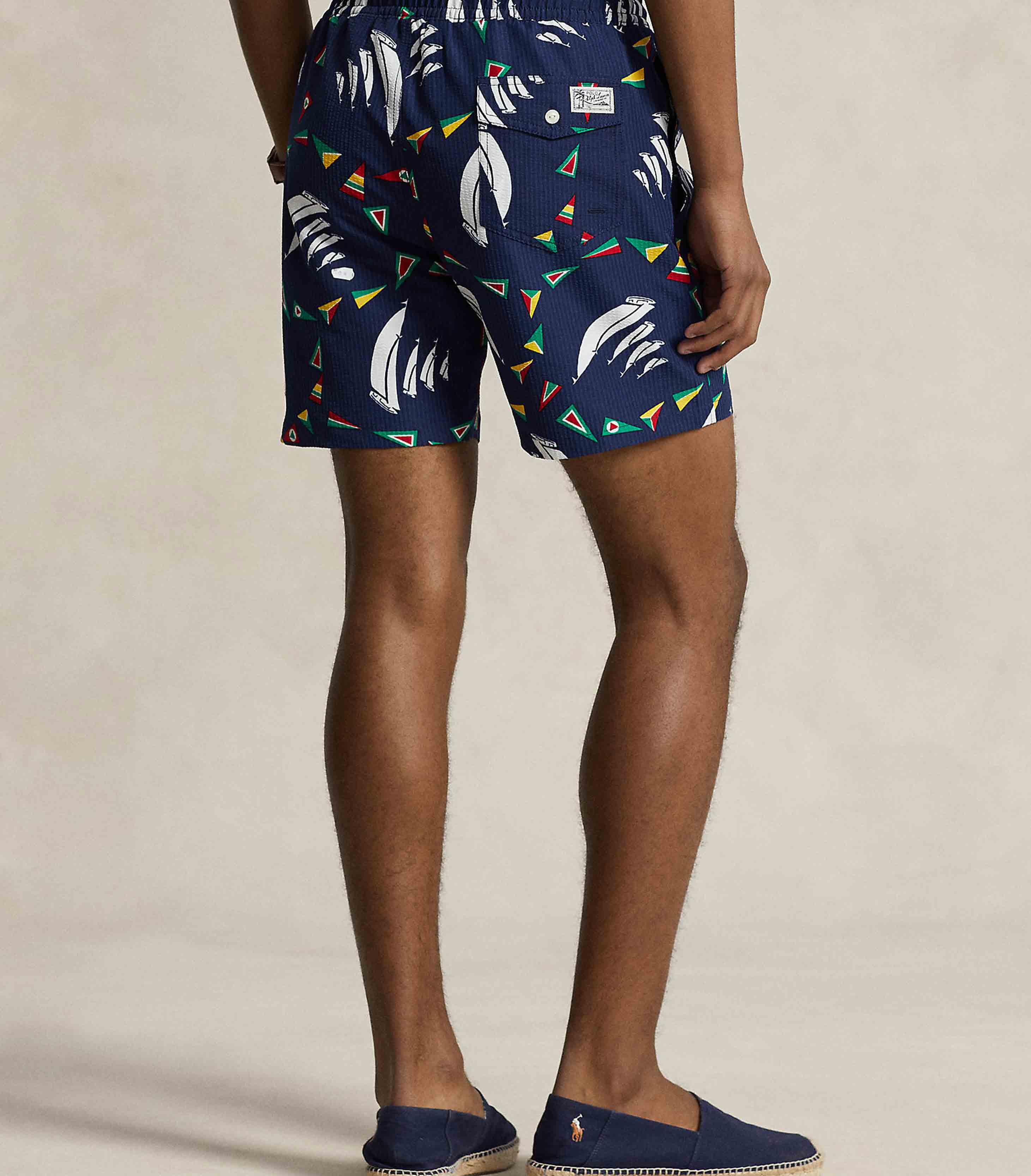 • These seersucker swim trunks feature a vintage-inspired nautical motif consisting of sailboats and flags.