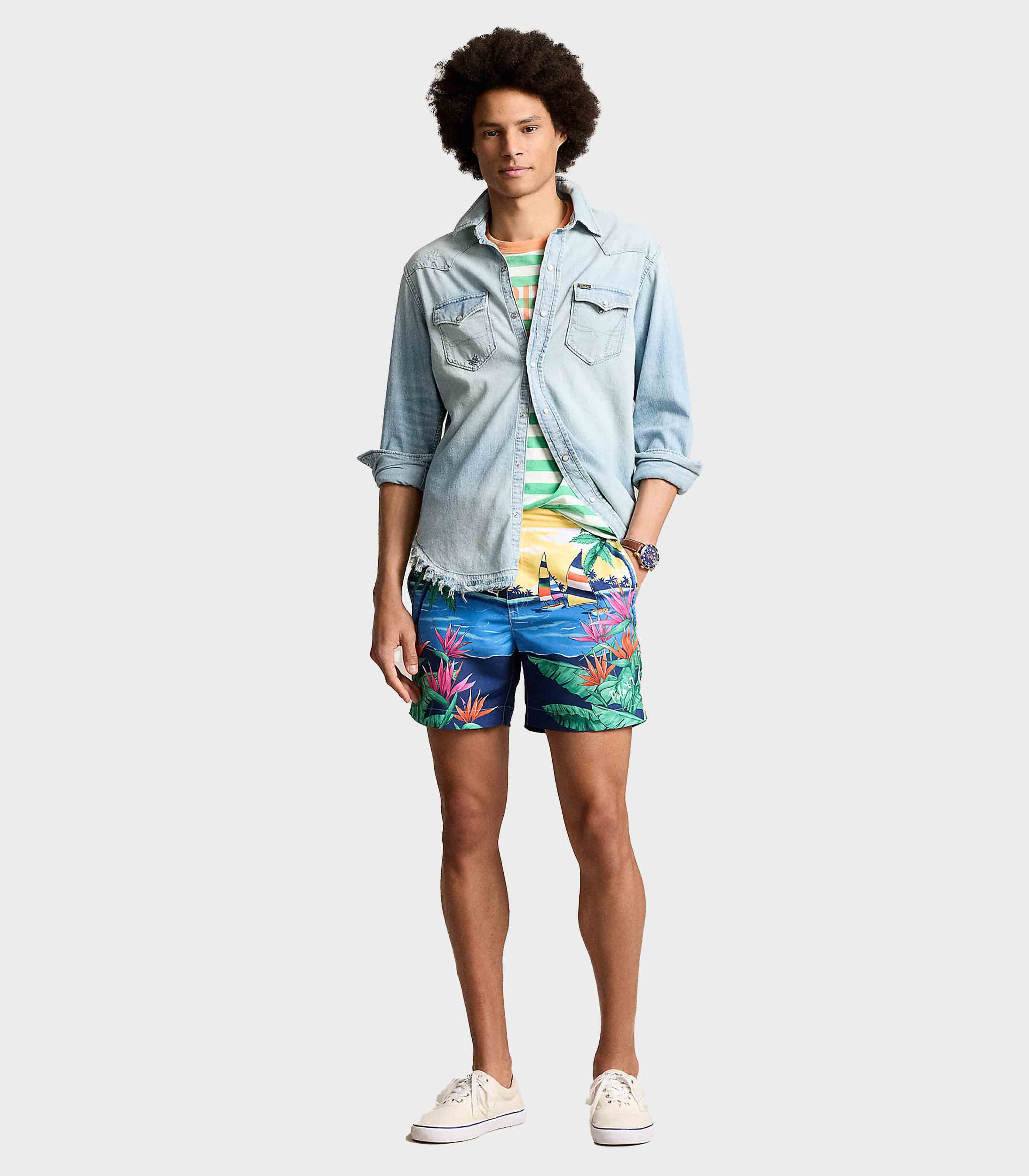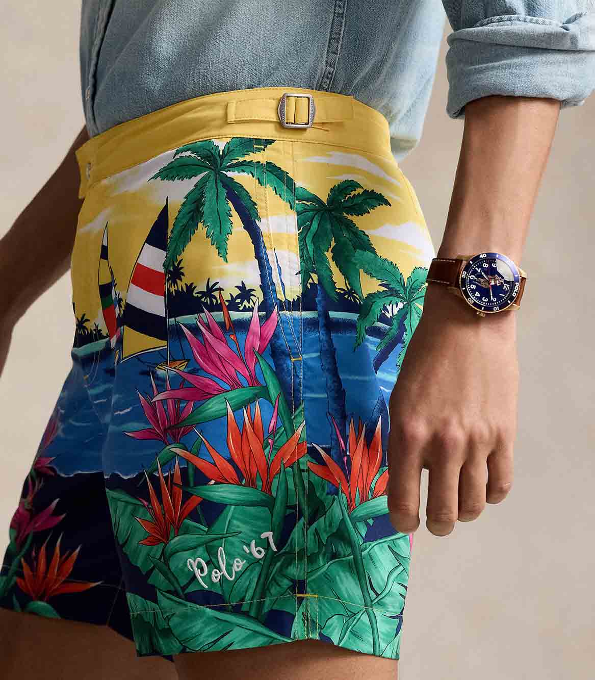 • Inspired by the silhouette of classic chino shorts, these swim trunks are built with adjustable waist tabs and mesh briefs to optimize comfort. They're crafted with recycled polyester and feature our "Polo '67" signature along side a vibrant-tropical motif.
