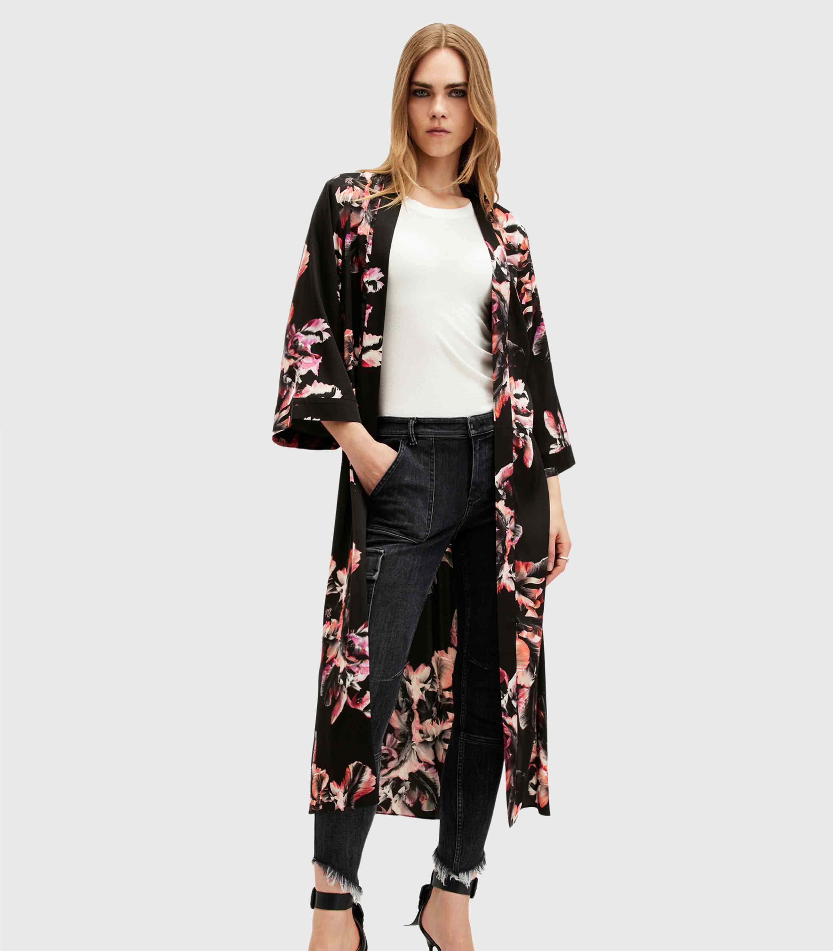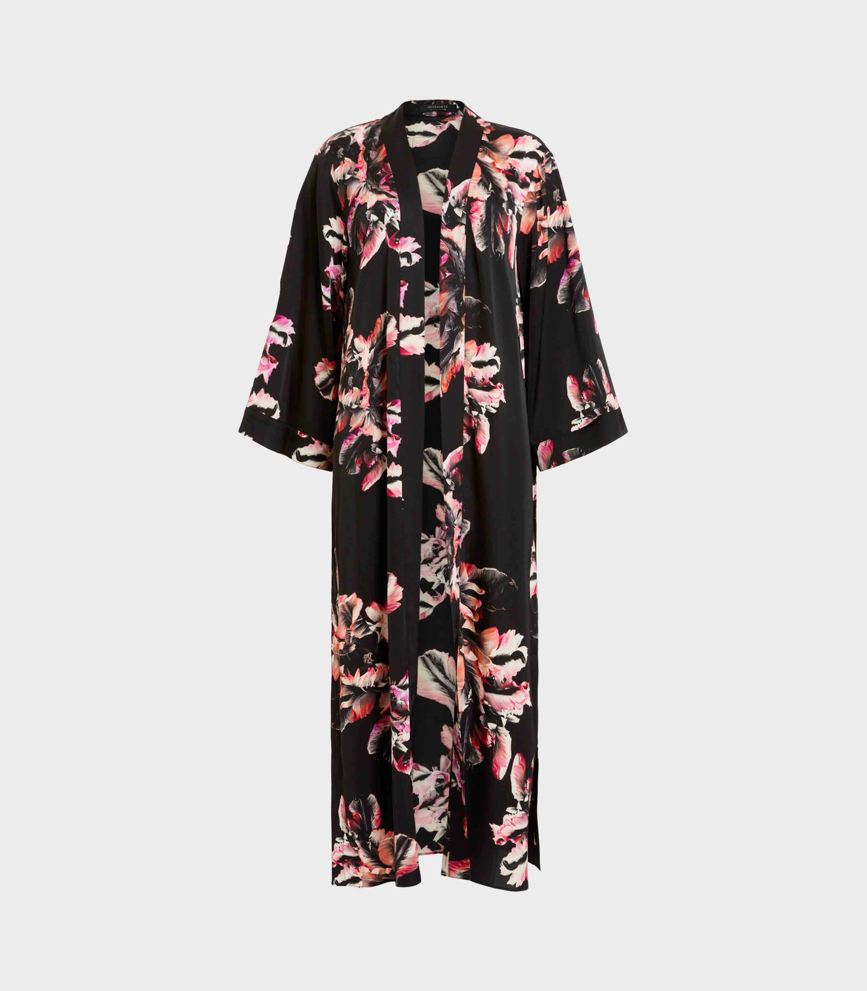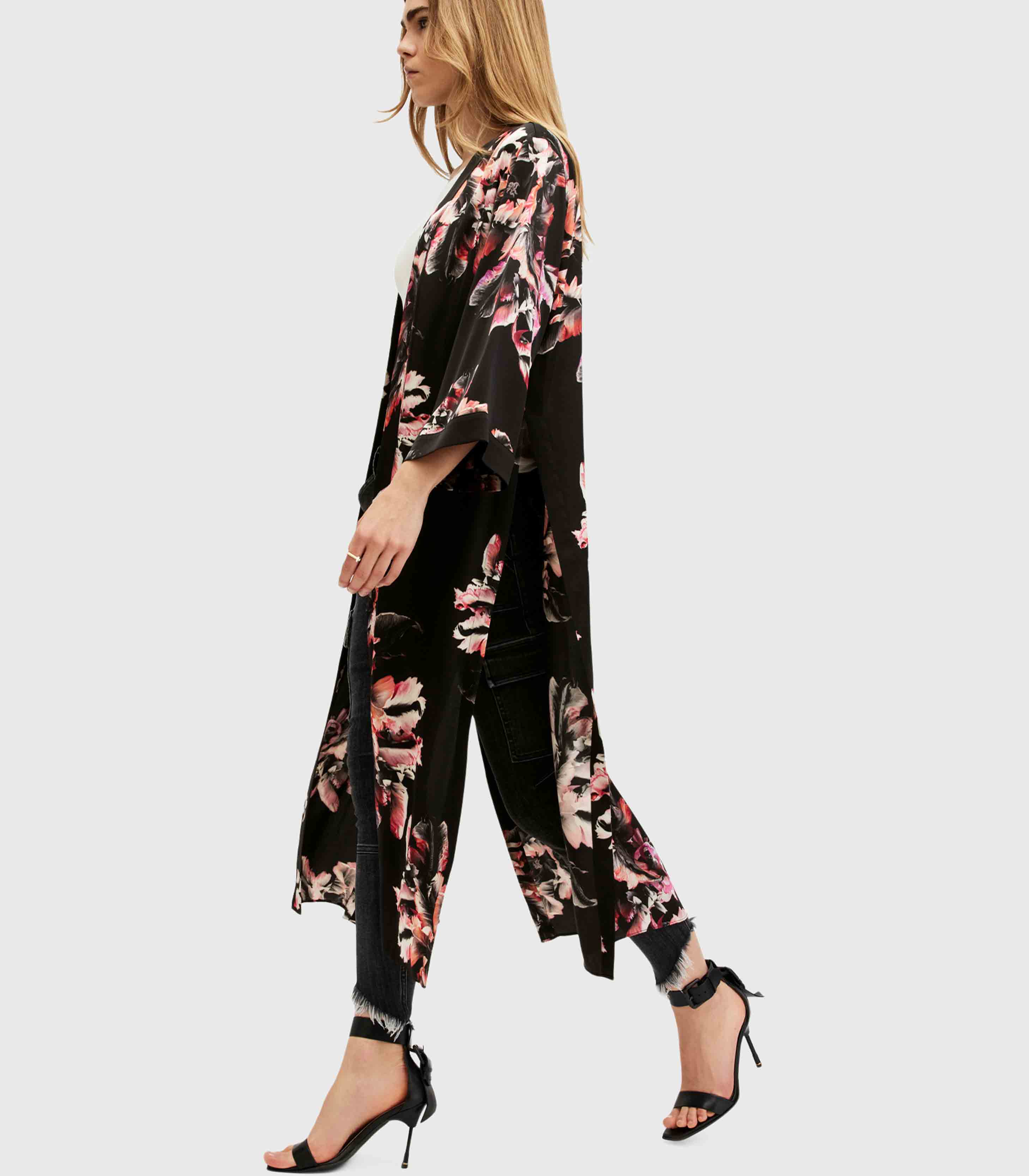 • Kimonos are a styling essential. The Carine features our new seasonal floral petal print on a lightweight base. Cut to a longline silhouette, the flowy structure moves with you.
