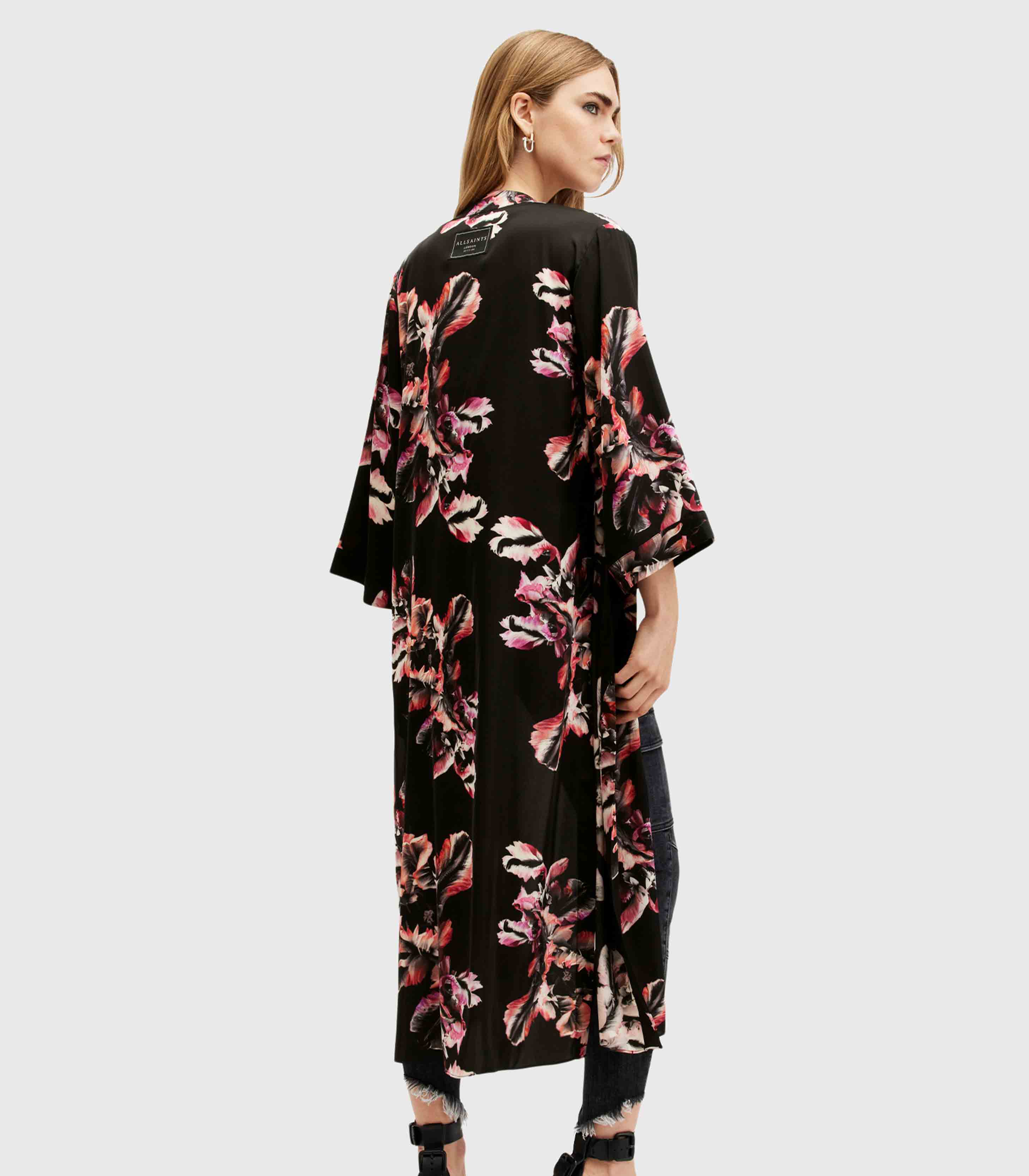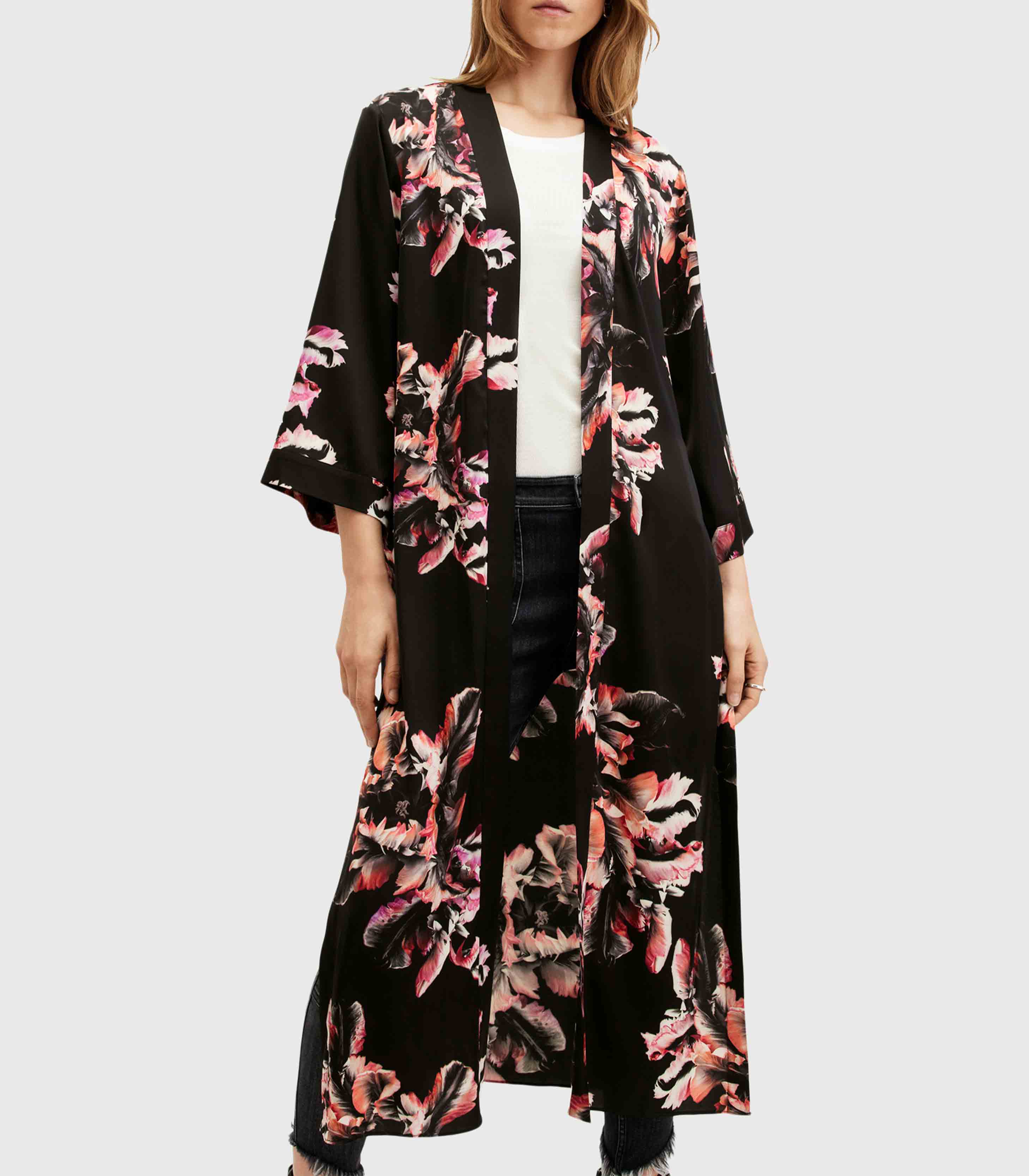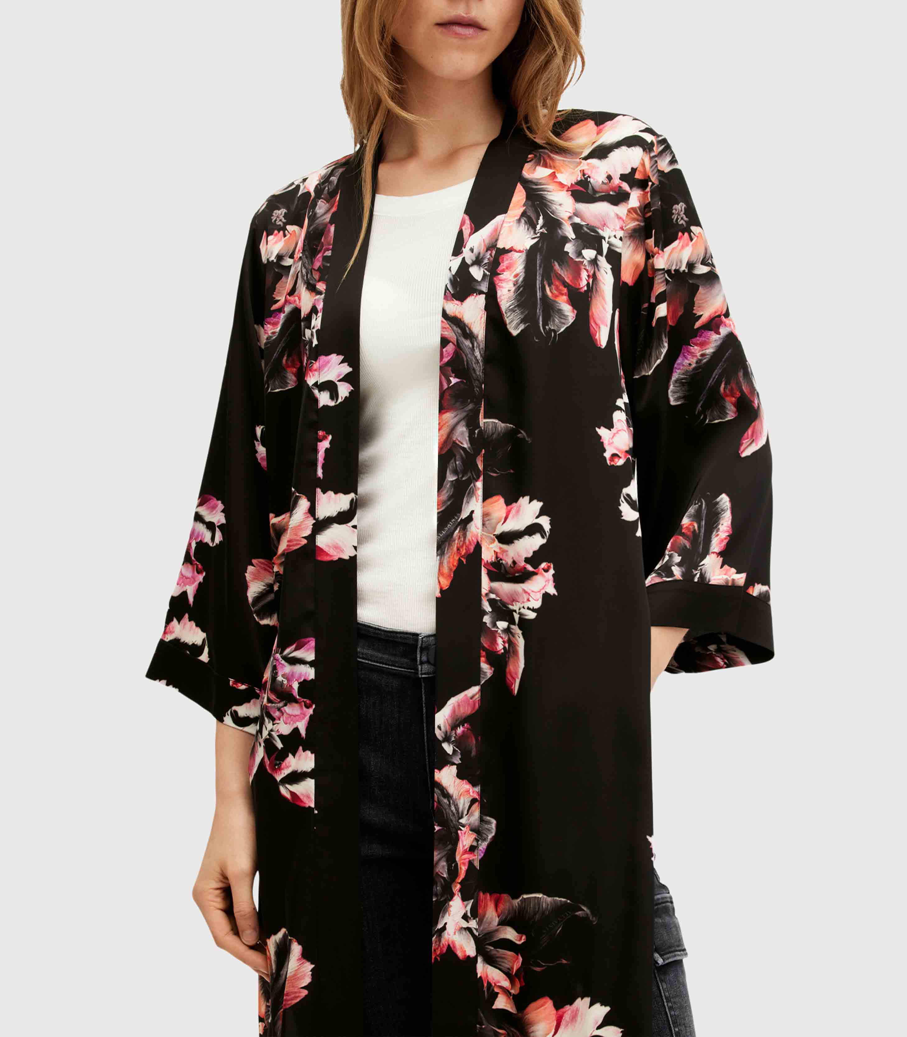 • Kimonos are a styling essential. The Carine features our new seasonal floral petal print on a lightweight base. Cut to a longline silhouette, the flowy structure moves with you.