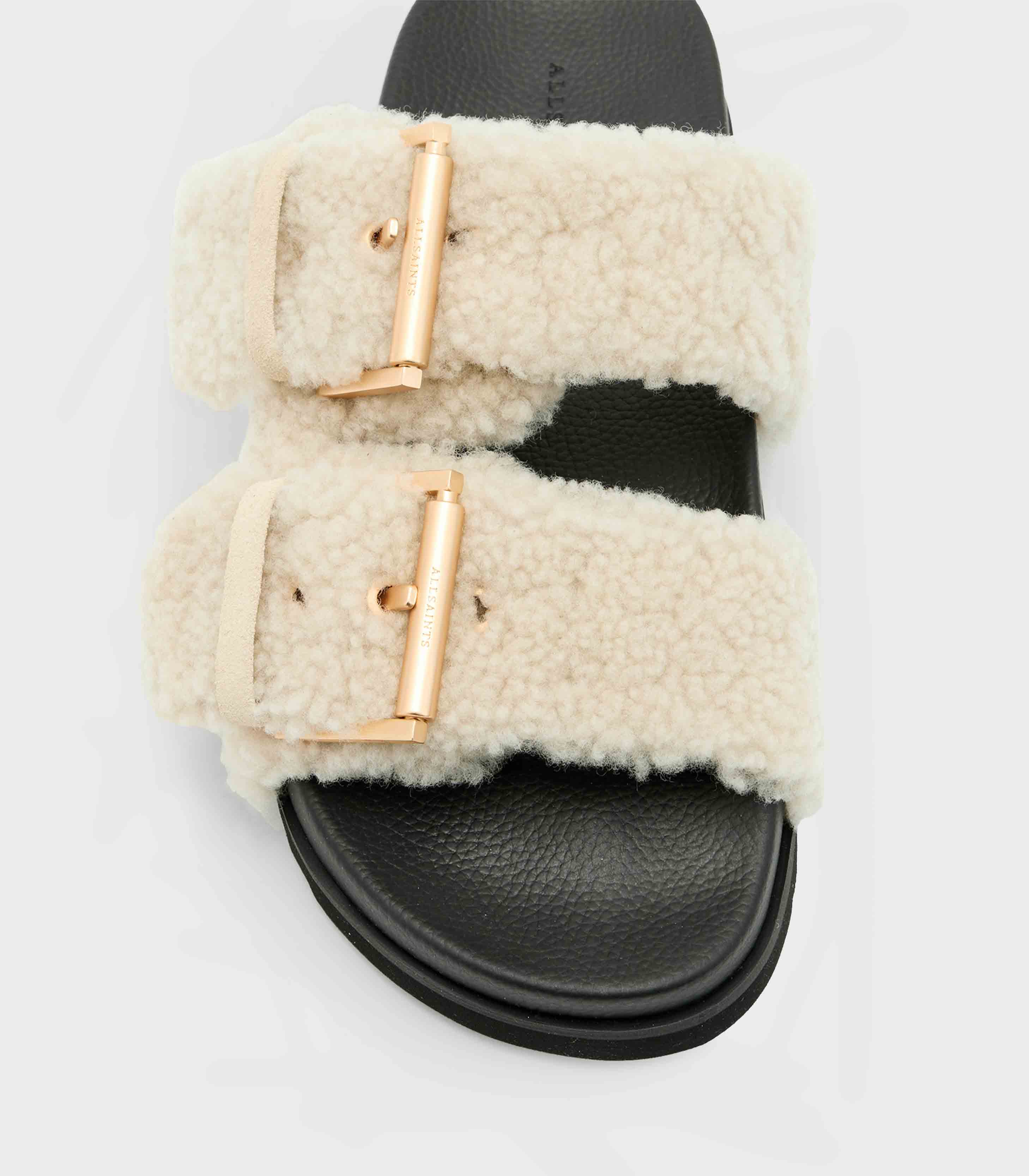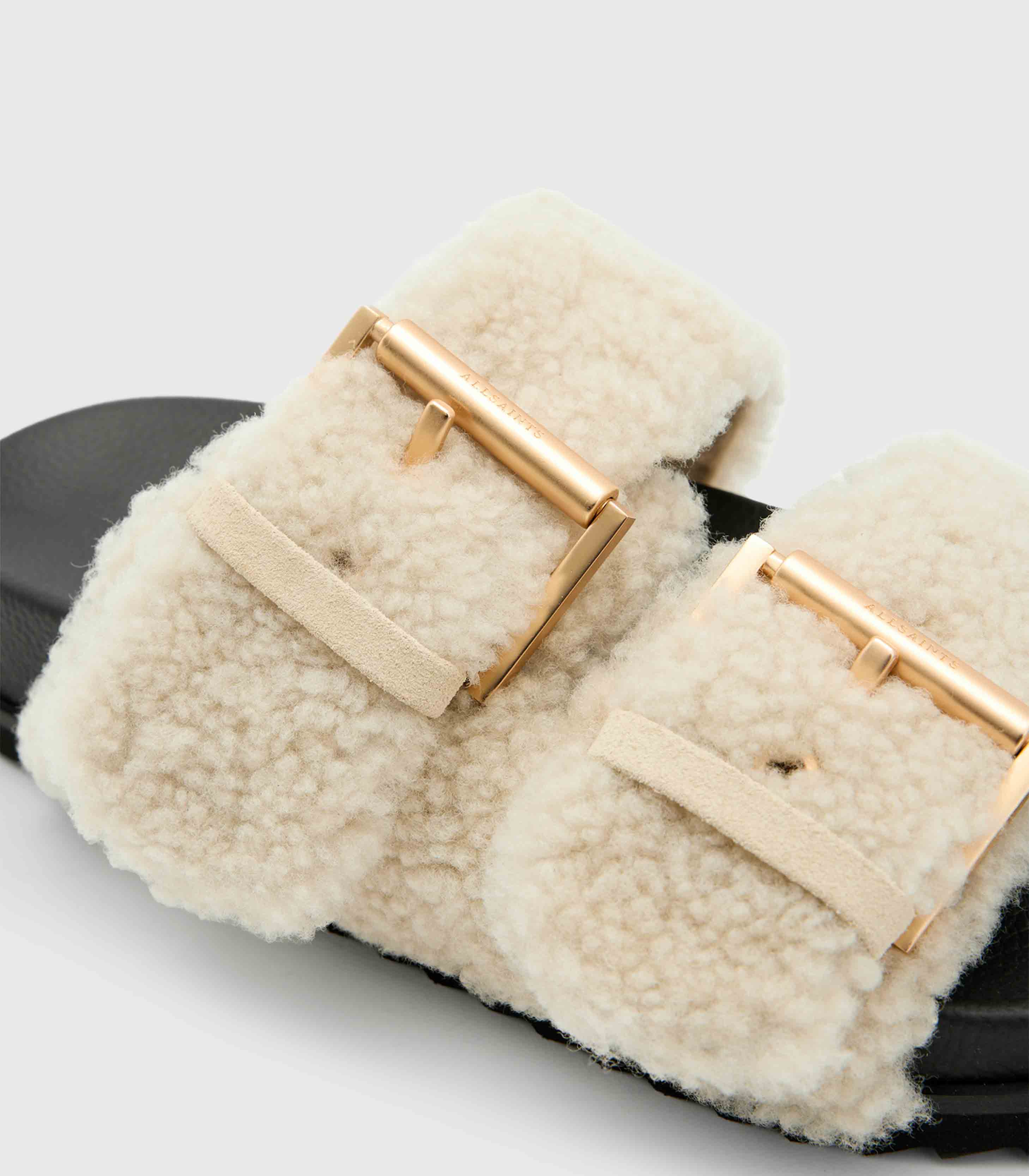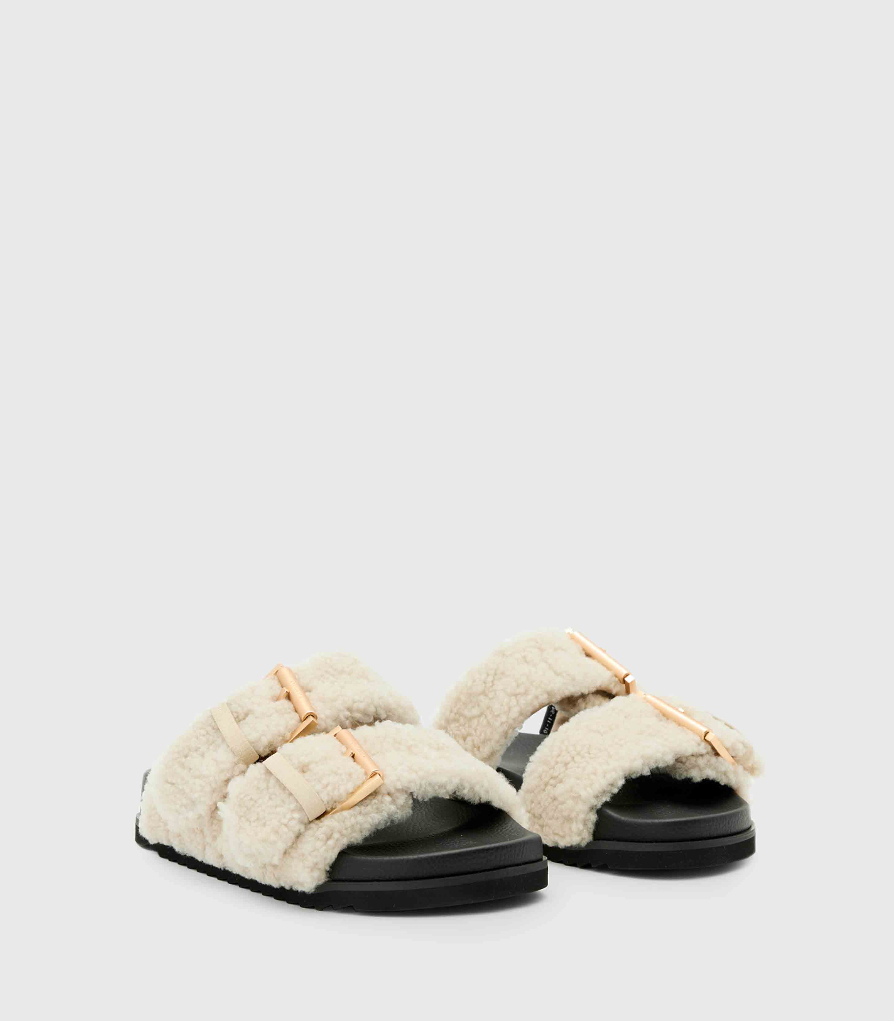 • A thick sole with two chunky straps completed with tonal shearling for a statement look with a cosy feel.