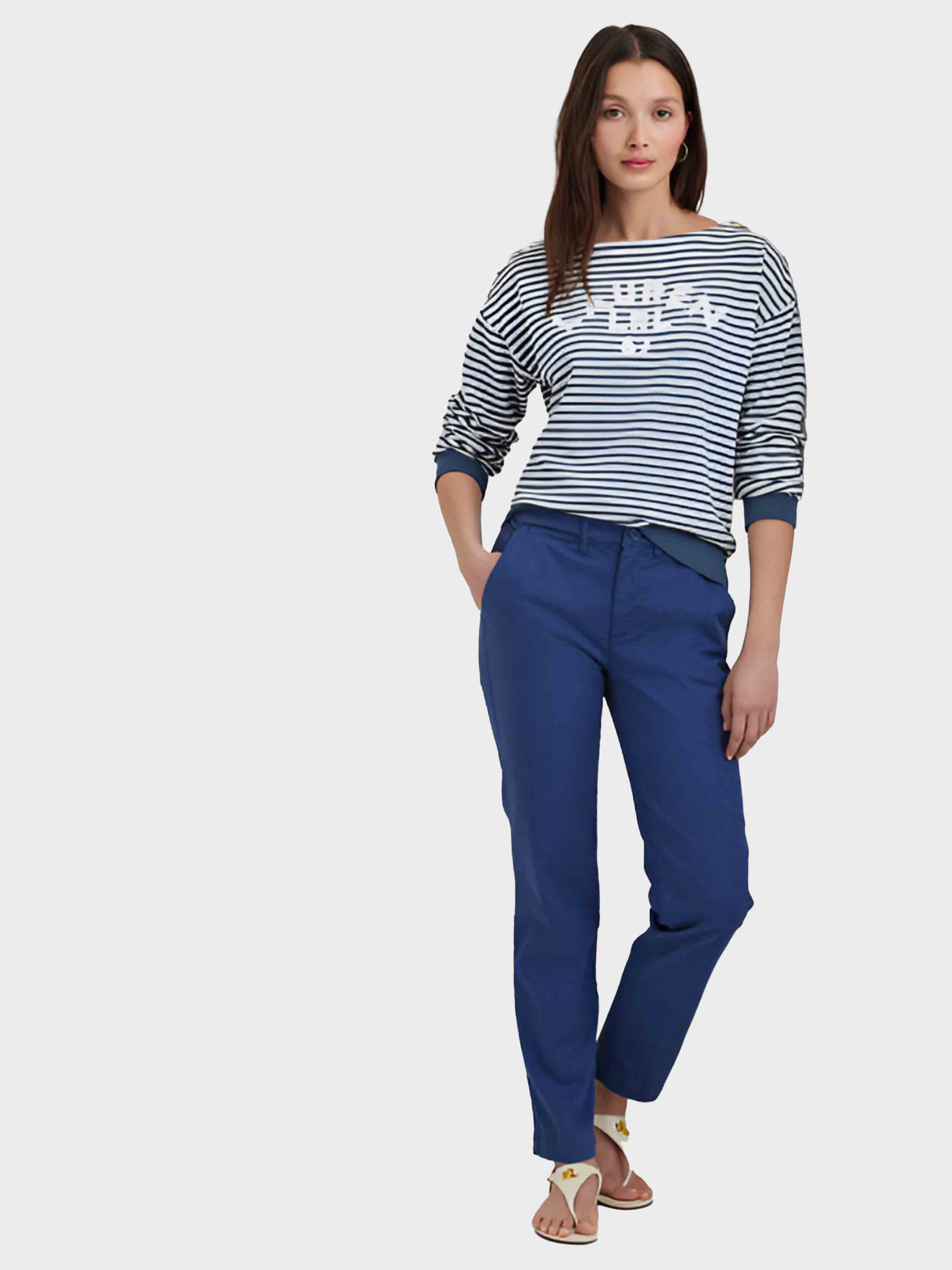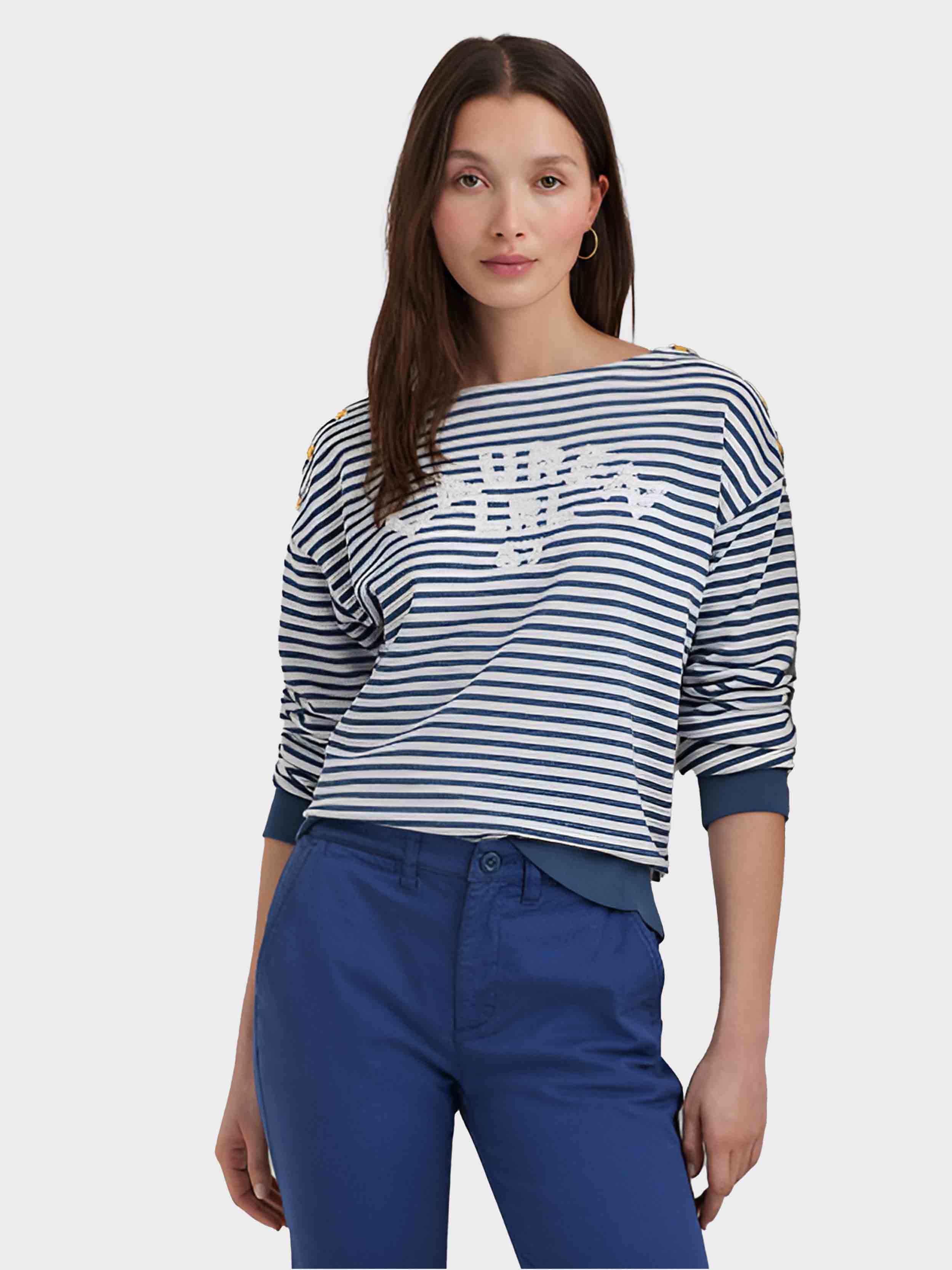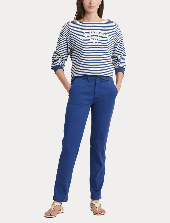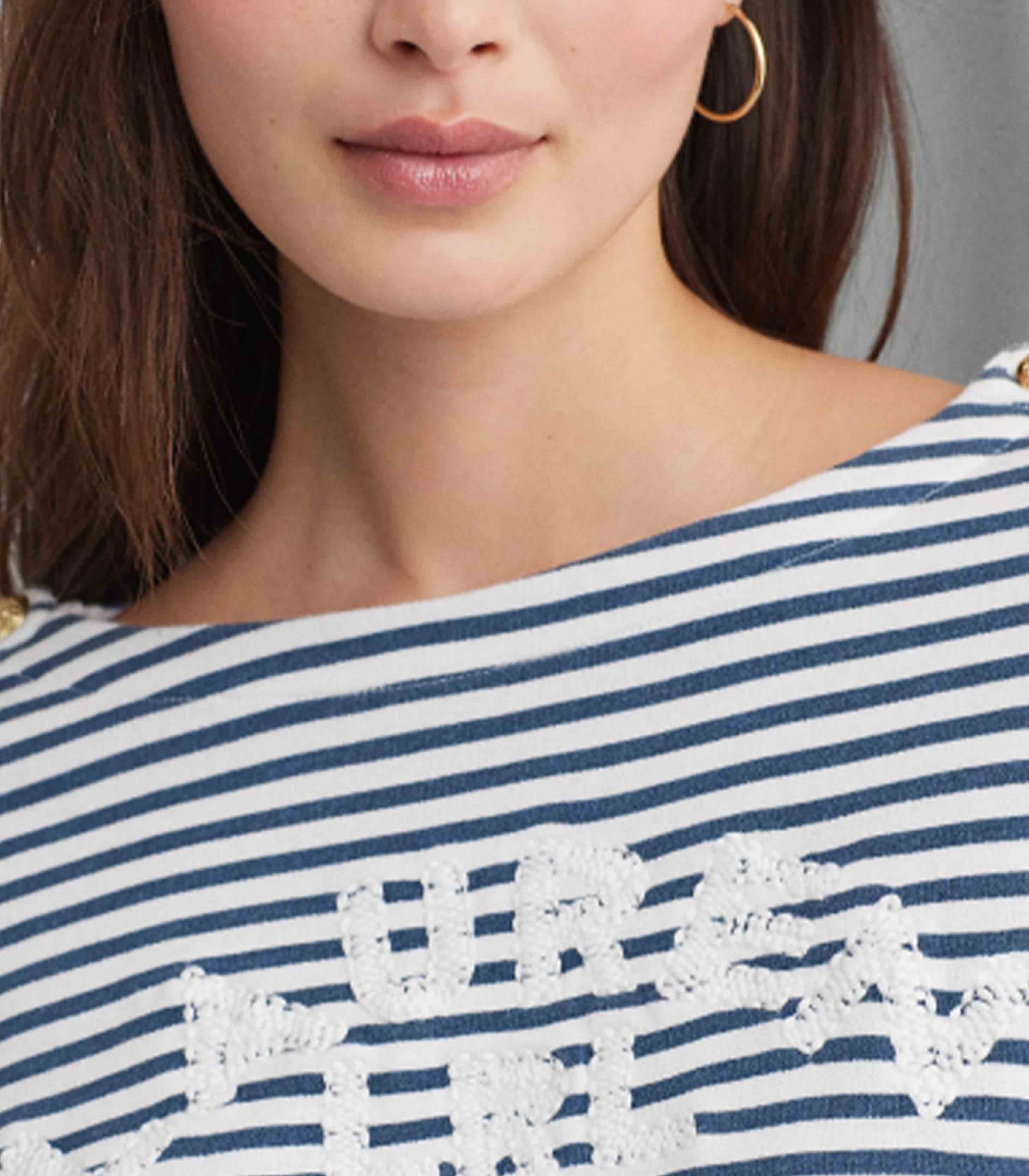 • An oversize embroidered logo at the chest, timeless stripes, and crest-embossed buttons define the nautical-inspired character of this boatneck top, which is crafted with soft French terry for a cozy fit and feel.